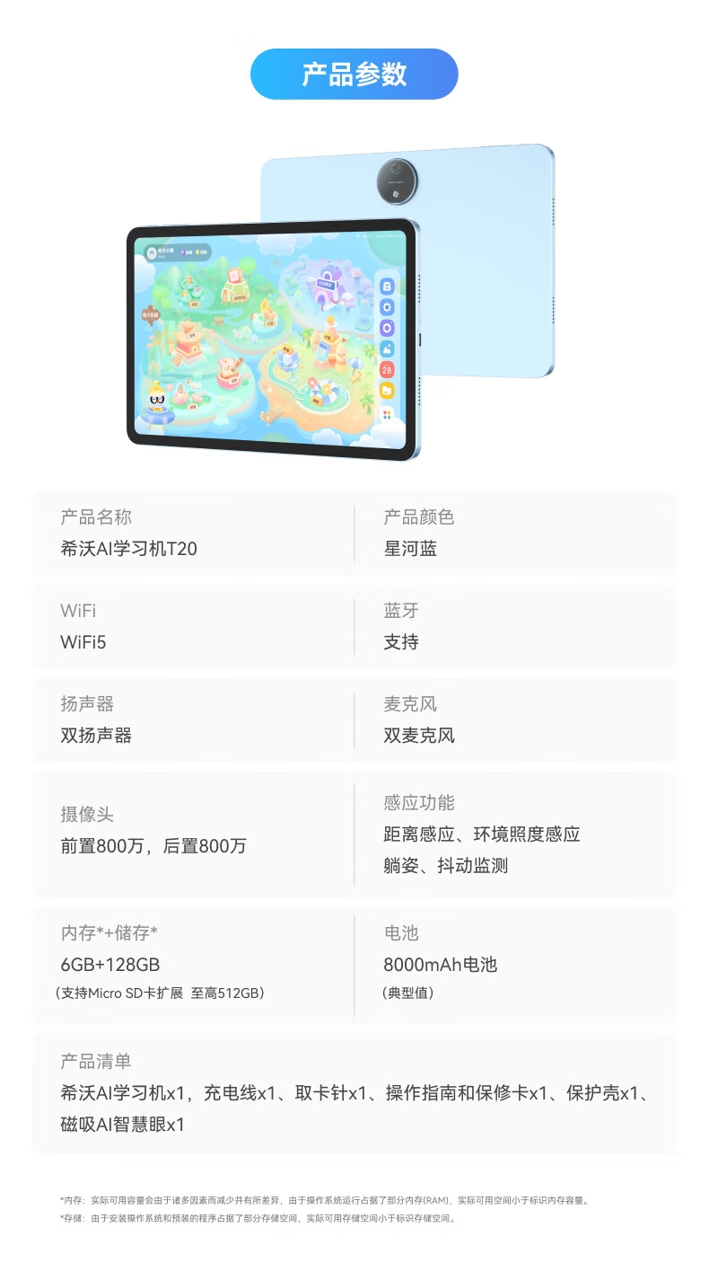 包装清单:希沃学习机T20x1,充电线x1、取卡针x1、操作指南和保修卡x1、保护壳x1、磁吸AI智慧眼x1