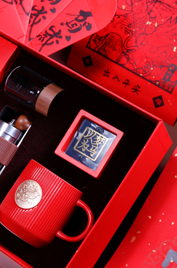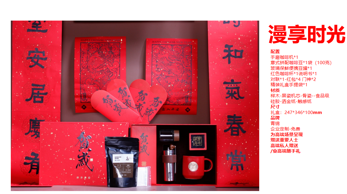 配置:手磨咖啡机*1 意式拼配咖啡豆*1袋(100克) 玻璃保鲜便携豆罐*1 红色咖啡杯*1说明书*1 对联*1-红包*4 门神*2 精装礼盒手提袋*1 材质 榉木-黑瓷机芯-骨瓷--食品级硅胶-洒金纸-触感纸