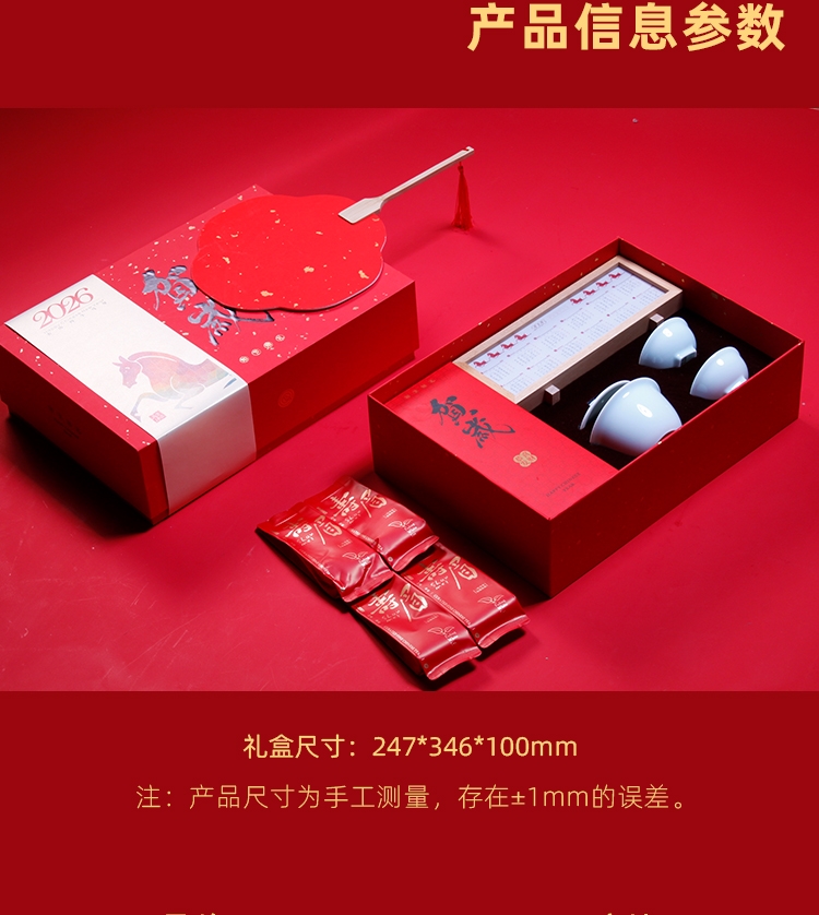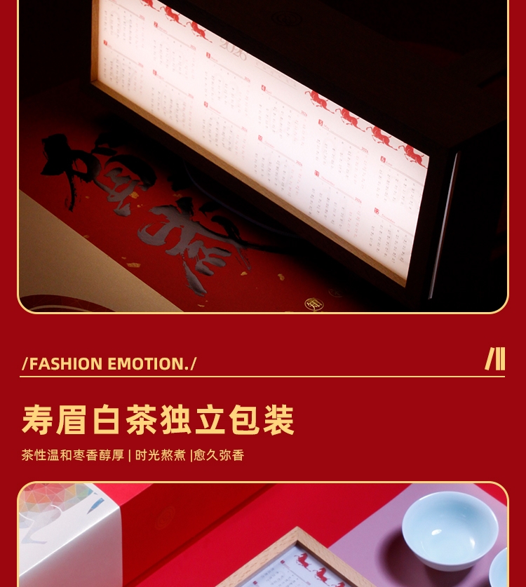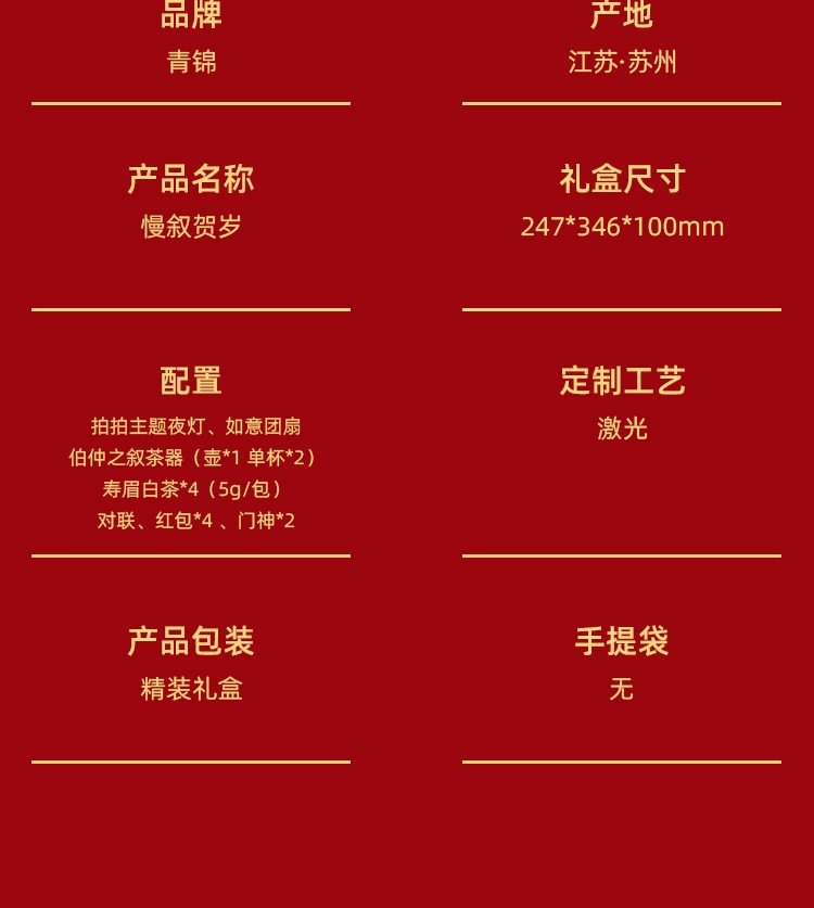 配置:拍拍主题夜灯(可定制画面)*1伯仲之叙茶器一壶*1 单杯*2寿眉白茶*4包对联*1-红包*4 门神*2 如意团扇*1枚精装礼盒手提袋*1