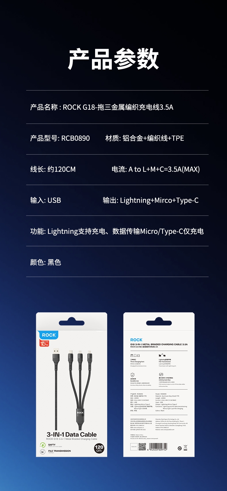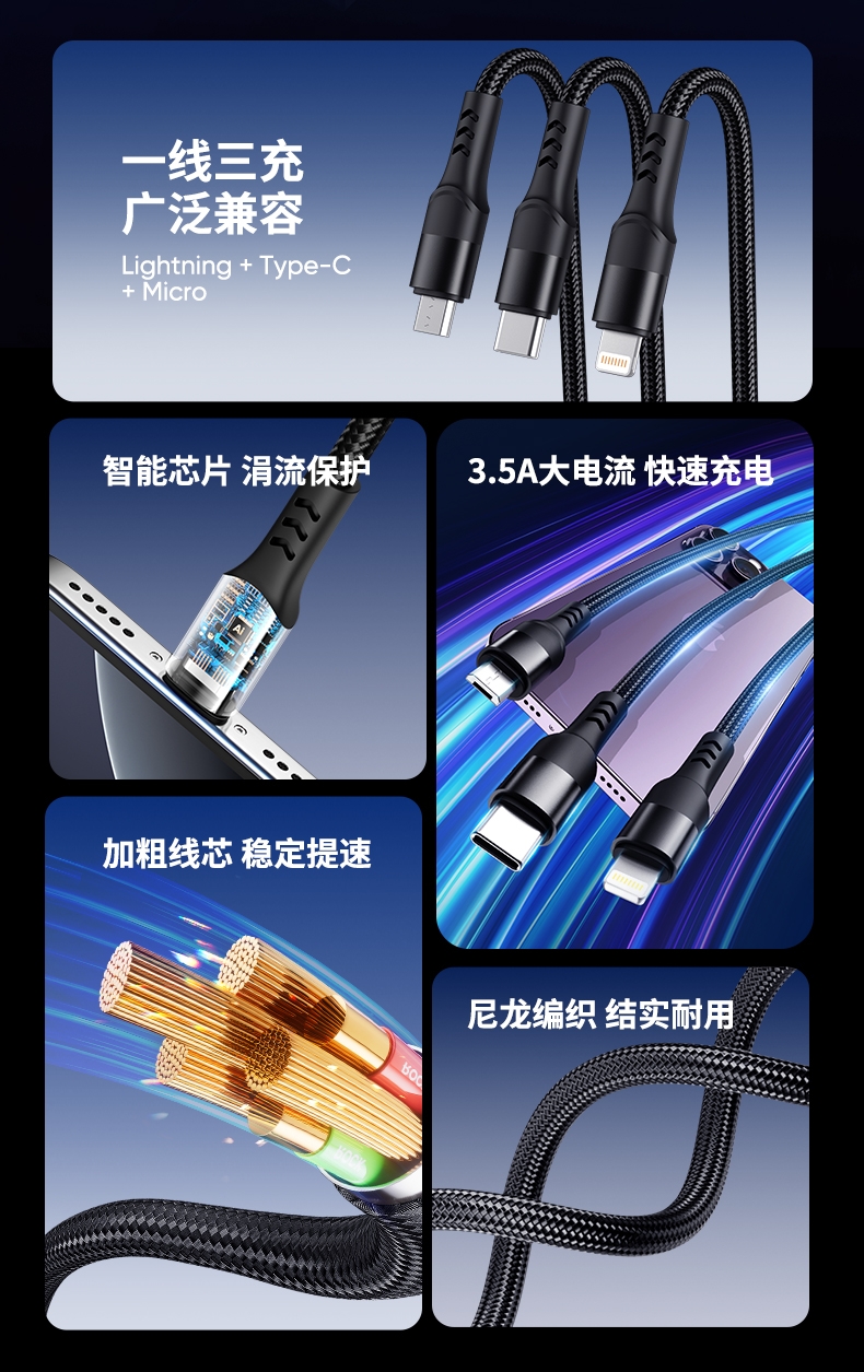一线三充超便捷,多设备不等待;智能芯片,涓流保护;3.5A大电流,快速充电