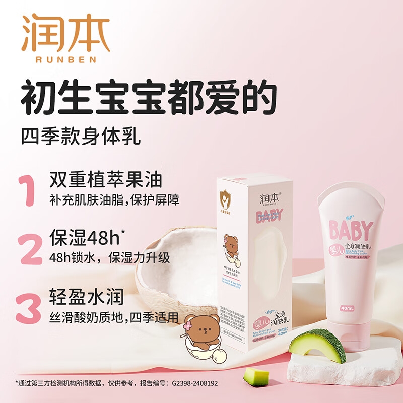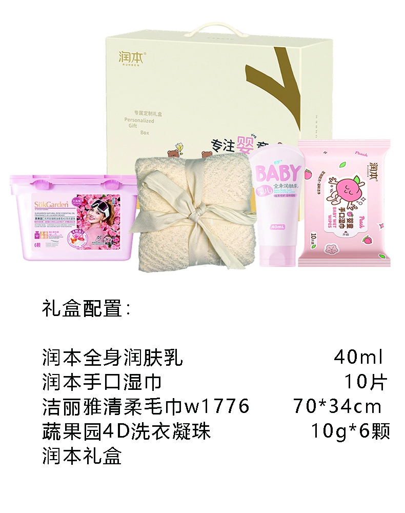 配置清单:润本全身润肤乳40ml*1 润本手口湿巾10片*1 洁丽雅清柔毛巾w1776*1 蔬果园4D洗衣凝珠10g*6颗 润本礼盒*1