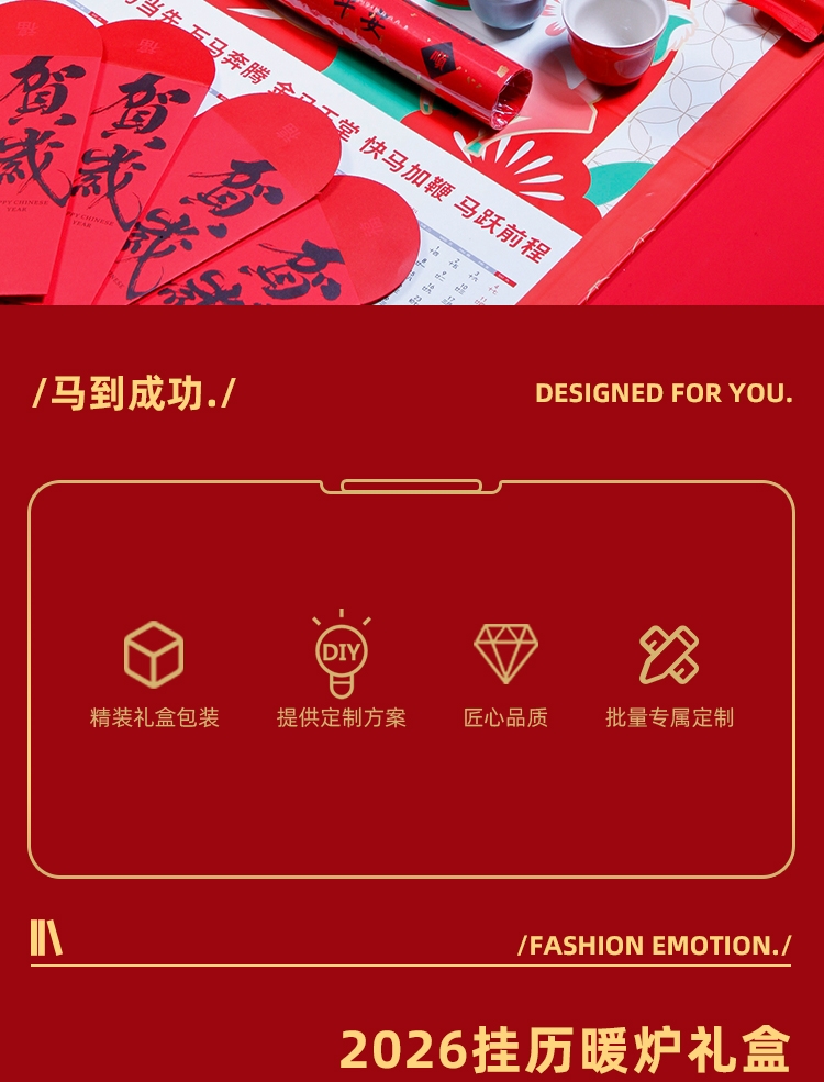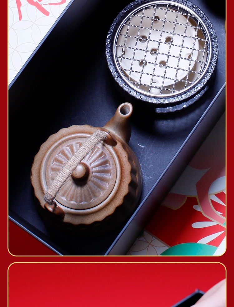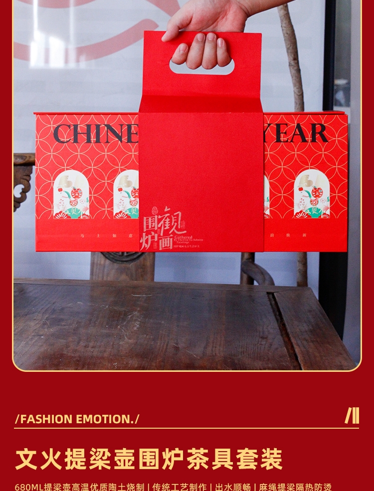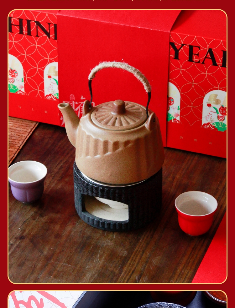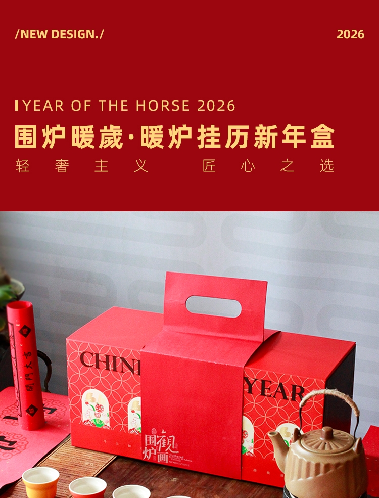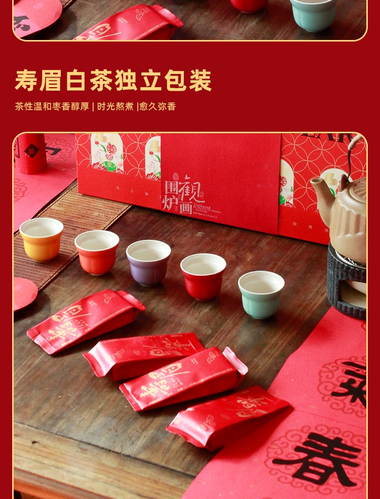 2026挂历暖炉茶壶礼盒,既是包装盒,也是挂历装饰;680ml提梁壶 | 传统工艺制作麻绳提梁隔热防烫;50ml茶杯釉色均匀润泽 | 经典器型 ;寿眉白茶独立包装,对联红包一站式配齐
