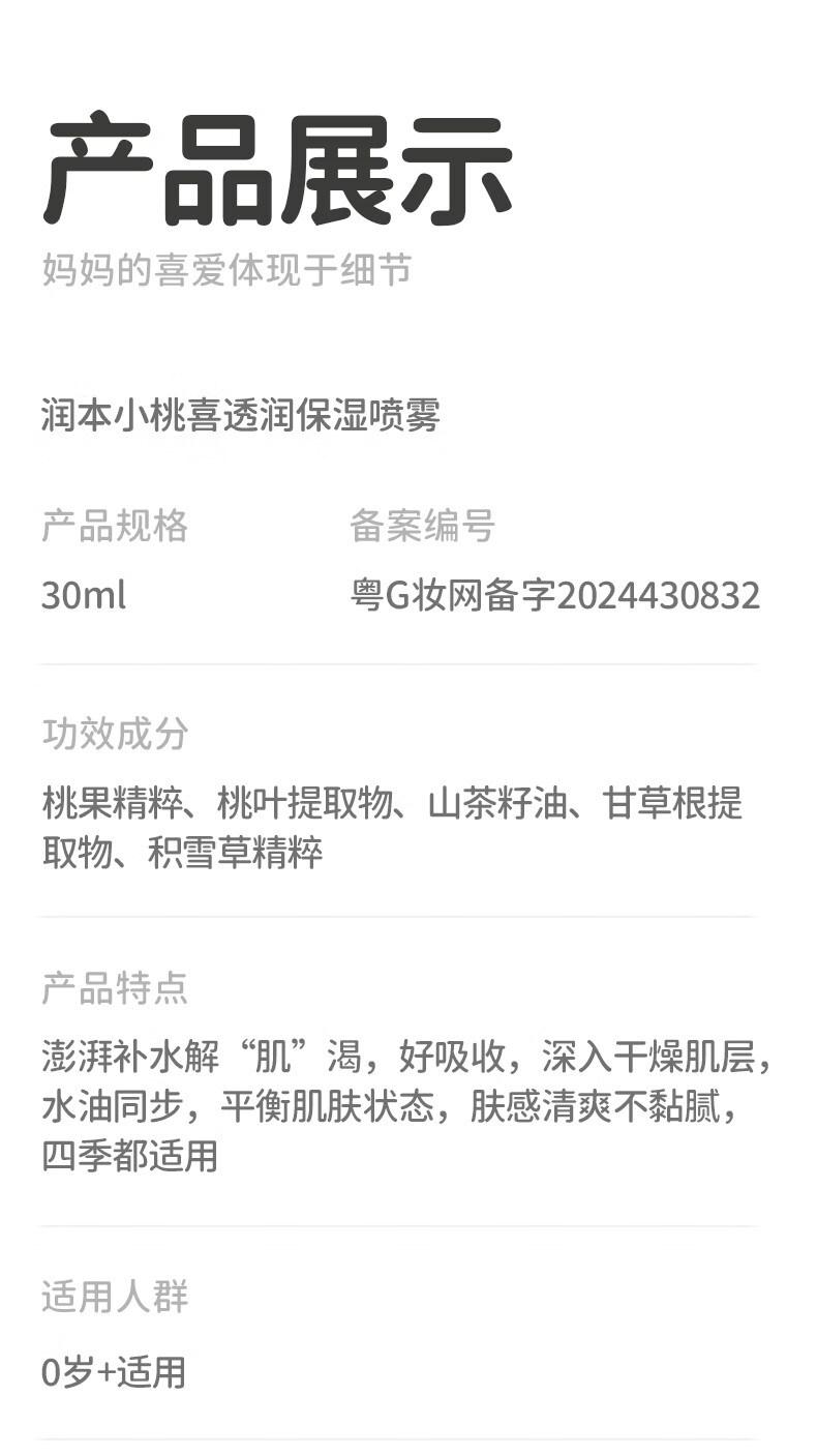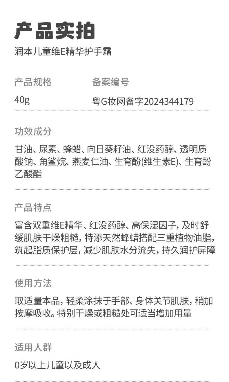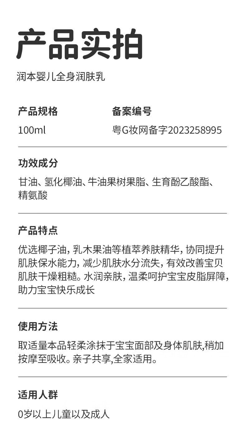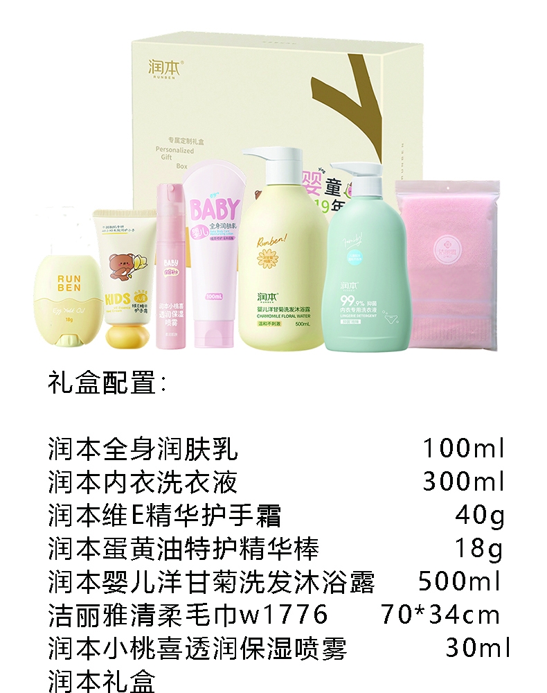 配置清单:润本全身润肤乳100ml*1 润本内衣洗衣液 300ml*1 润本维E精华护手霜 40g*1 润本蛋黄油特护精华棒 18g*1 润本婴儿洋甘菊洗发沐浴露 500ml*1 洁丽雅清柔毛巾w1776 *1 润本小桃喜透润保湿喷雾 30ml*1 润本礼盒*1