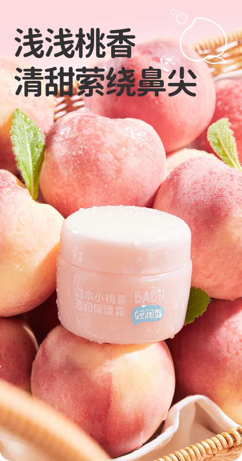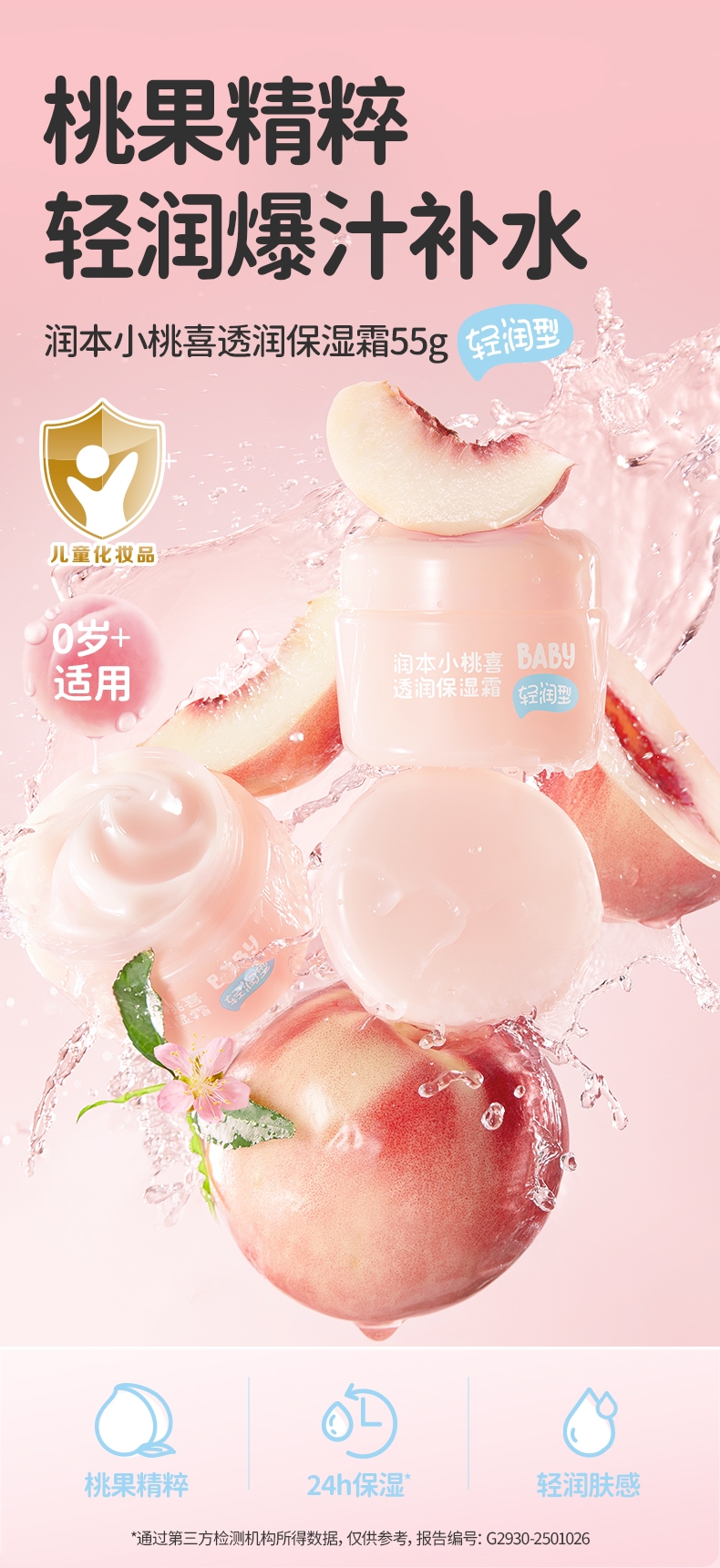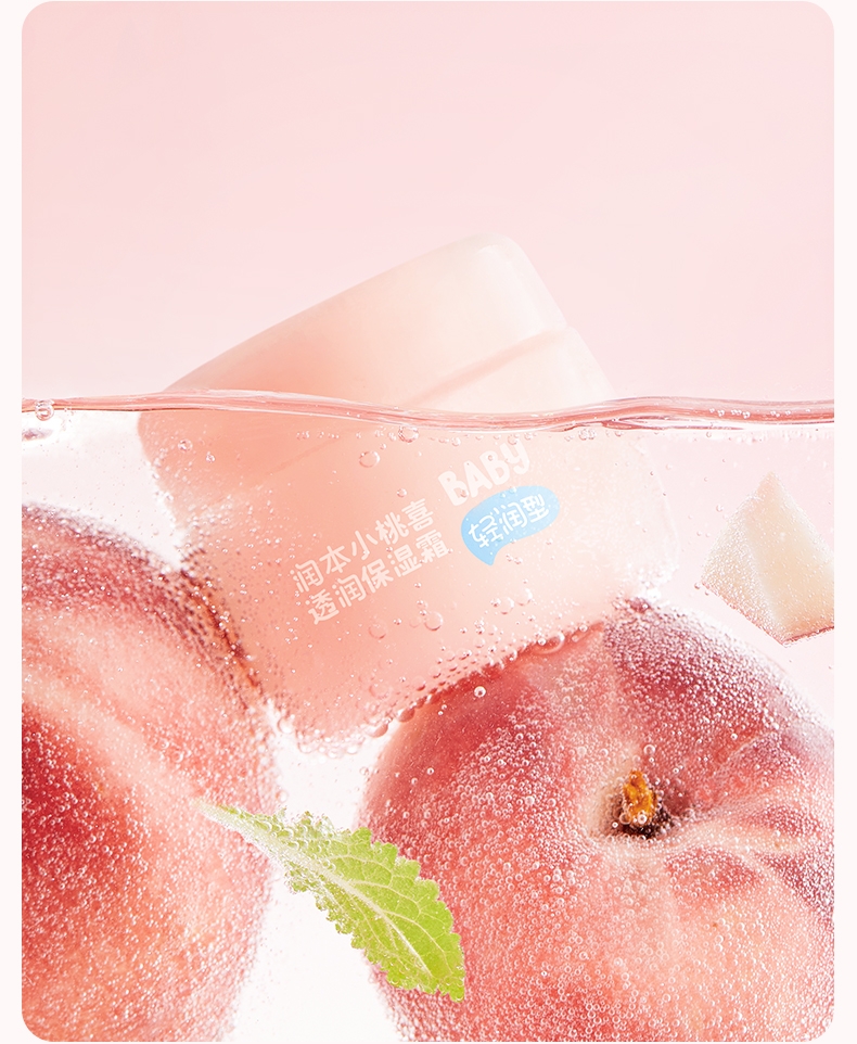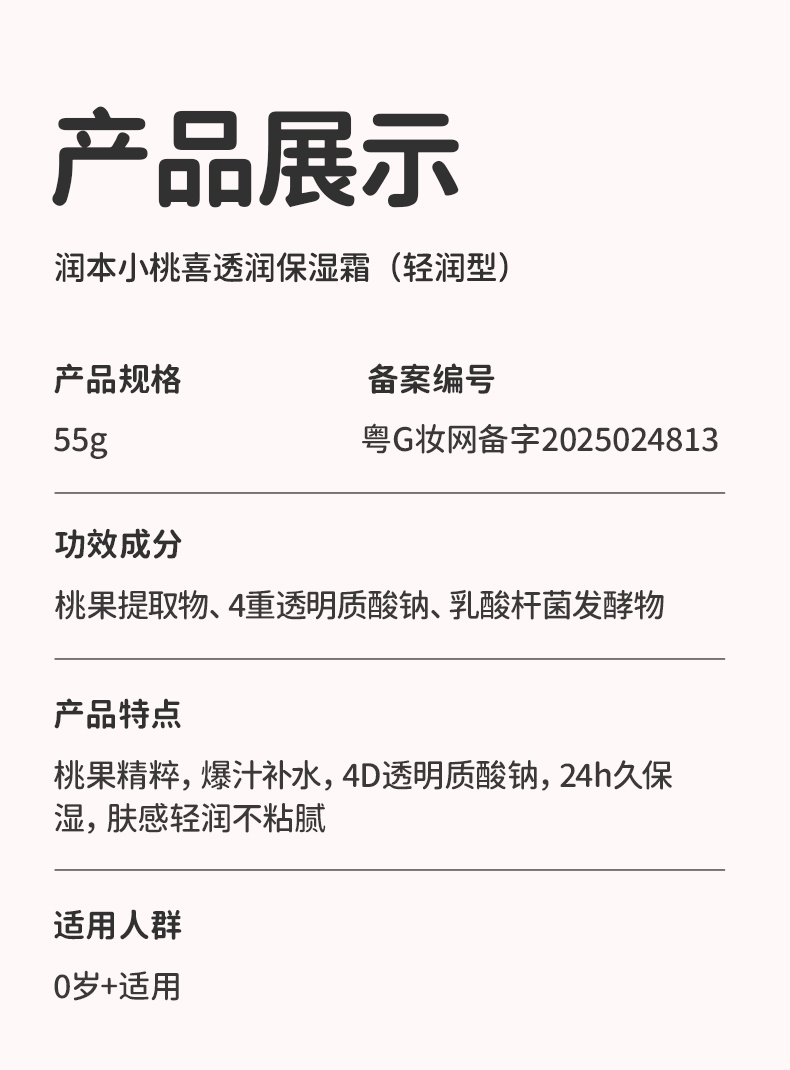 3重补水桃粹,爆汁补水,4D透明质酸钠;24h久保湿,肤感轻润不粘腻,桃果提取物、桃花蕾提;适用人群: 0岁+适用