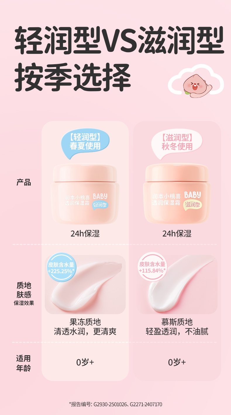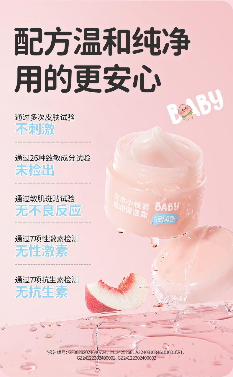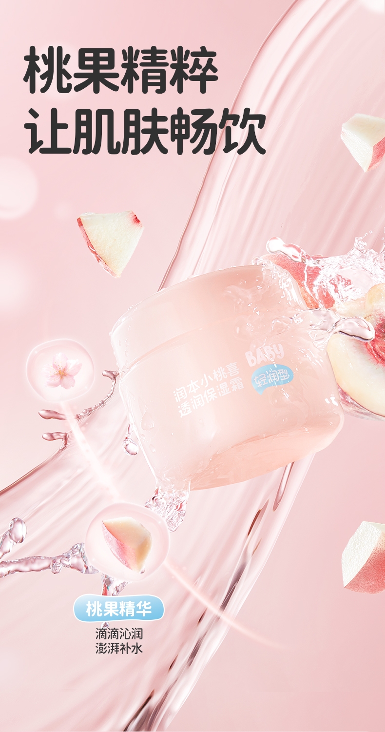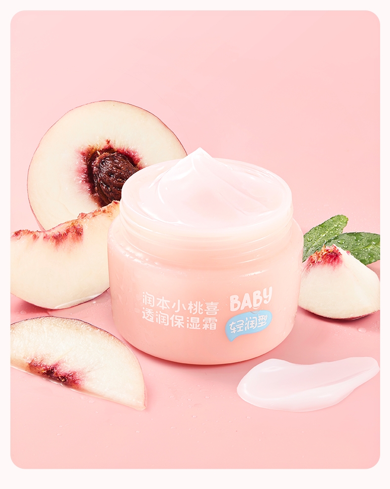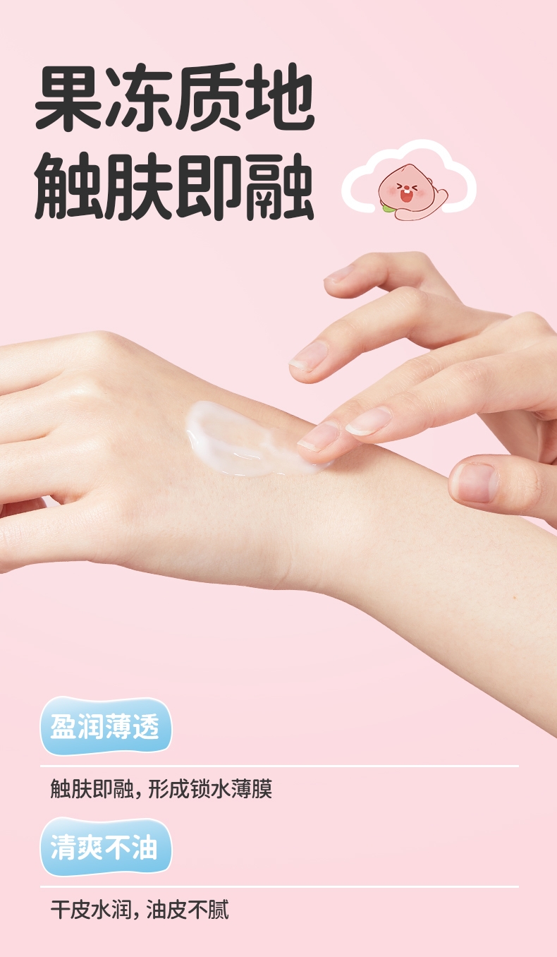 3重补水桃粹,爆汁补水,4D透明质酸钠;24h久保湿,肤感轻润不粘腻,桃果提取物、桃花蕾提;适用人群: 0岁+适用