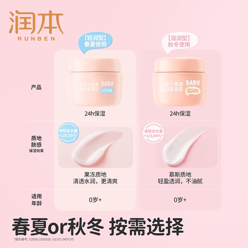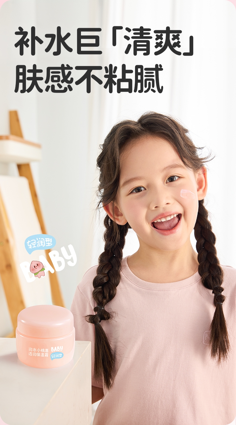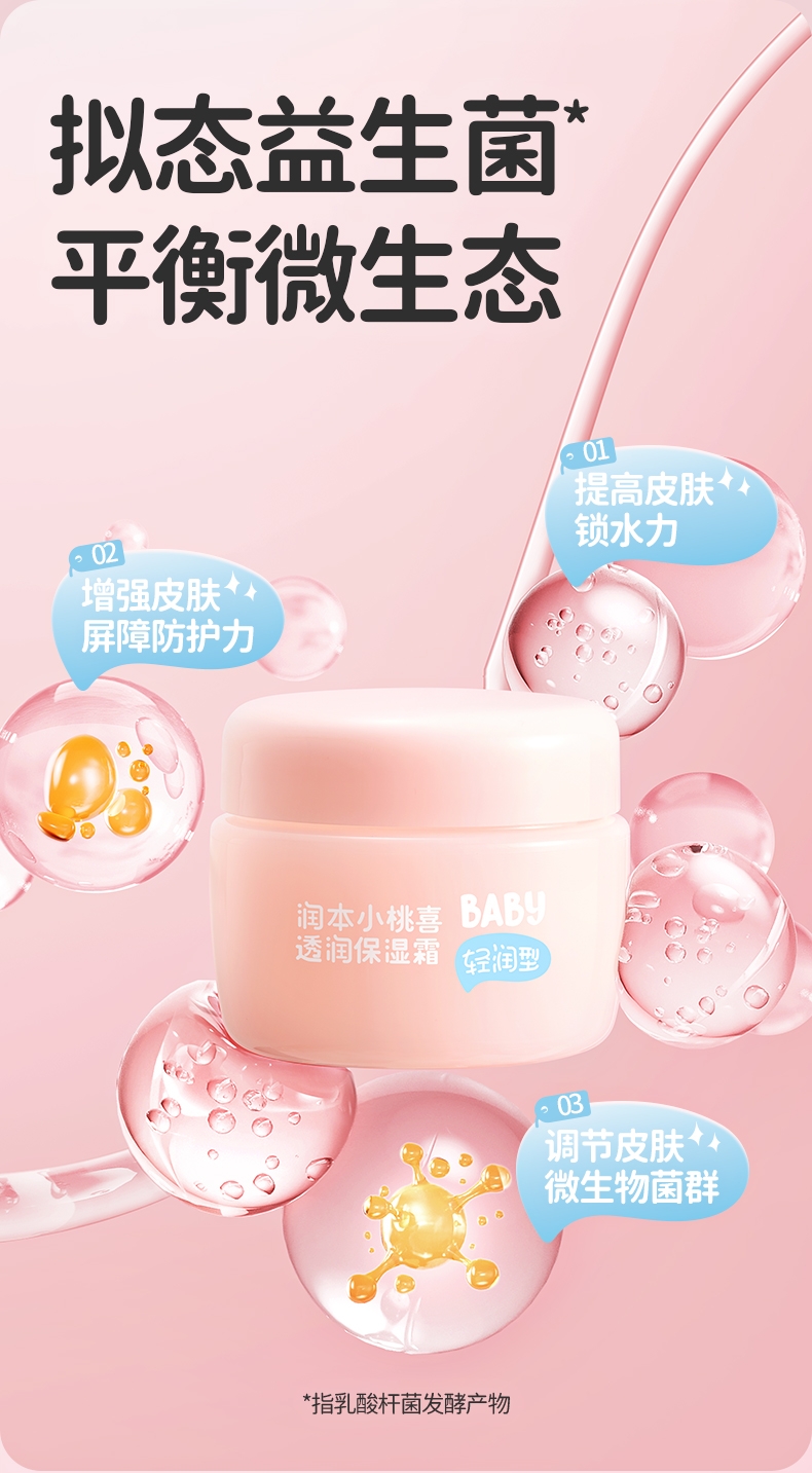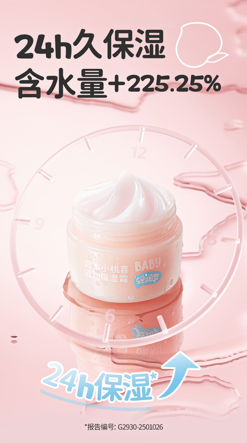 3重补水桃粹,爆汁补水,4D透明质酸钠;24h久保湿,肤感轻润不粘腻,桃果提取物、桃花蕾提;适用人群: 0岁+适用
