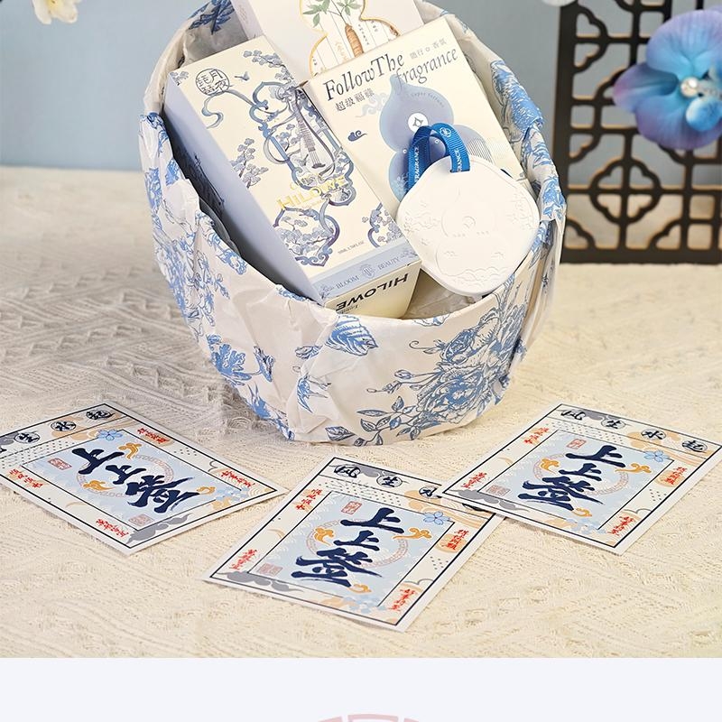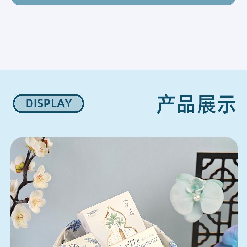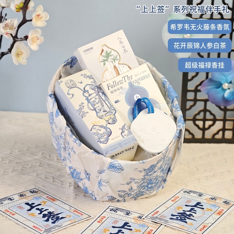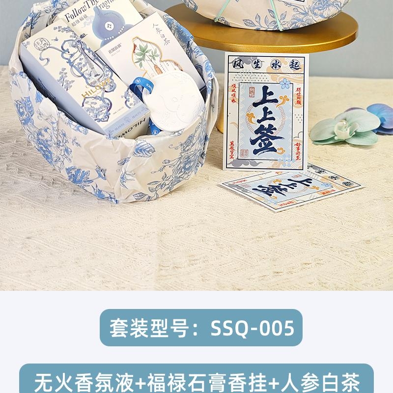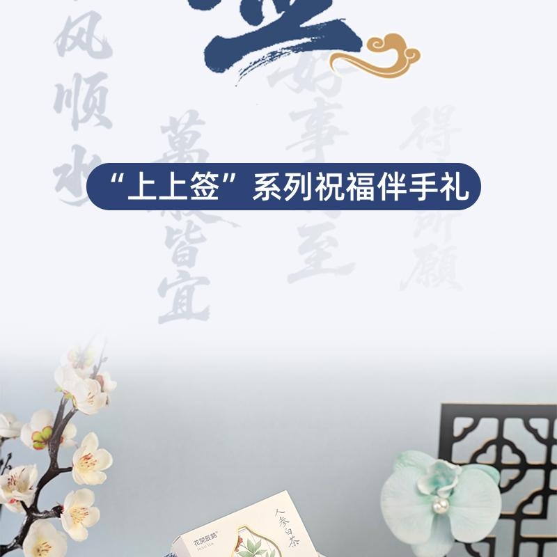 配置:福禄石膏香挂、希罗韦无火香氛液50ML、花开辰锦人参白茶5克*2袋、古风绑绳礼盒+上上签贺卡