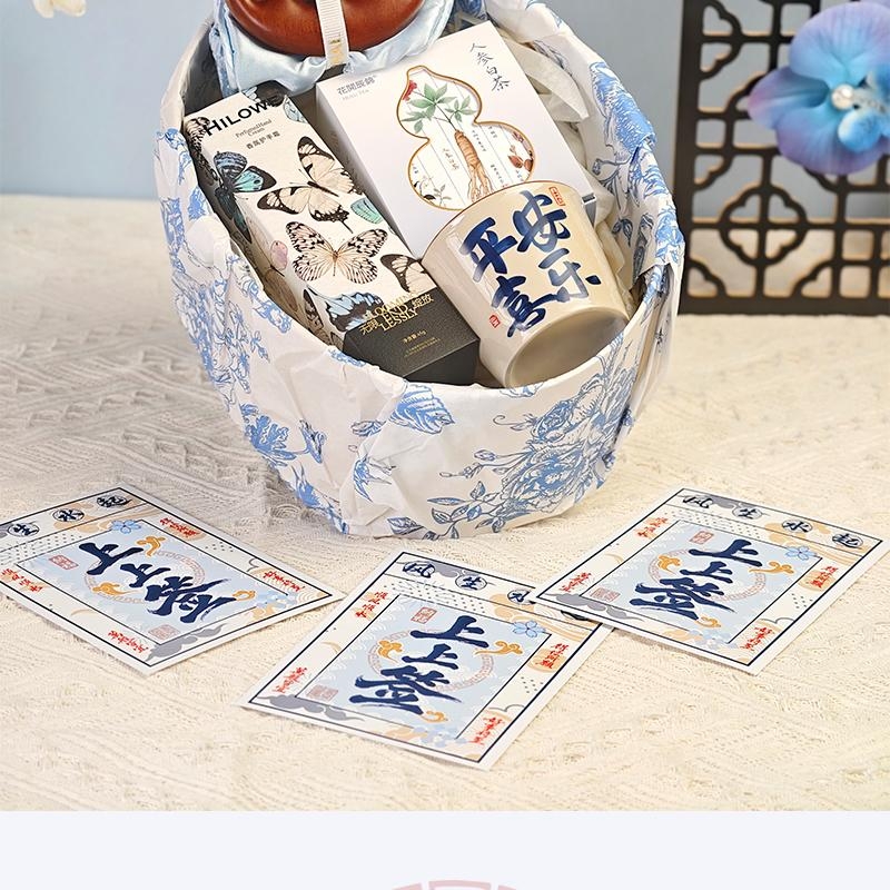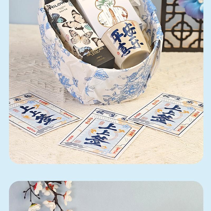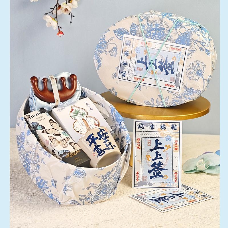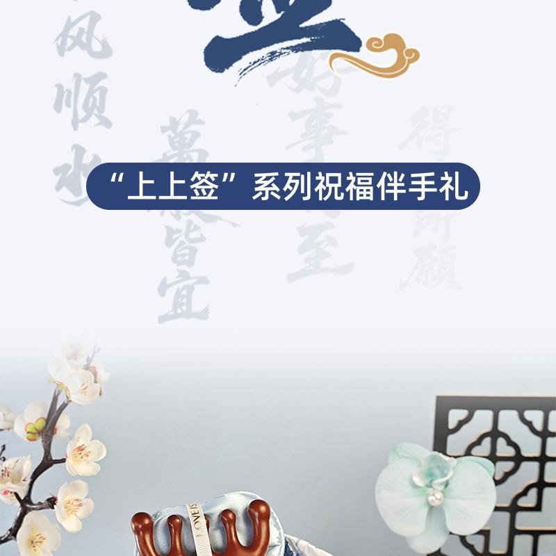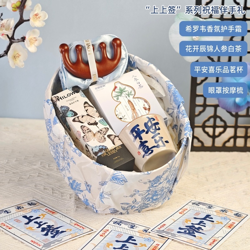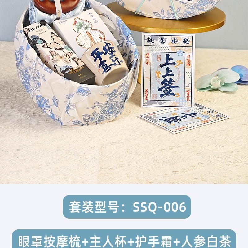 配置:眼罩按摩梳、喜乐主人杯、希罗韦香氛护手霜45克、花开辰锦人参白茶5克*2袋、古风绑绳礼盒+上上签贺卡