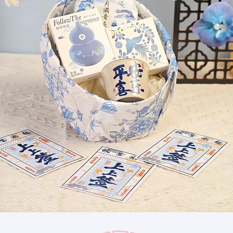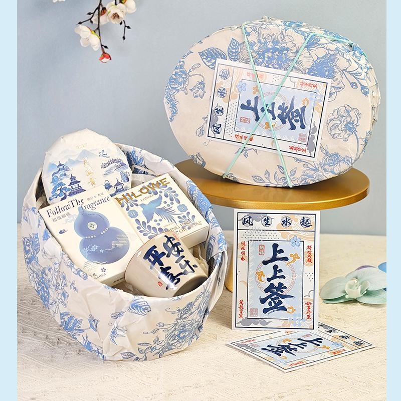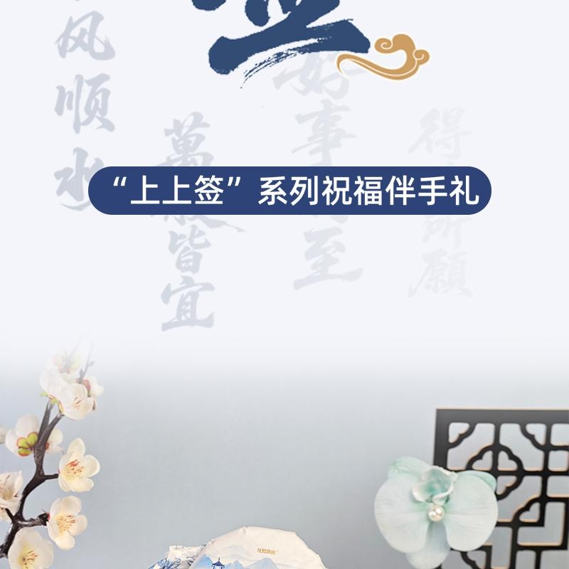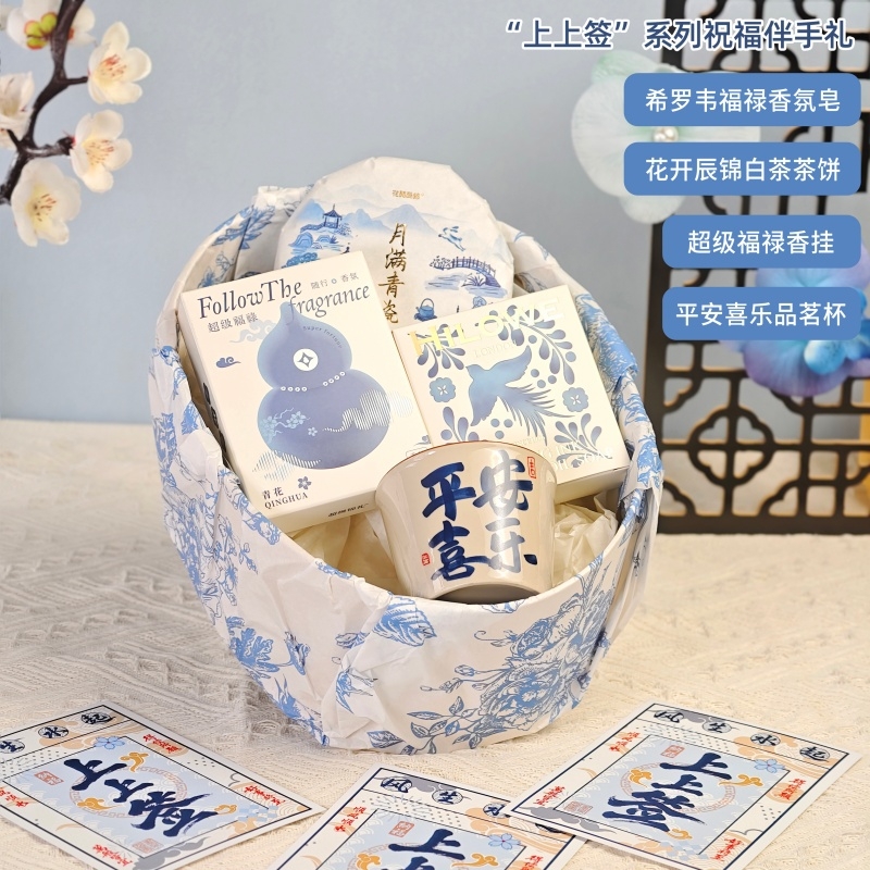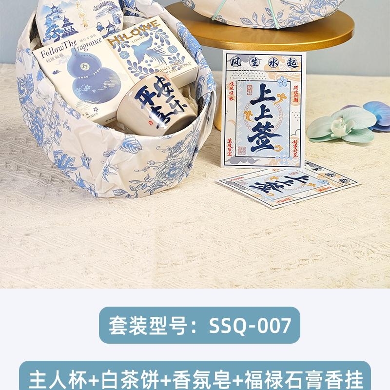 配置:喜乐主人杯、福禄石膏香挂、希罗韦香氛皂80克、花开辰锦月满青瓷白茶饼50克、古风绑绳礼盒+上上签贺卡