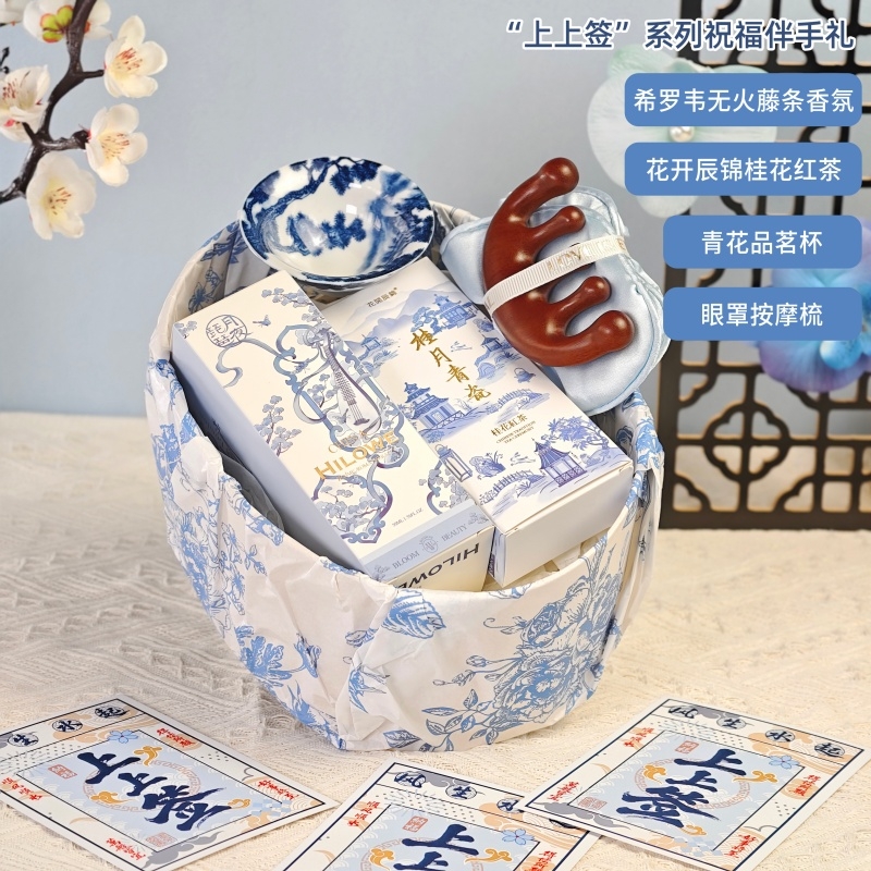 配置:青花主人杯、眼罩按摩梳、花开辰锦桂花红茶10克、希罗韦无火香氛液50ML、古风绑绳礼盒+上上签贺卡