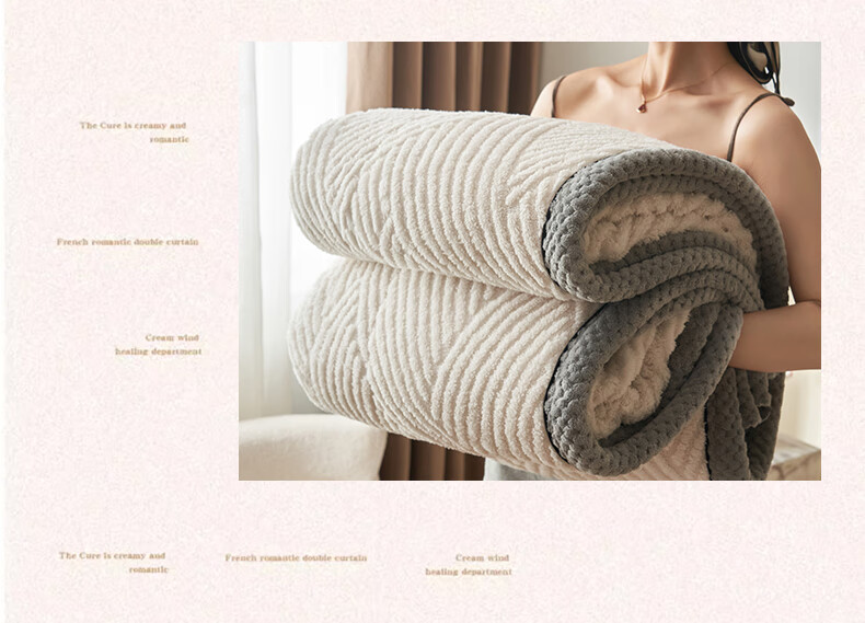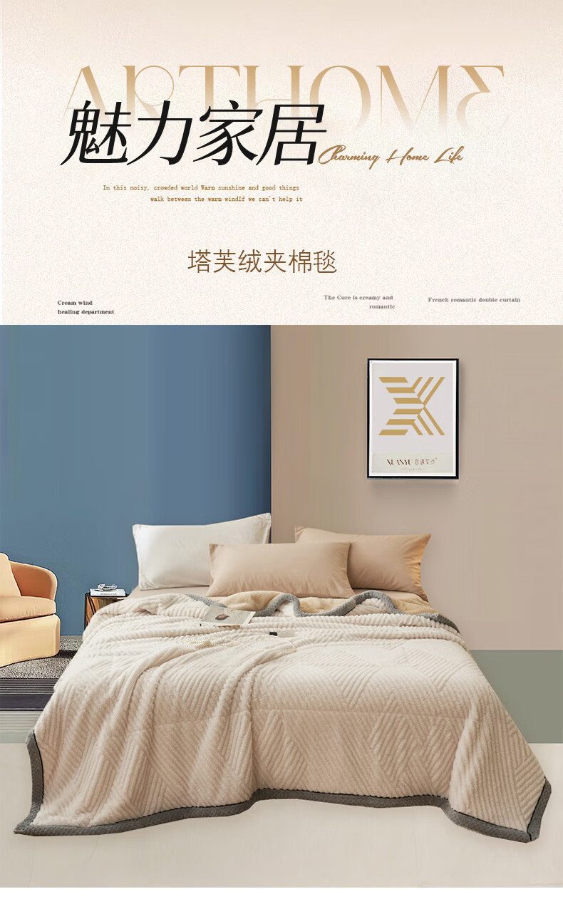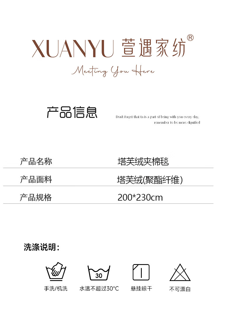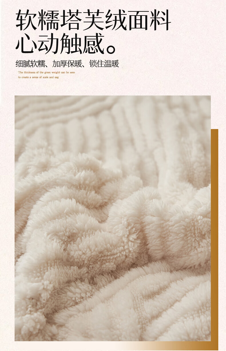 采用高密度纤柔细腻的塔芙绒加微量导电纤维工艺;保暖性强.光泽度好,体感舒适;成品如婴儿般手感柔和,宠溺每一寸肌肤;