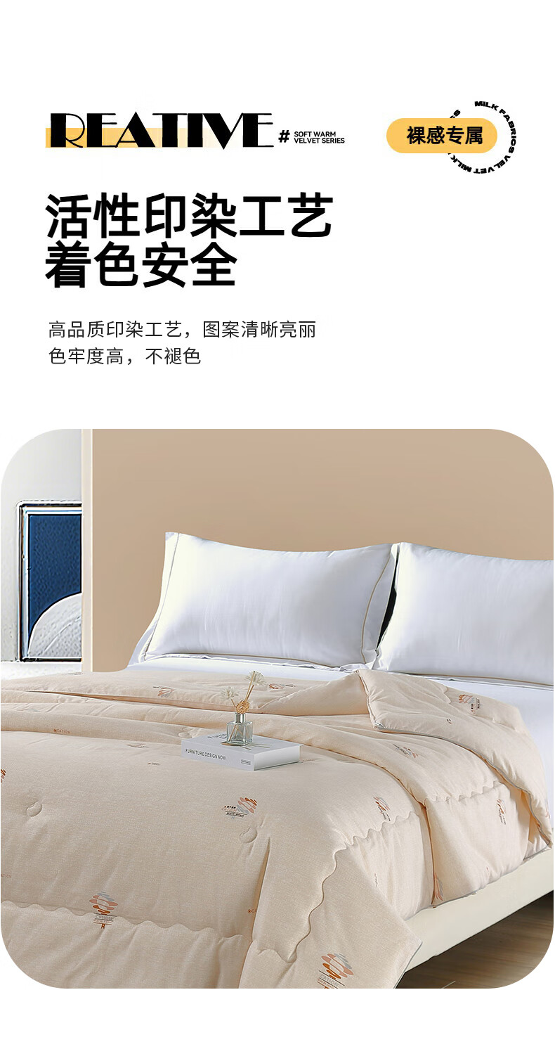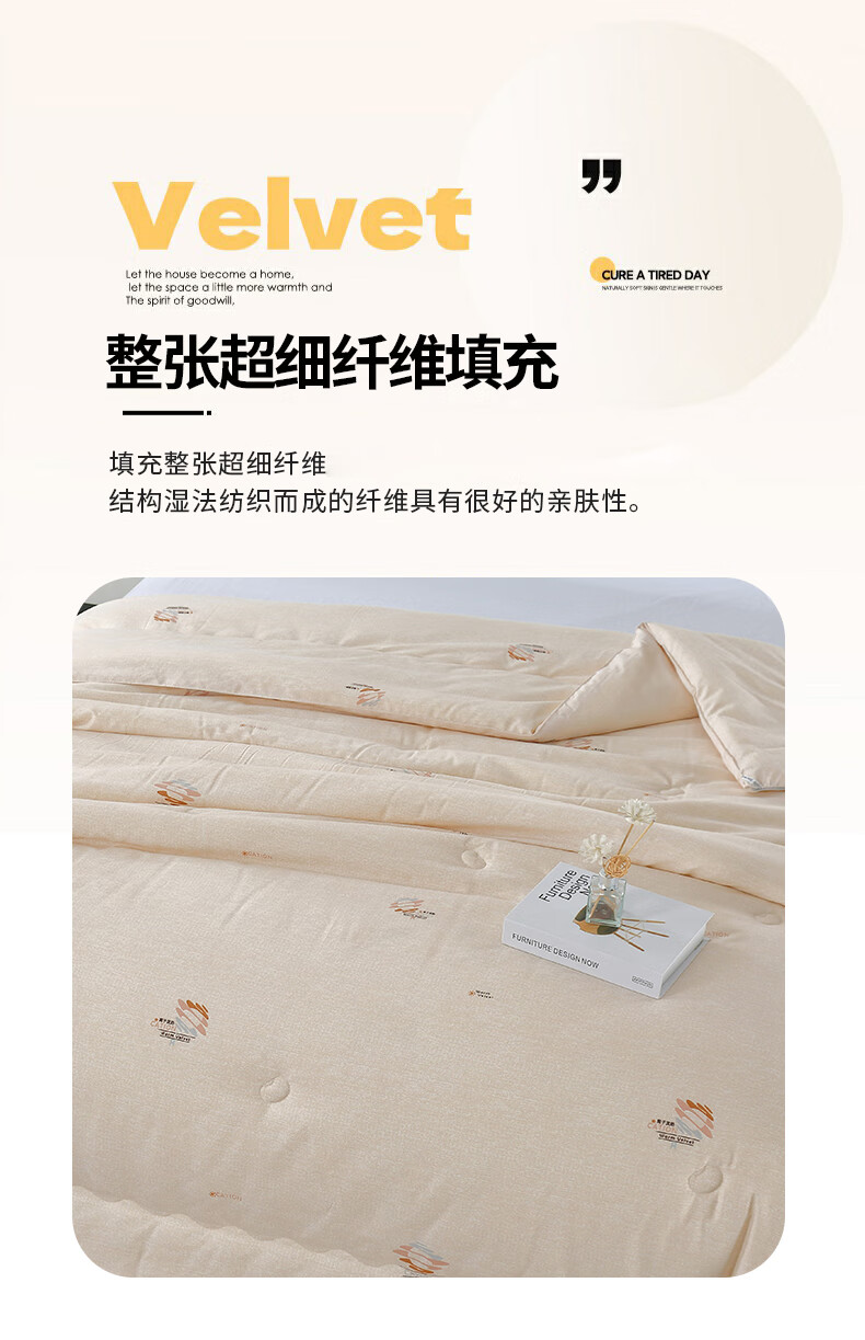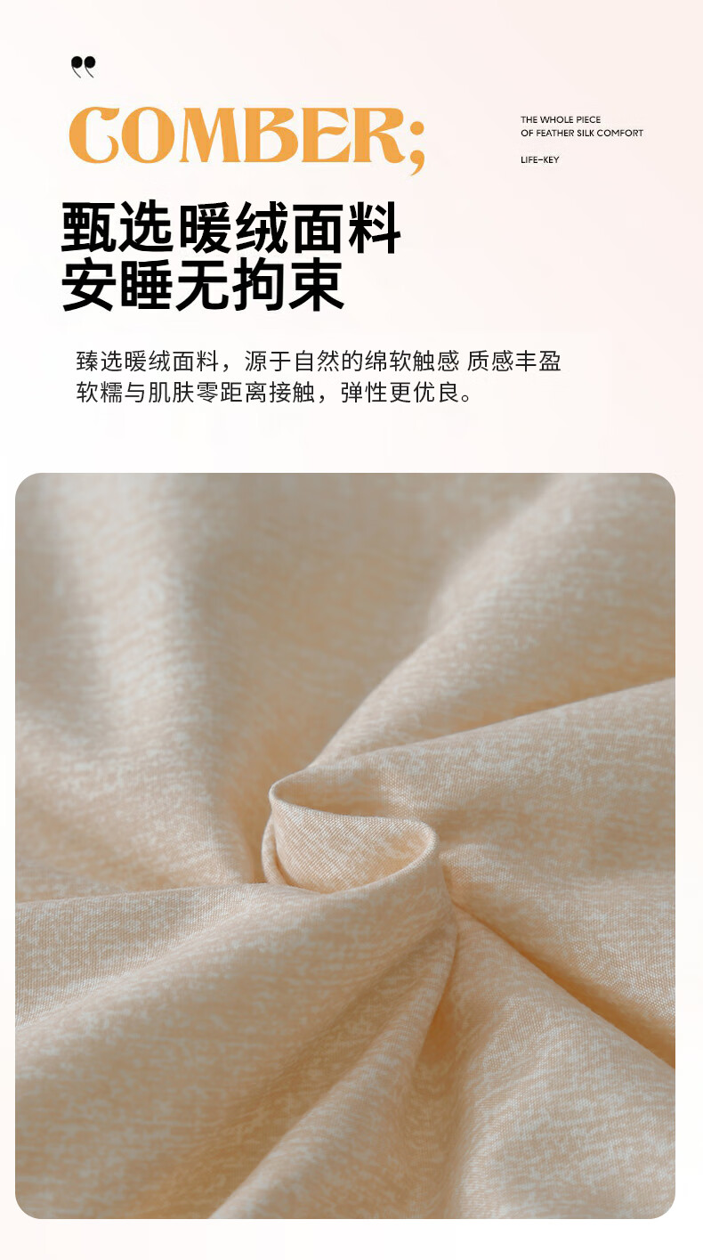 臻选暖绒面料,源于自然的绵软触感;质感丰盈软糯与肌肤零距离接触,弹性更优良。;填充整张超细纤维适合肌肤敏感人群