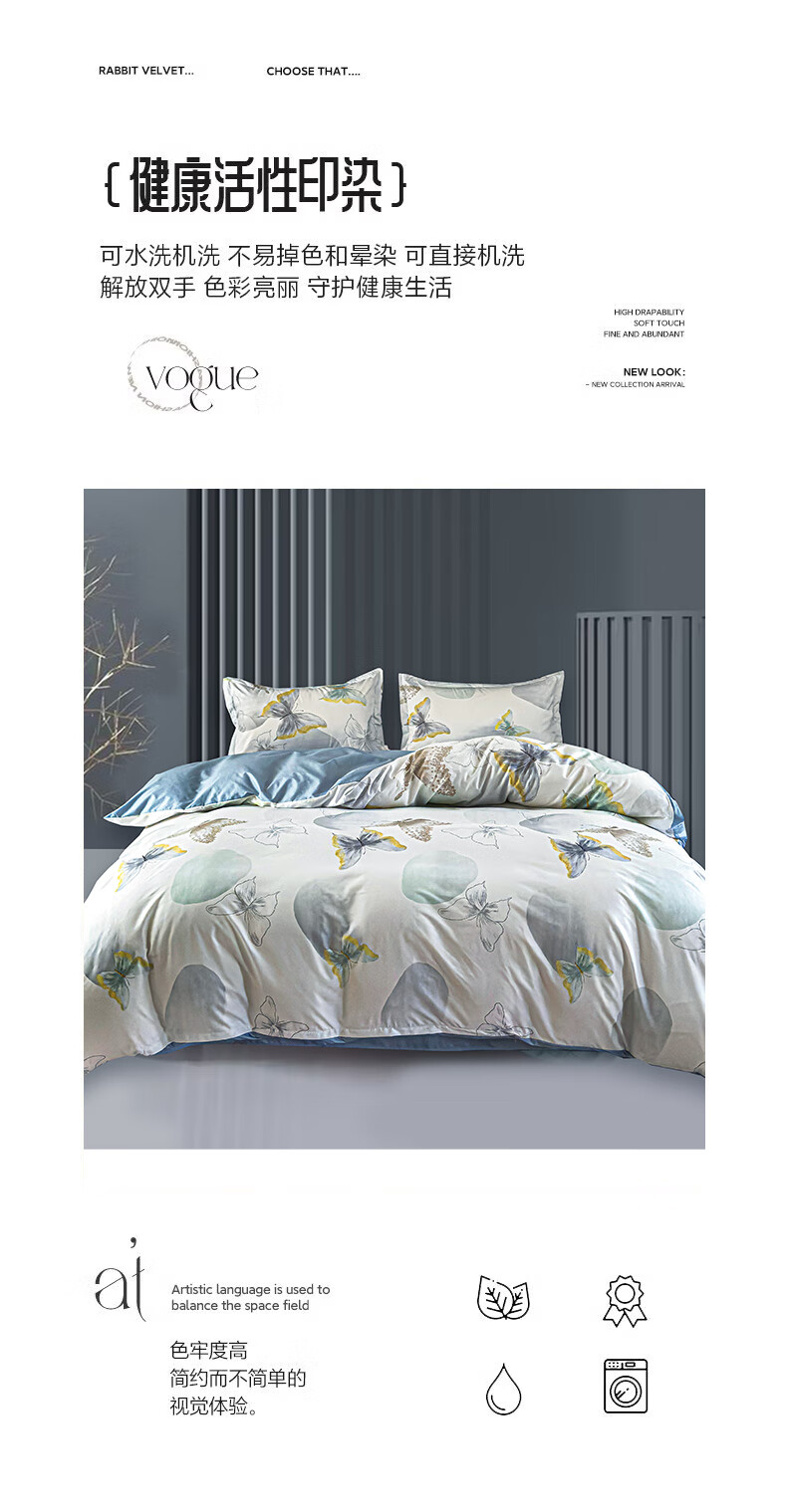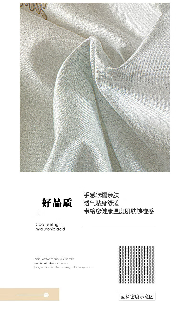 面料采用生态亲肤棉,新型环保浆料活性印染;生态棉面料,手感柔软,舒适质感丰厚;色彩丰富自然,阵线细致密实,错落有序,更显档次