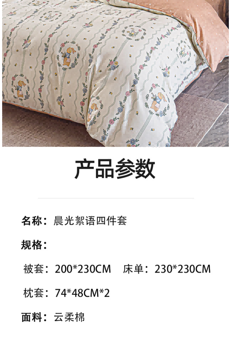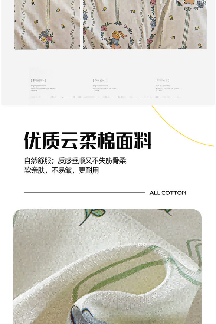 优选云柔棉面料;手感柔软,舒适质感丰厚;不褪色,不缩水,,容易打理