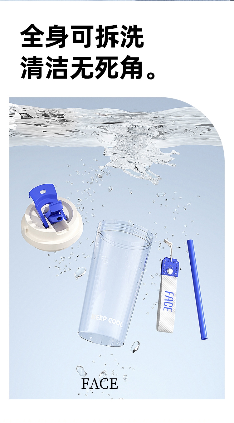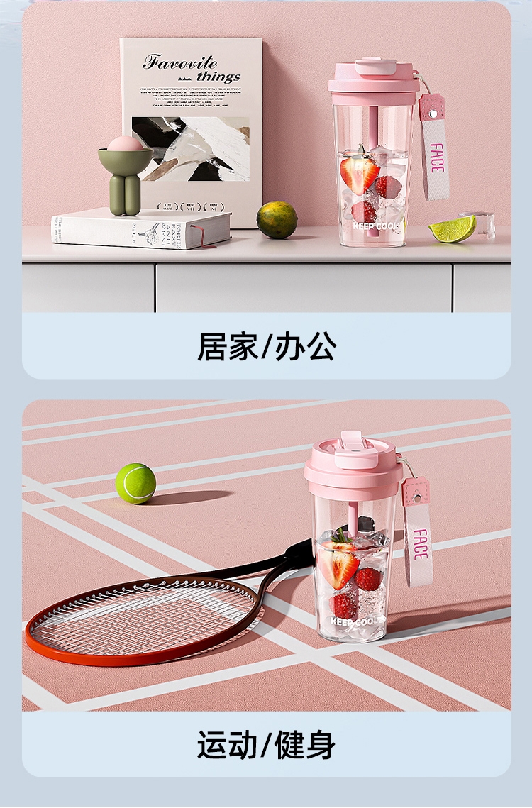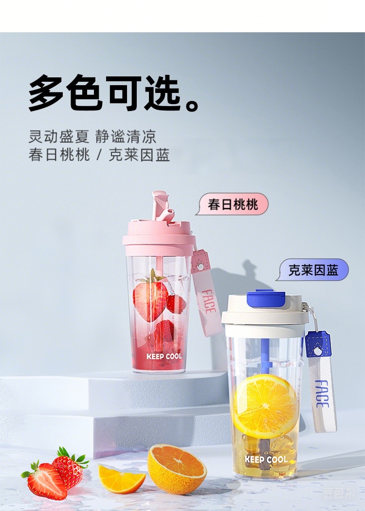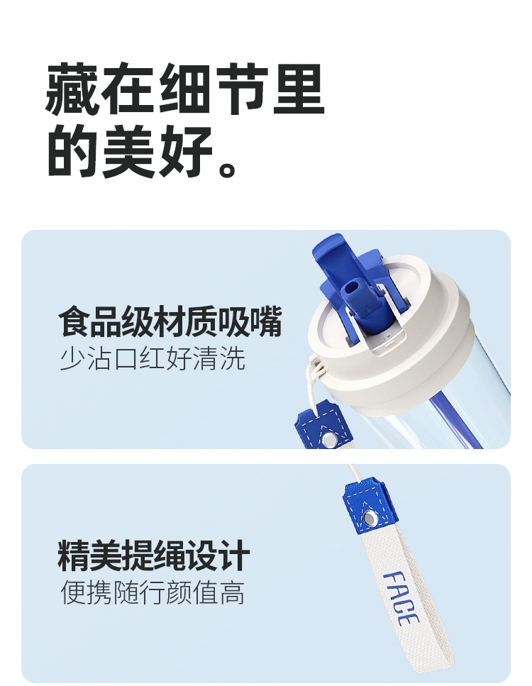 可拧盖畅饮,也可直饮口饮用,随心切换;食品级PP杯盖,吸饮更安心;尼龙手提绳,轻松拎提