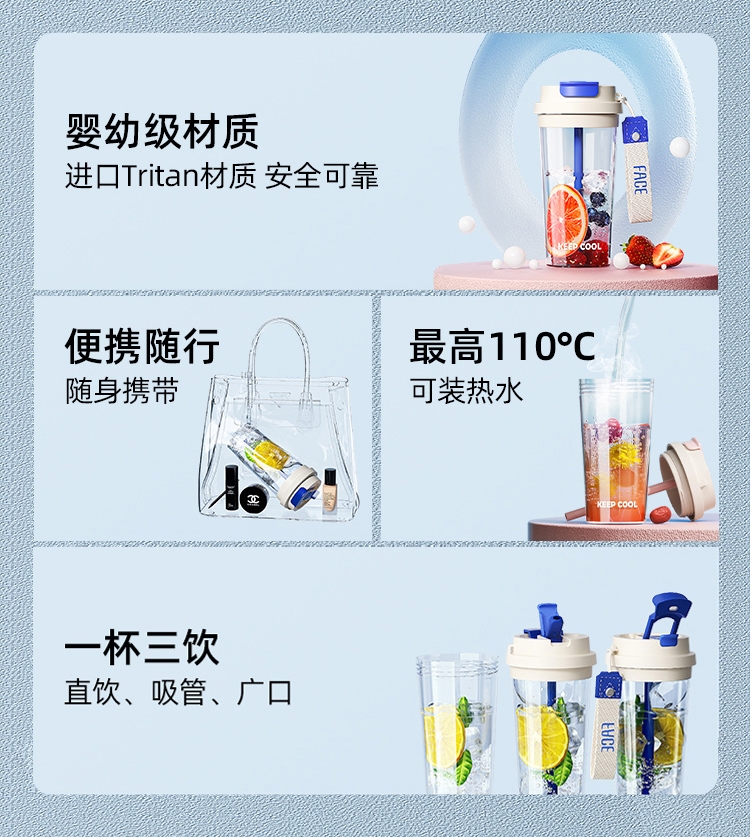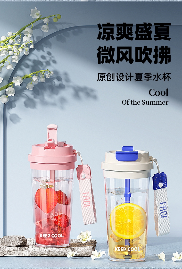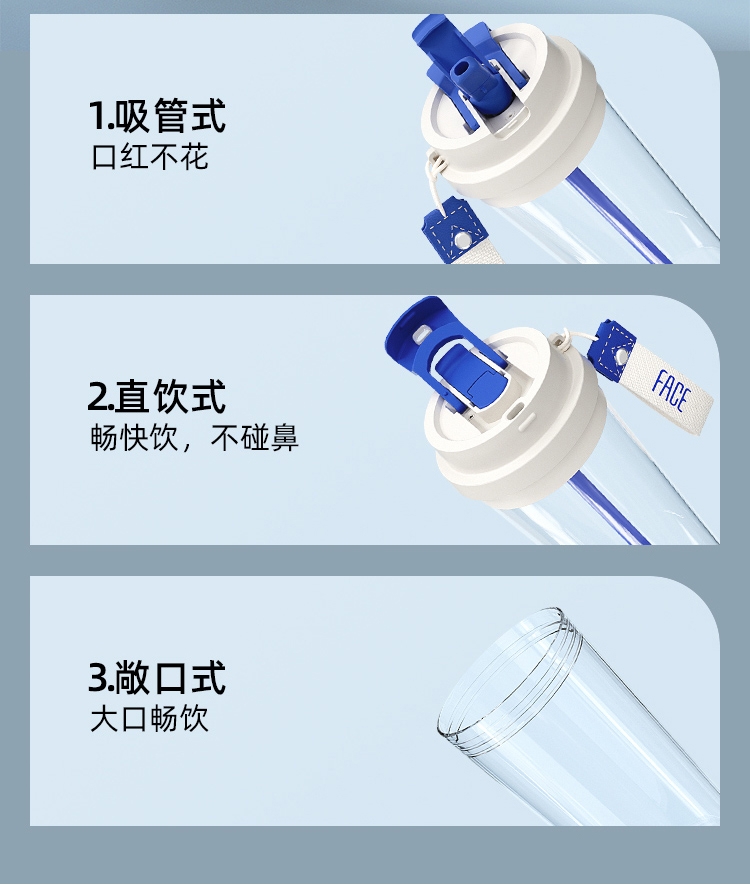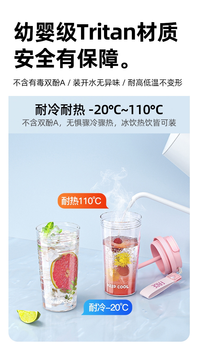 可拧盖畅饮,也可直饮口饮用,随心切换;食品级PP杯盖,吸饮更安心;尼龙手提绳,轻松拎提