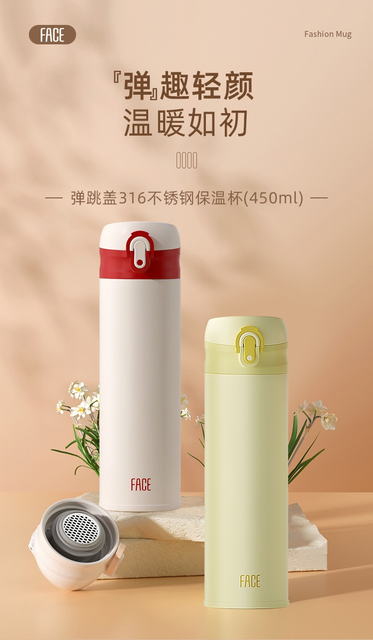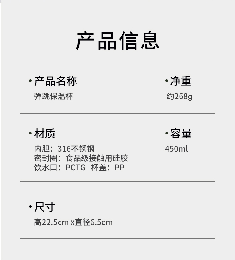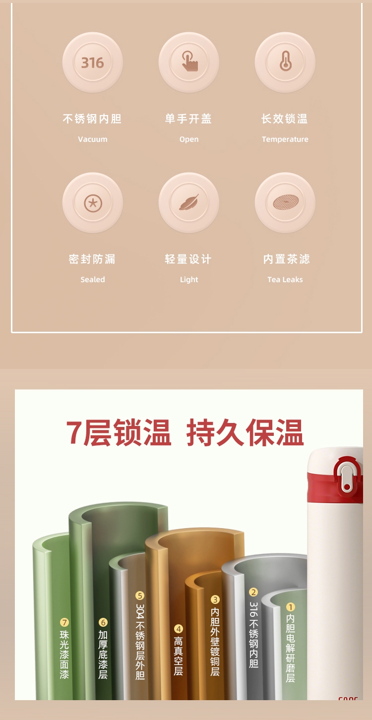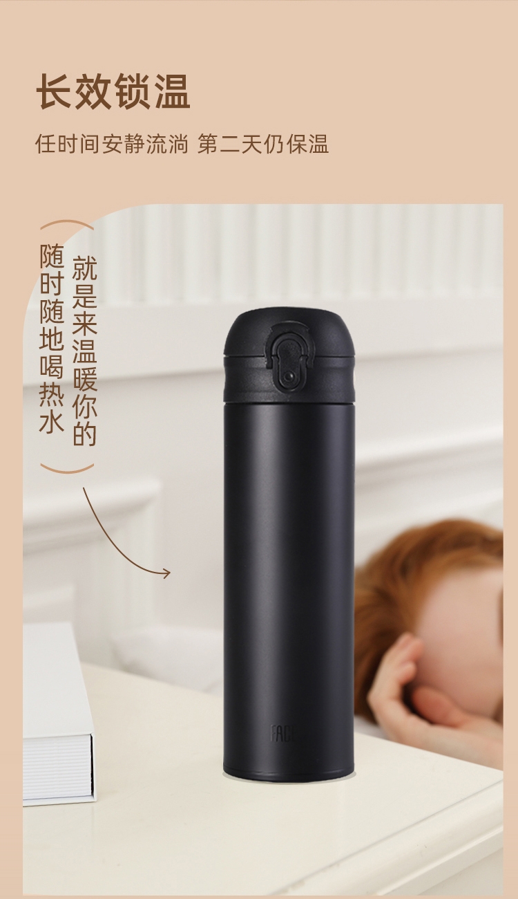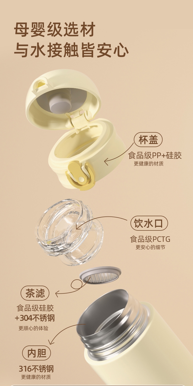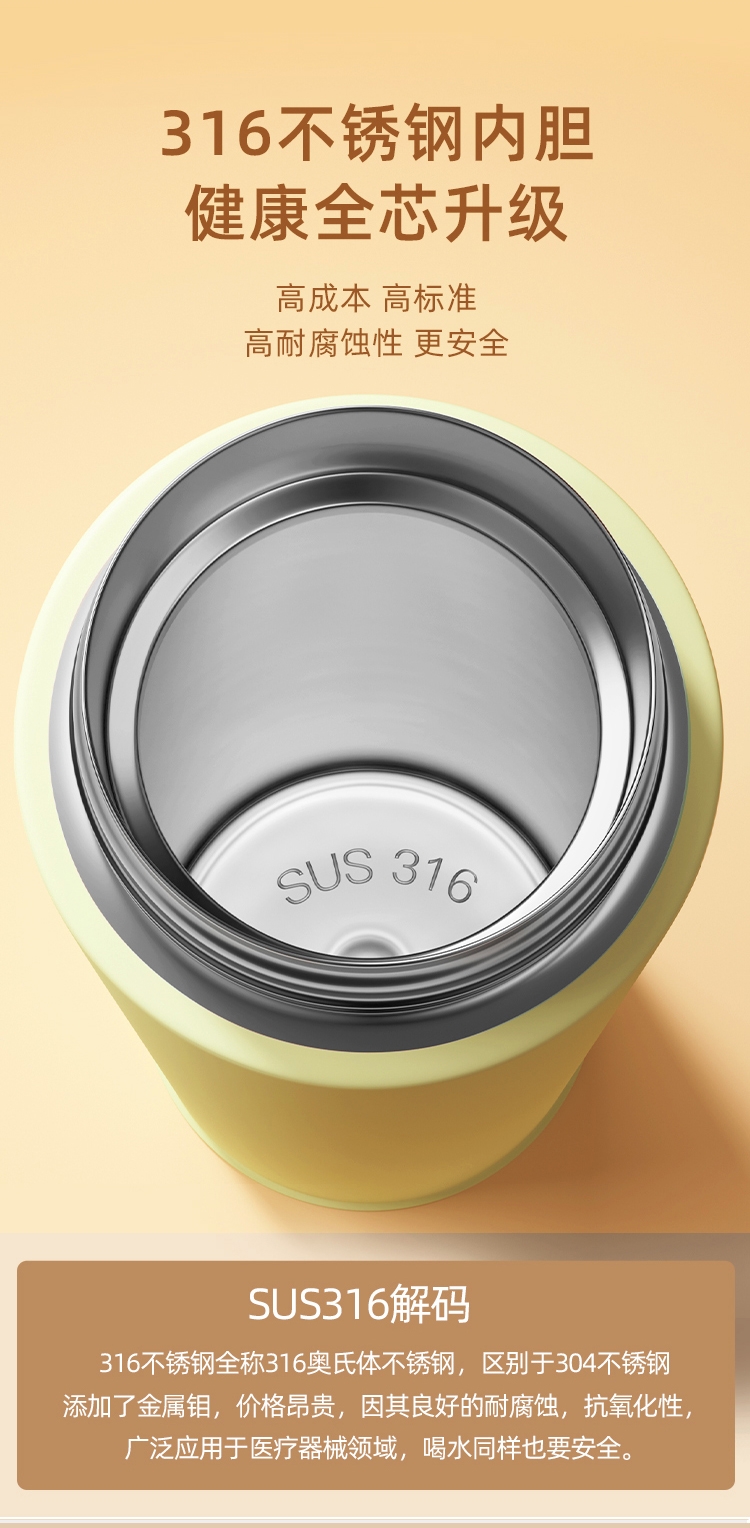 316不锈钢内胆,耐氧化,耐腐蚀,易清洗;安全锁扣,一键开盖,单手就可以便捷开盖;防烫直饮杯口,耐高温,不导热
