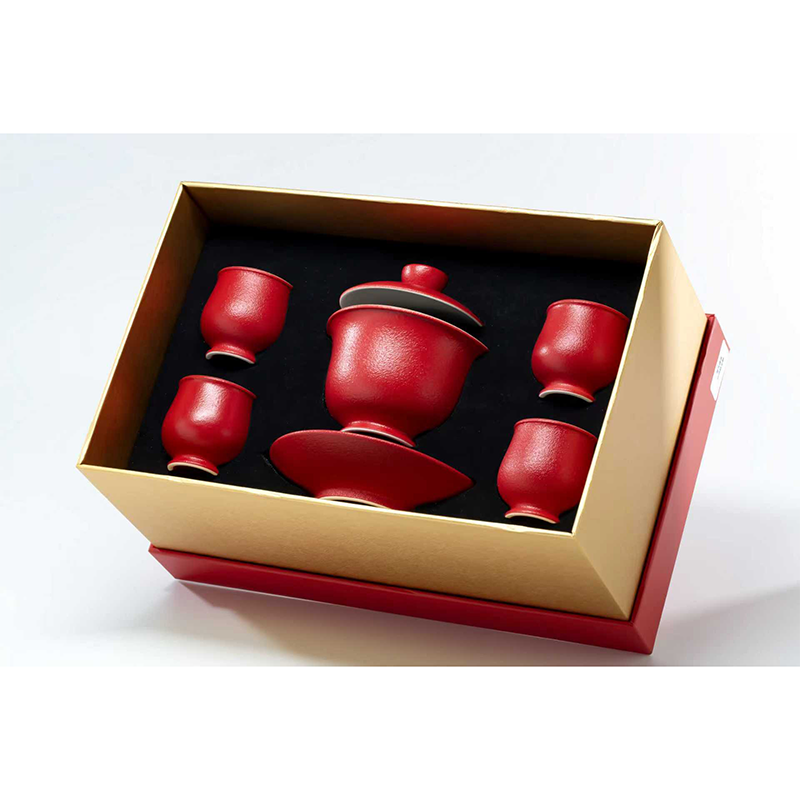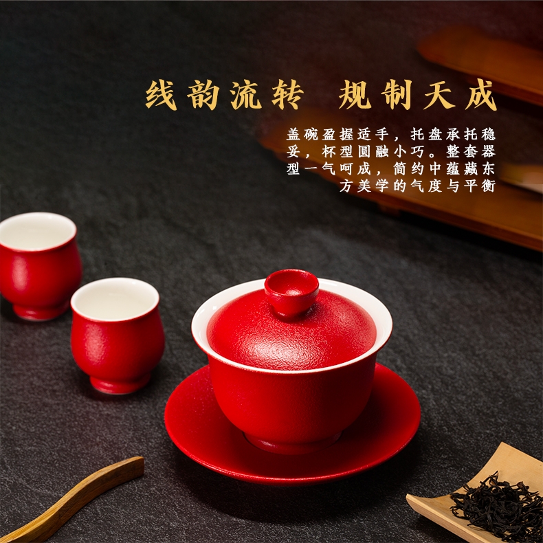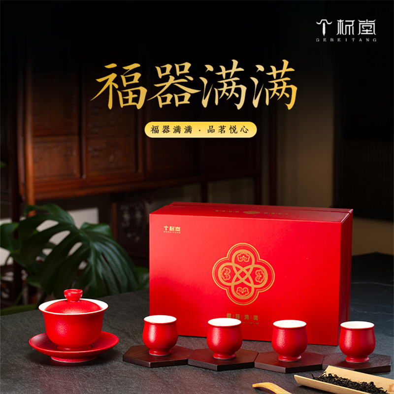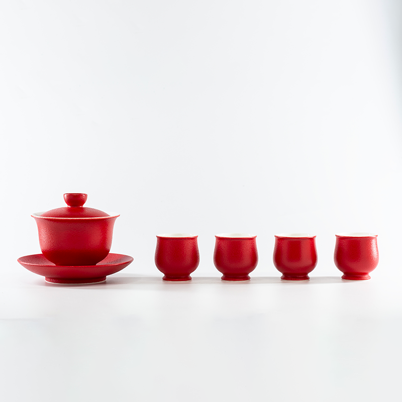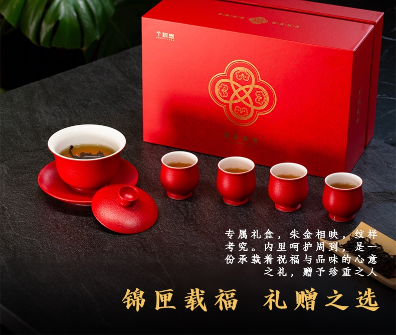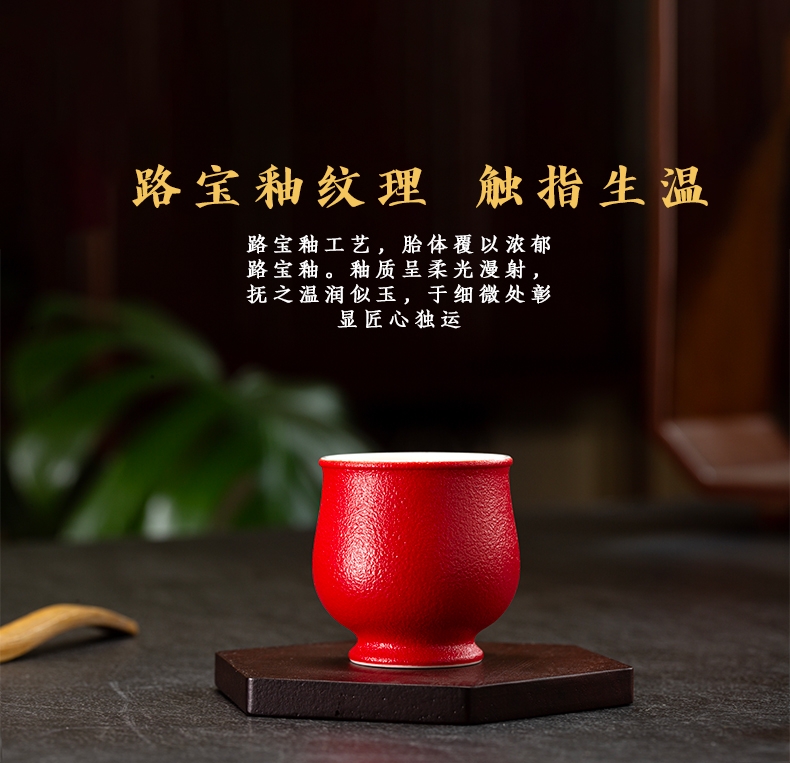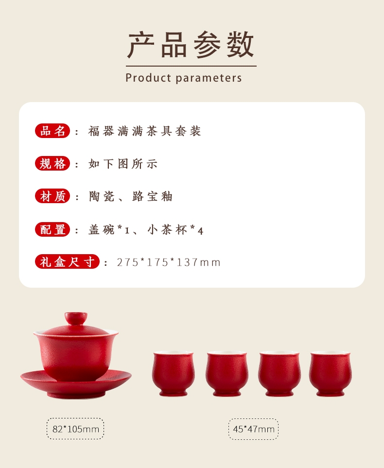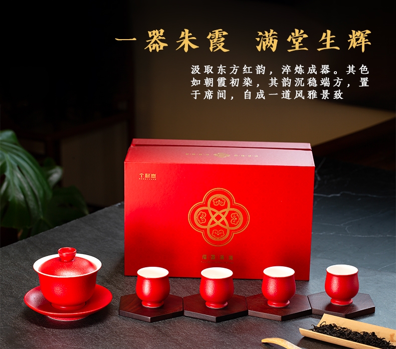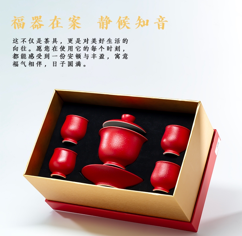 ·茶具通体采用大红色路宝釉烧制,釉面自带凹凸肌理纹;包装饰以如意、福字等经典吉祥纹样,象征“万事如意”;四杯一碟组合适配亲友小聚场景,茶杯弧线贴合掌心,