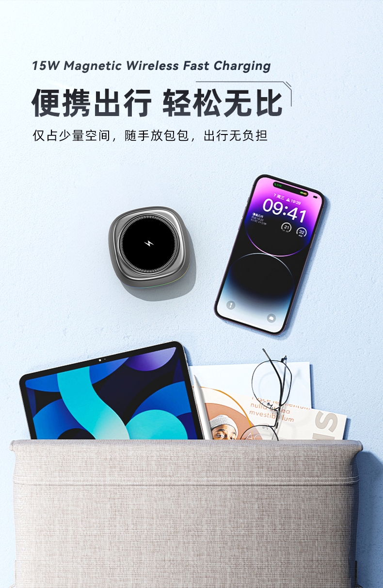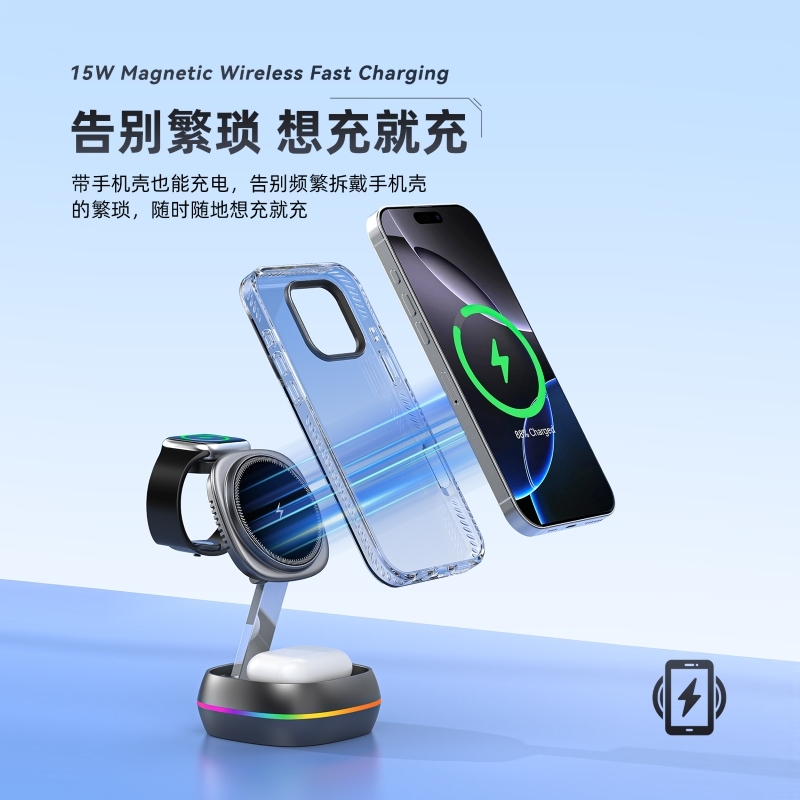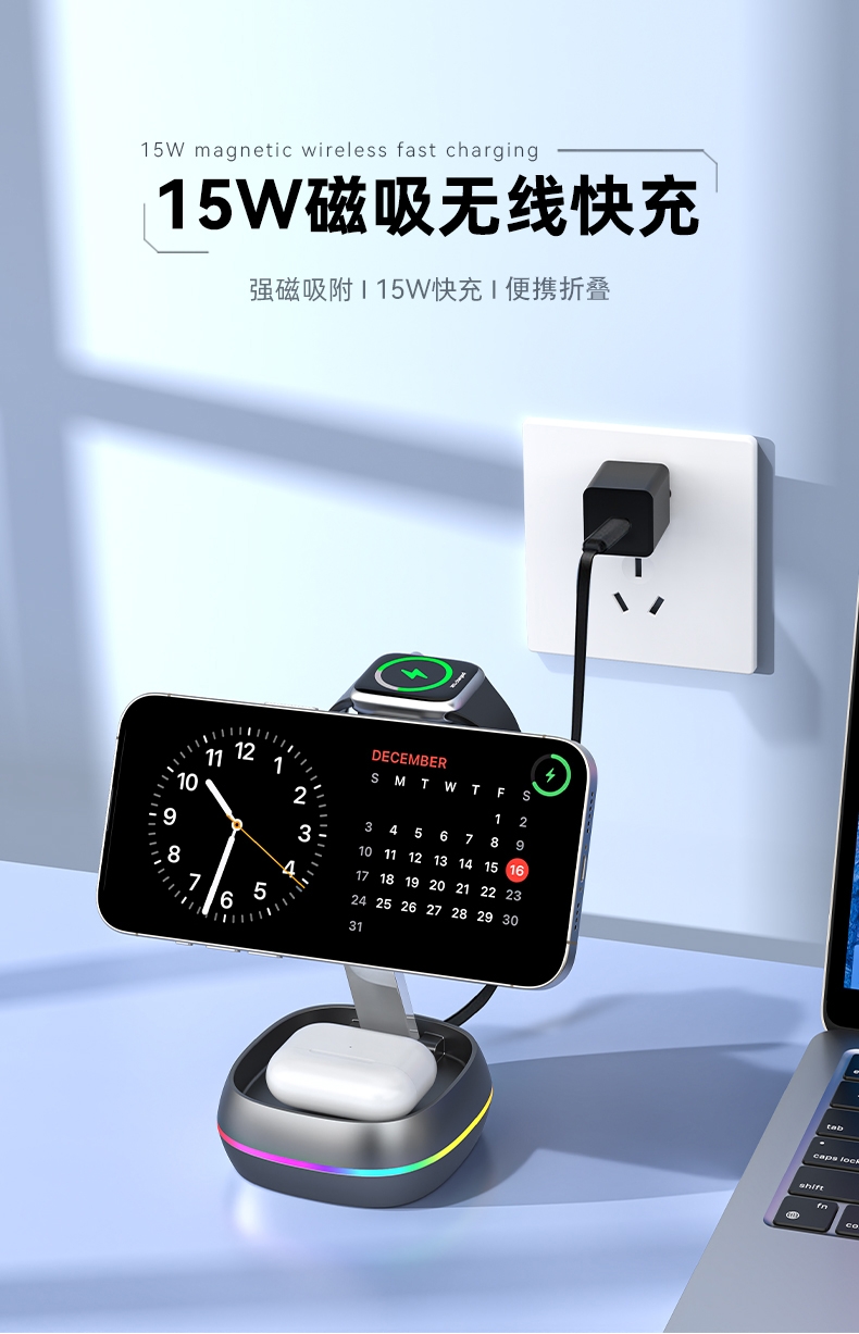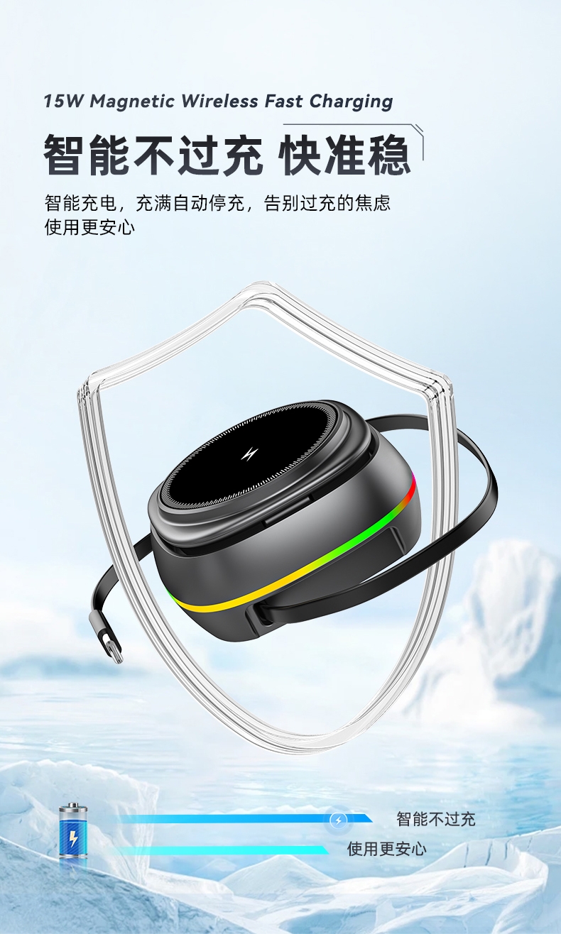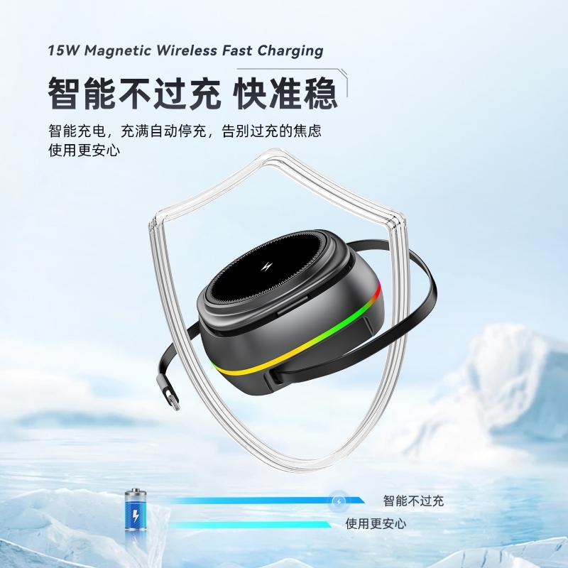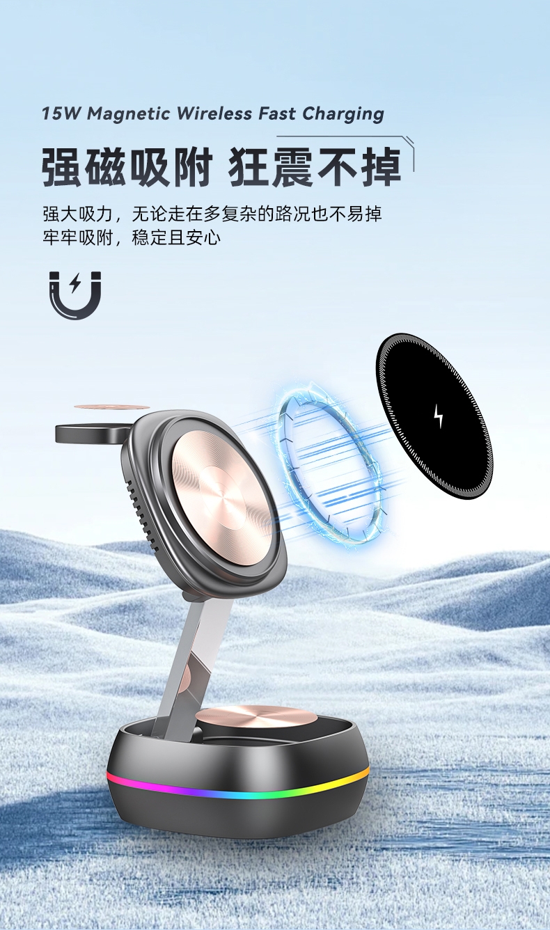 15W磁吸无线快充 充满自动停充;强大吸力 牢牢吸附 强大且安心;带手机壳也能充 多角度调节 更灵活