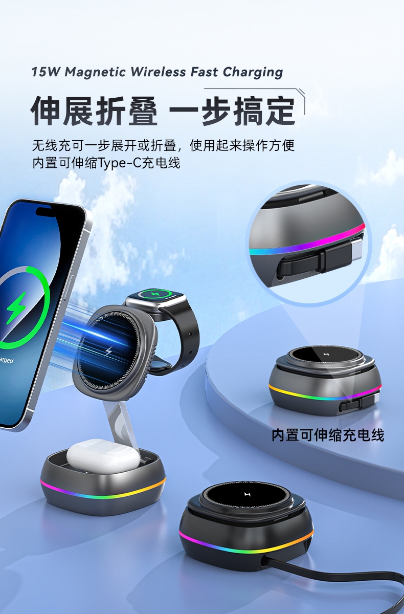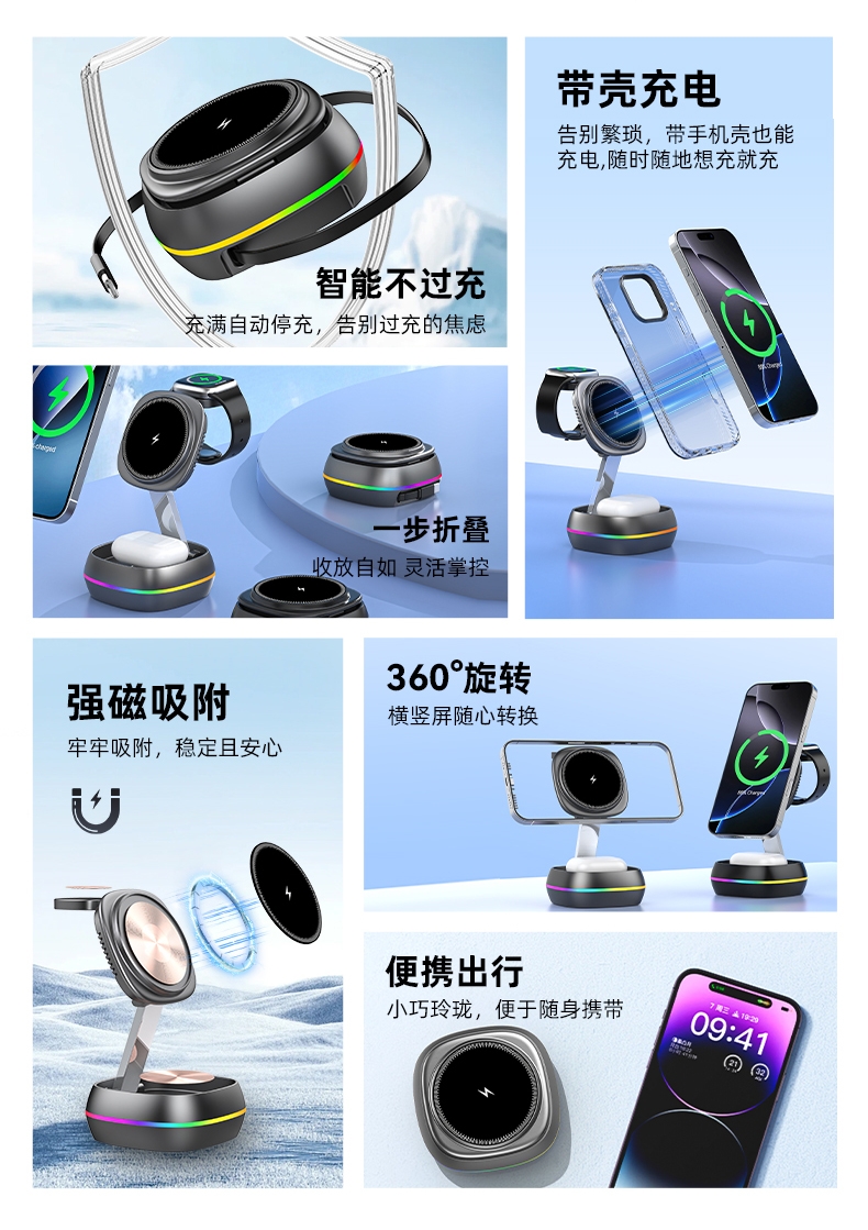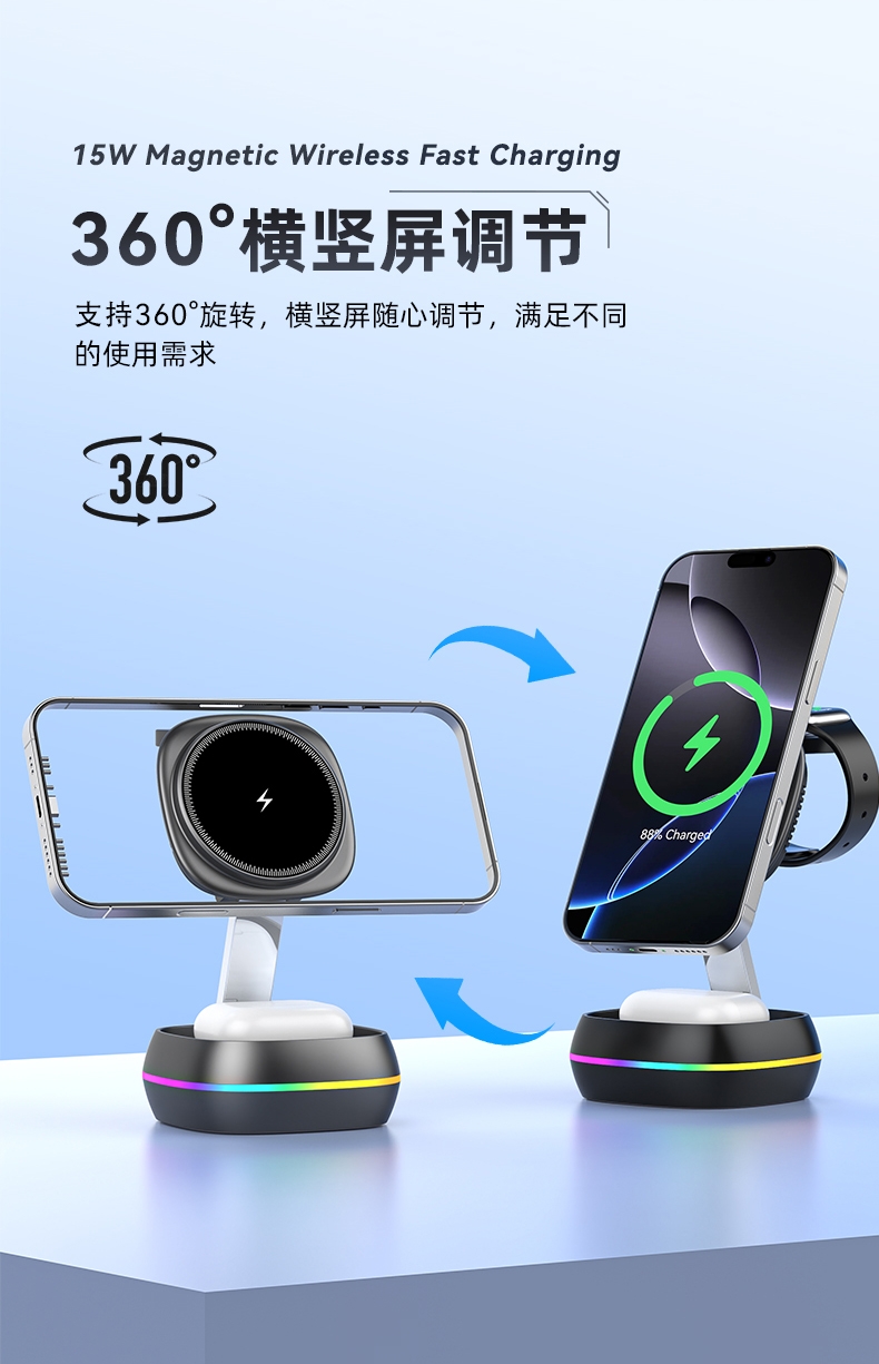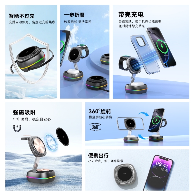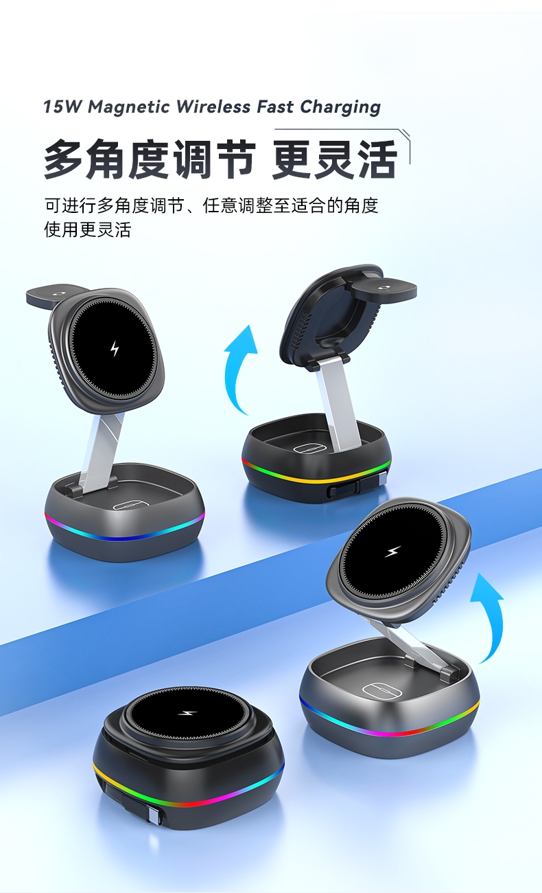 15W磁吸无线快充 充满自动停充;强大吸力 牢牢吸附 强大且安心;带手机壳也能充 多角度调节 更灵活