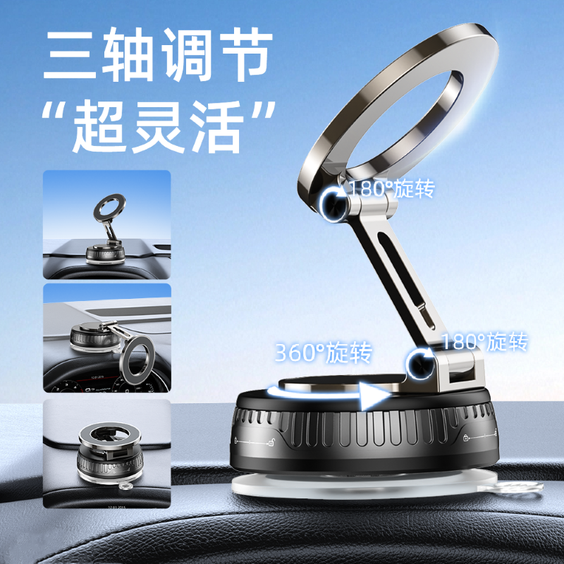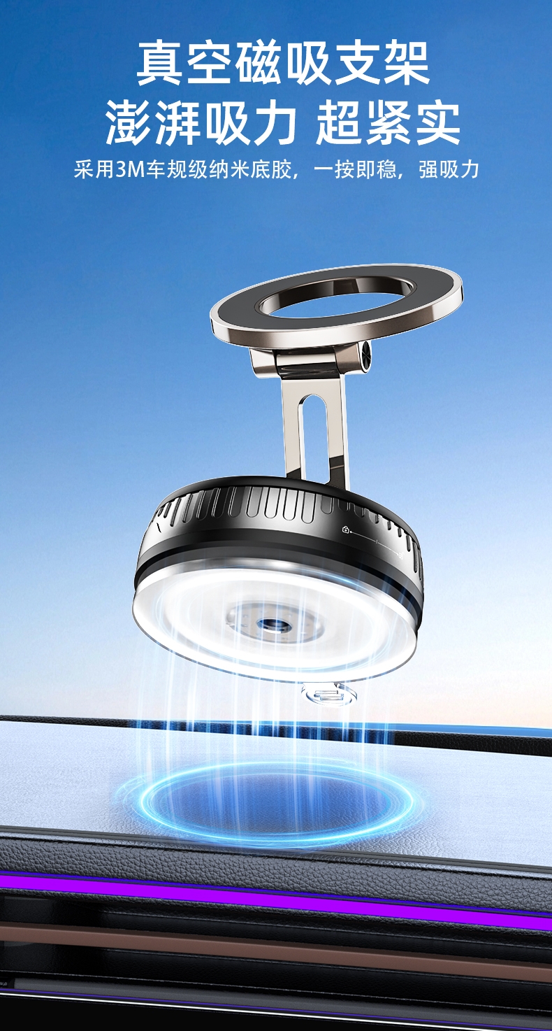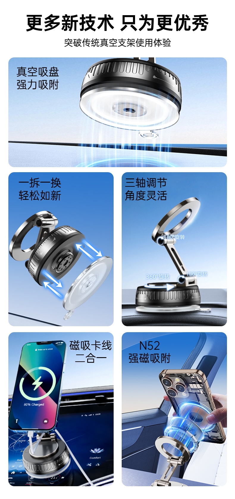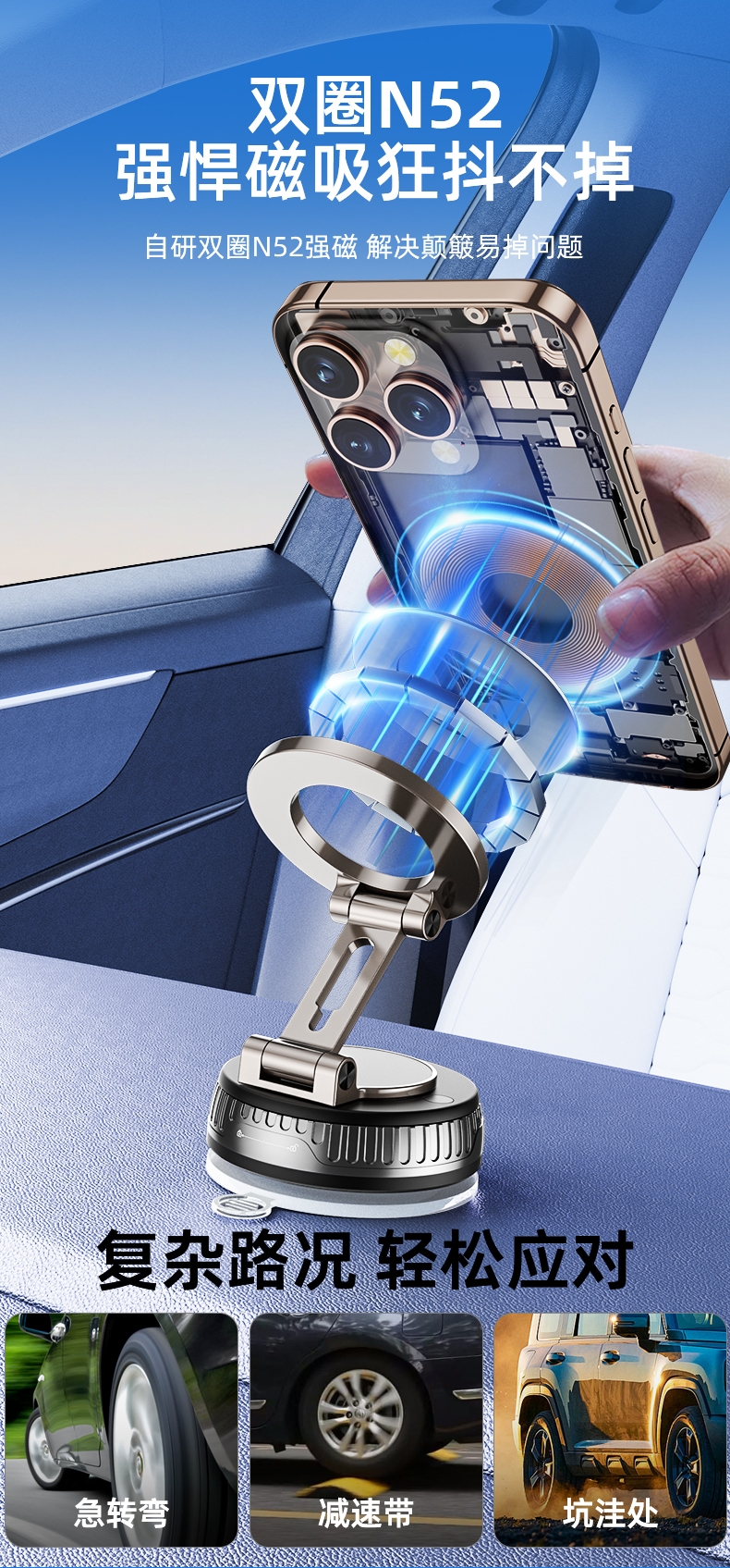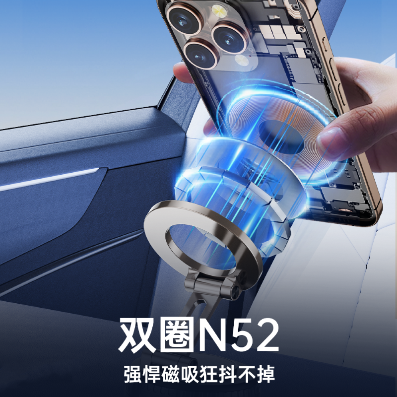 双圈N52 强悍磁吸;3M纳米滴胶,一按即稳,吸力强;三轴调节,随心调节
