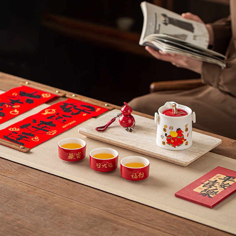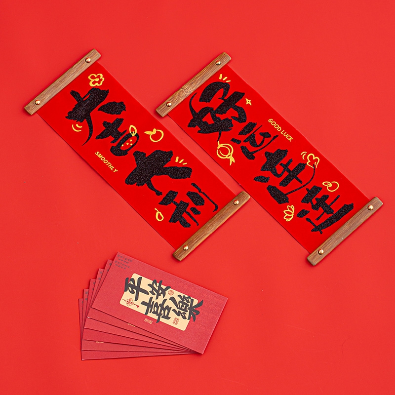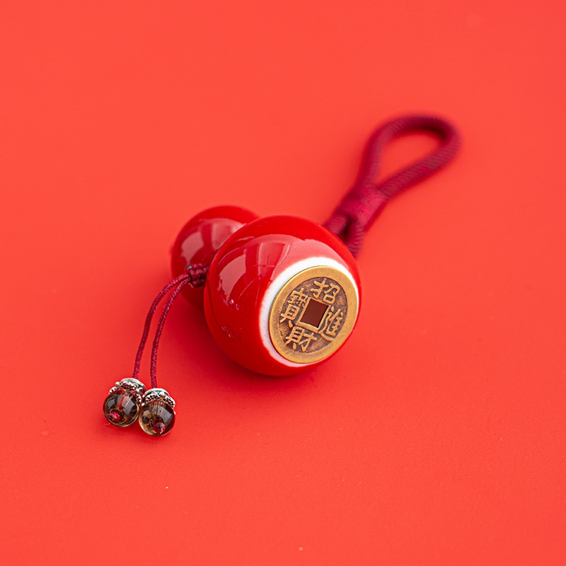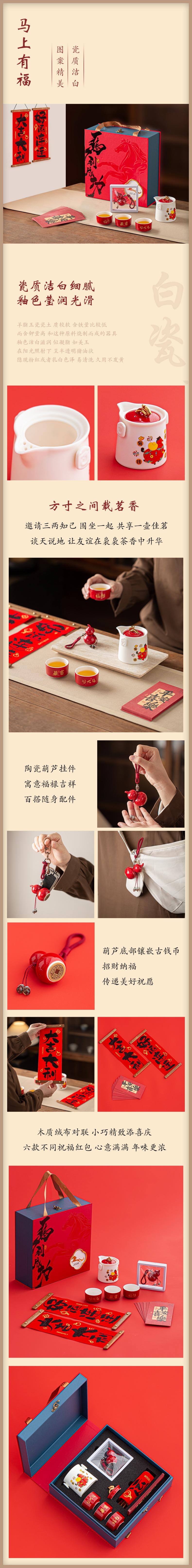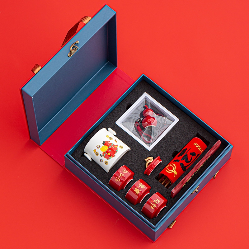 羊脂玉瓷1330℃烧制,酒红描金,实用美观显高级;陶瓷葫芦挂件,福禄寓意,镶古钱币招财纳福;木质绒布对联添喜庆,六款红包心意足,年味浓浓