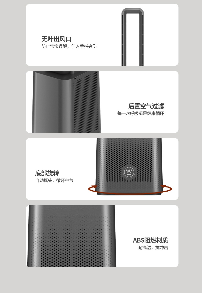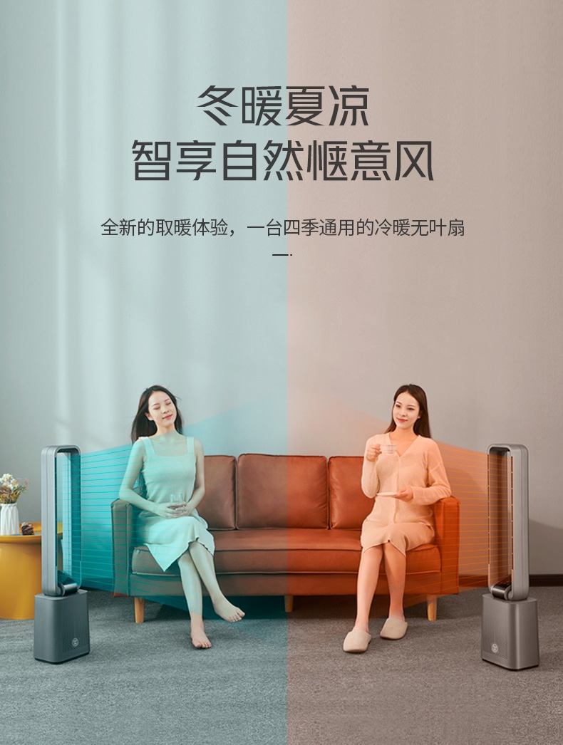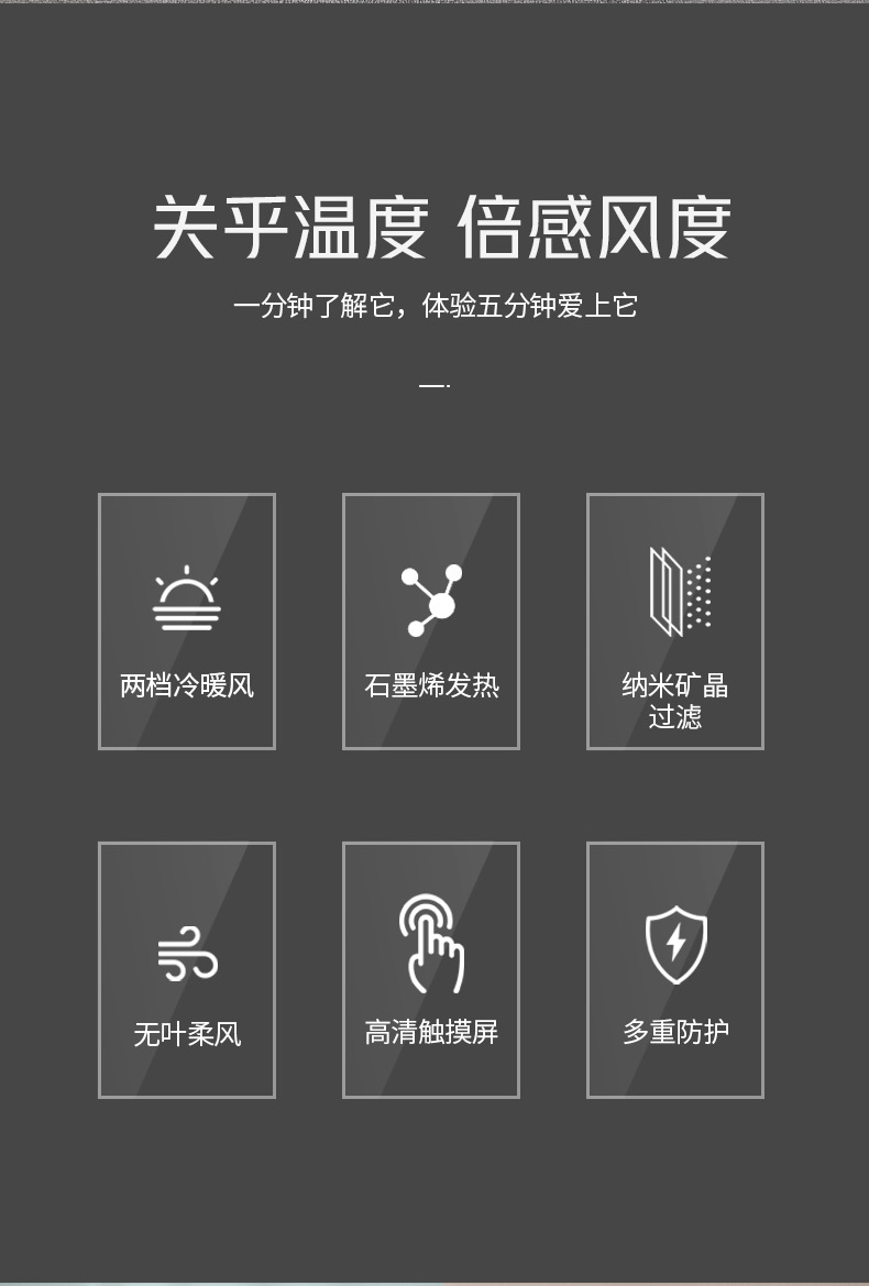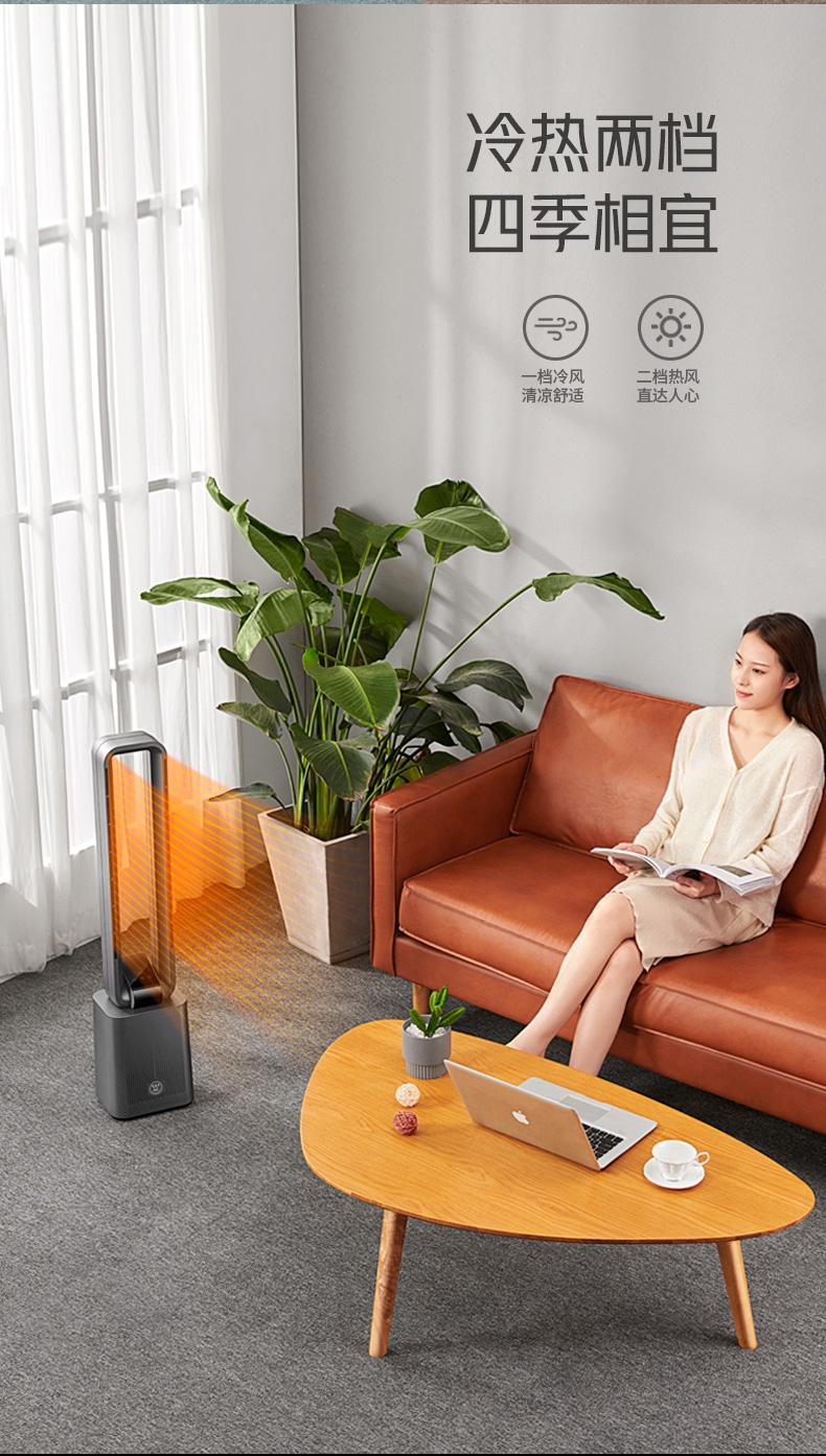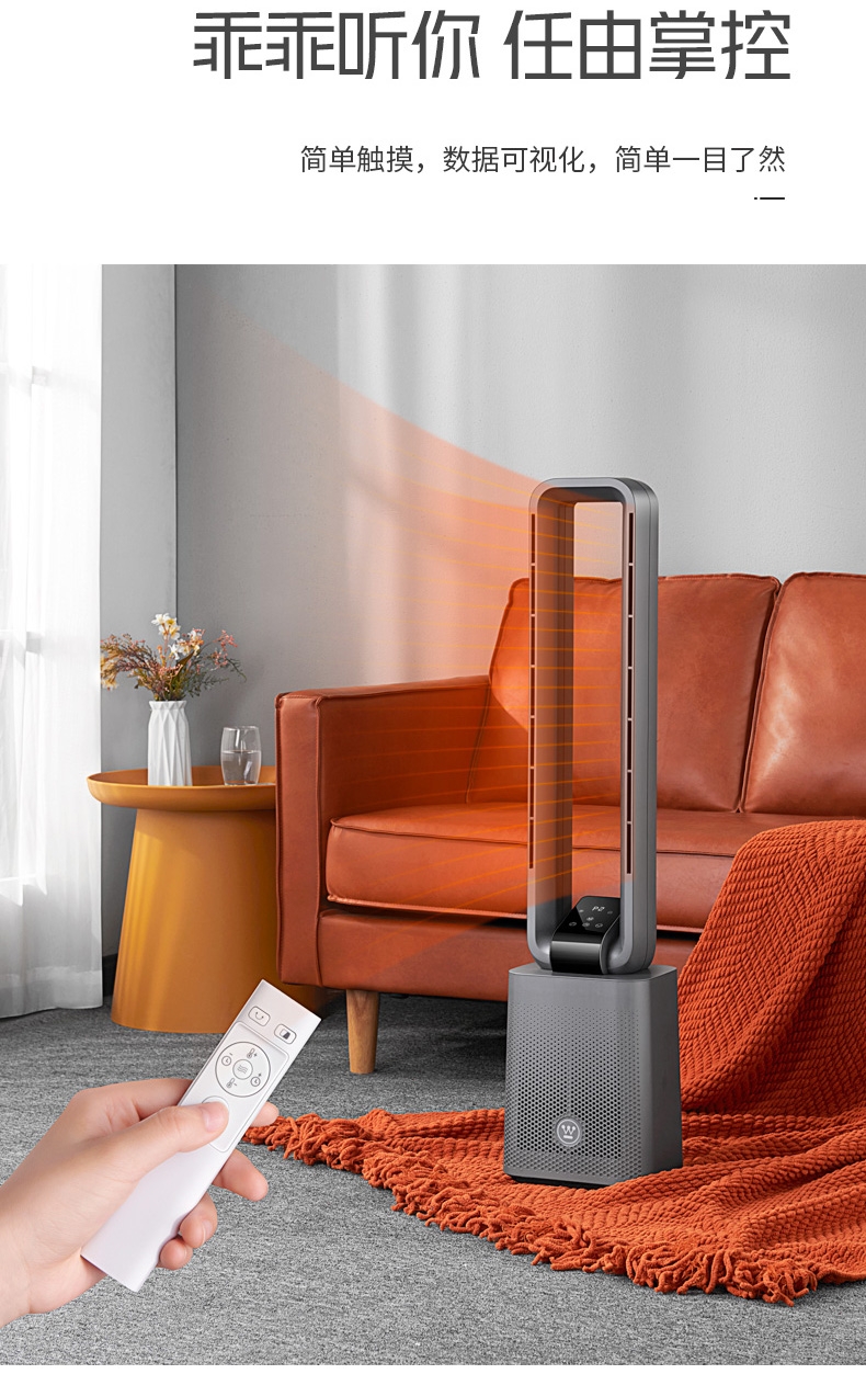 四季通用,两档调节,一档自然风,二档热风;液晶显示,高清触摸屏,可远距离遥控;无叶设计,过热/倾倒自动断电,多重保护