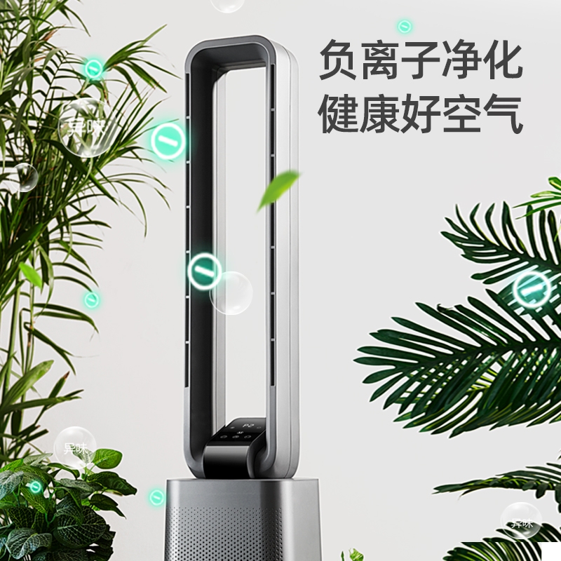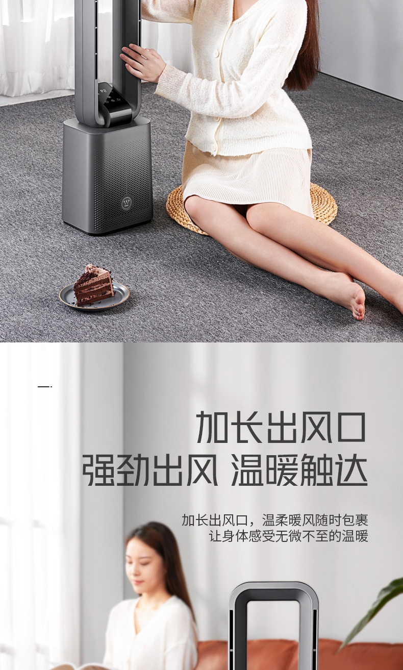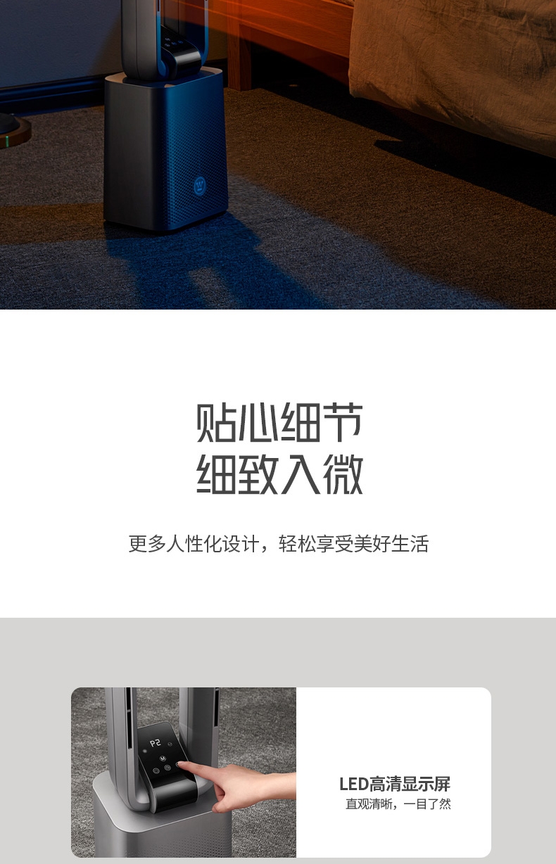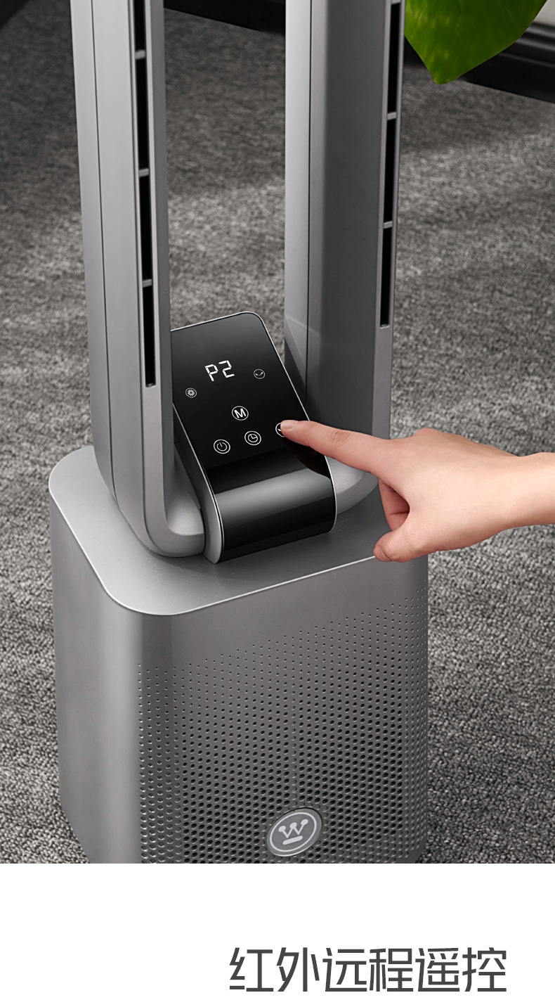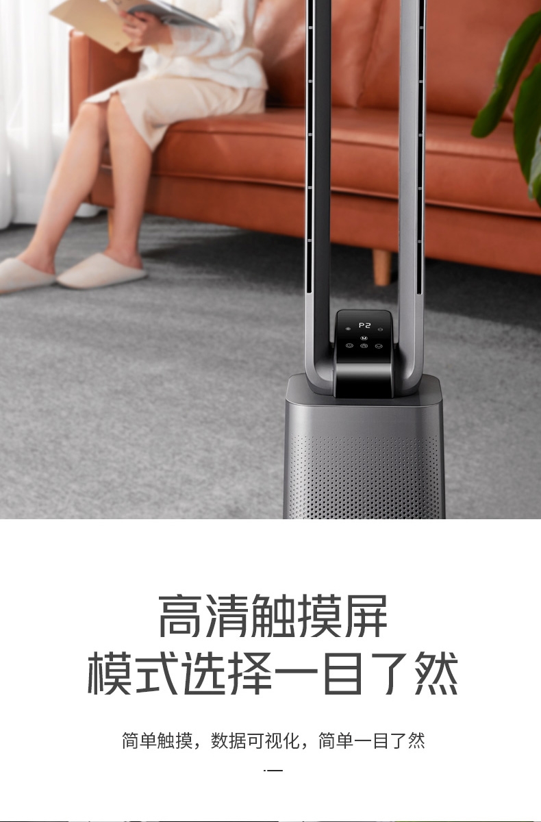 四季通用,两档调节,一档自然风,二档热风;液晶显示,高清触摸屏,可远距离遥控;无叶设计,过热/倾倒自动断电,多重保护