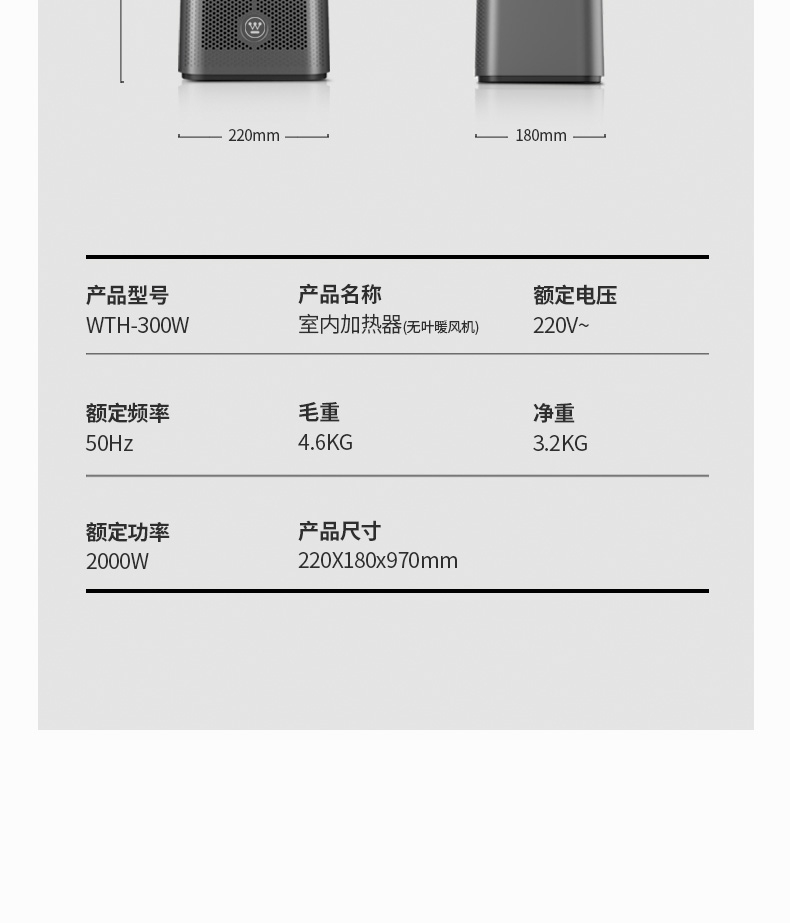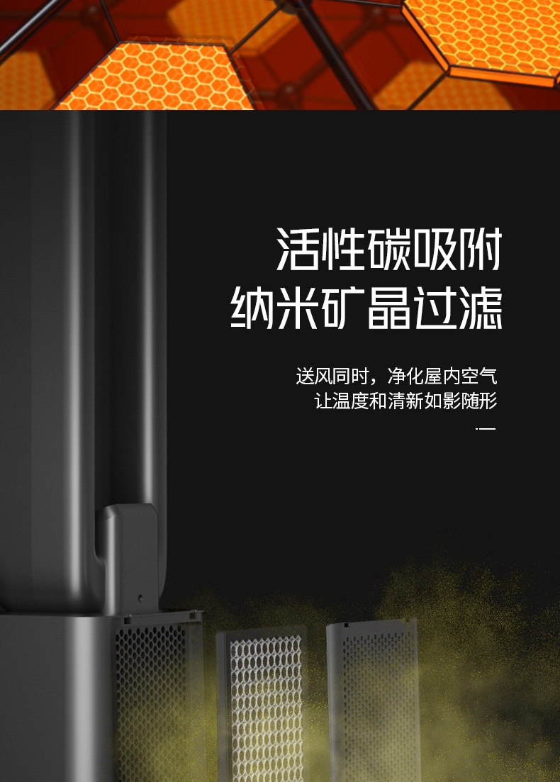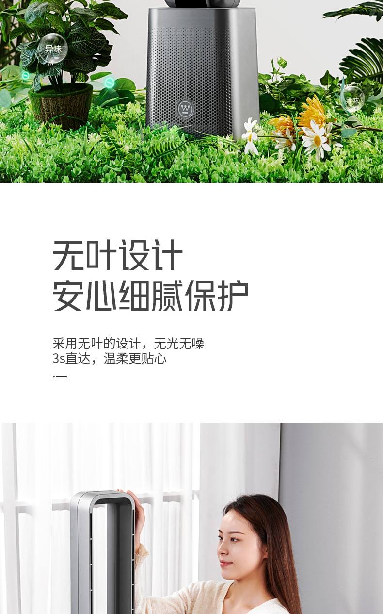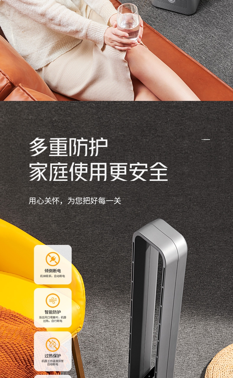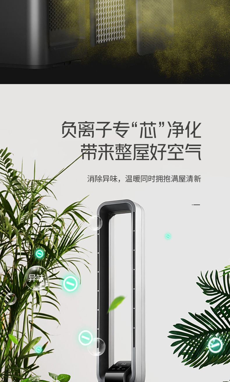 四季通用,两档调节,一档自然风,二档热风;液晶显示,高清触摸屏,可远距离遥控;无叶设计,过热/倾倒自动断电,多重保护