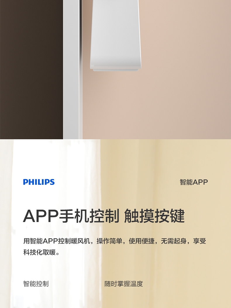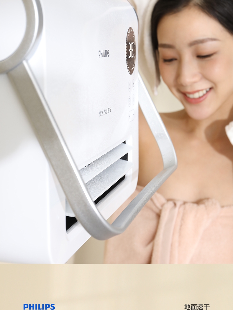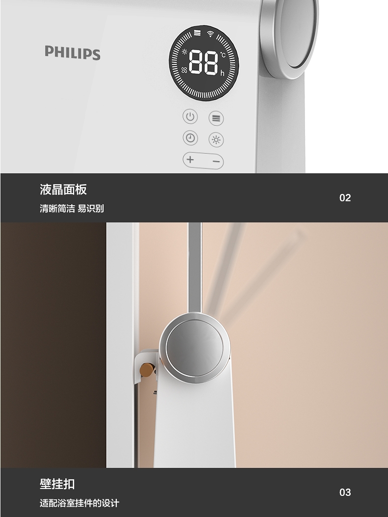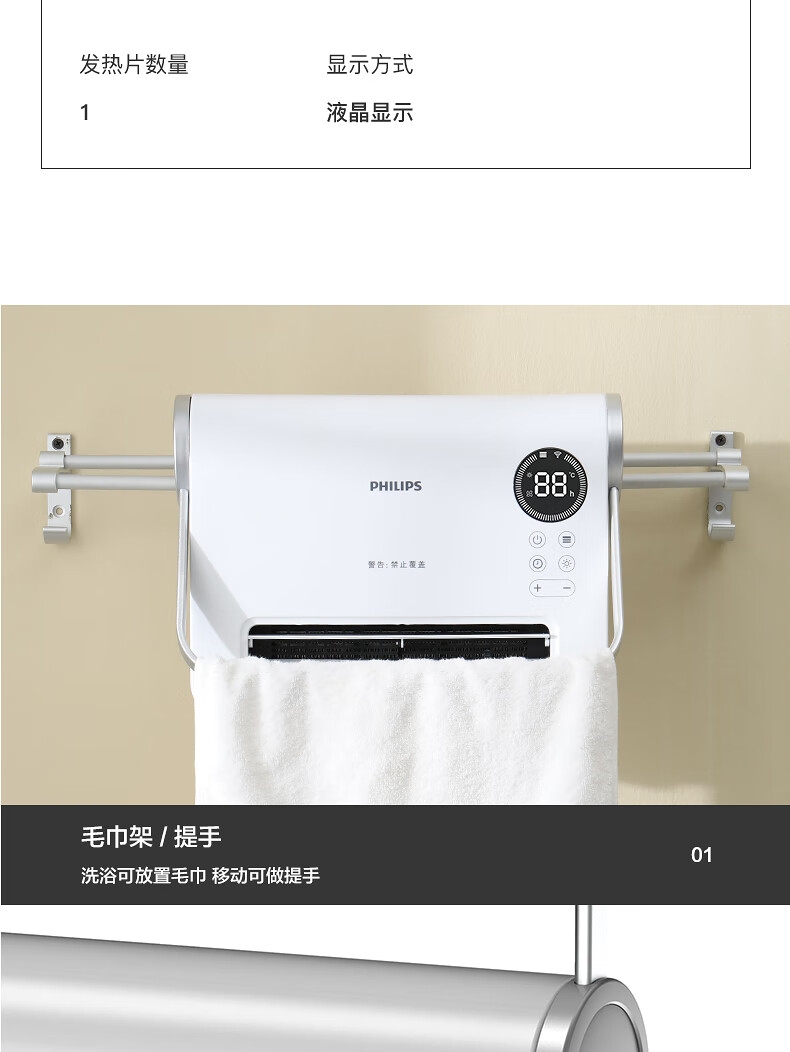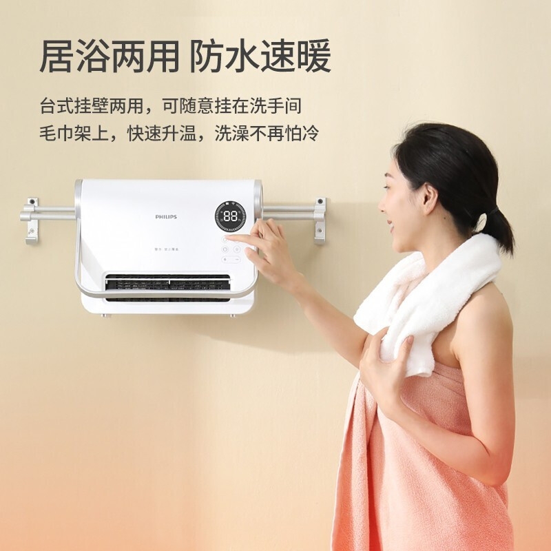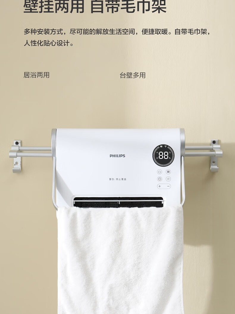 壁挂两用,自带毛巾架;不锈钢毛巾架可充当提手;居浴两用;上下60°广角送风;PTC发热 2000W功率;APP手机控制 触摸按键