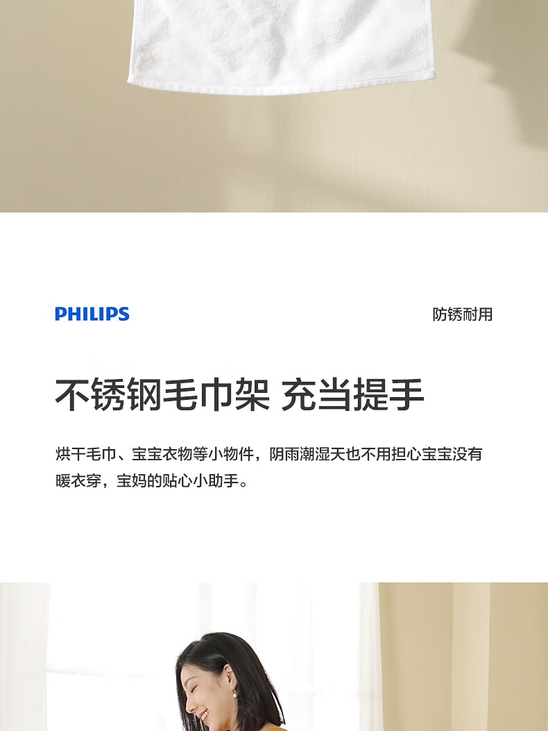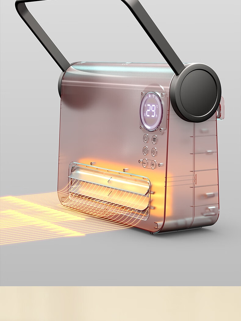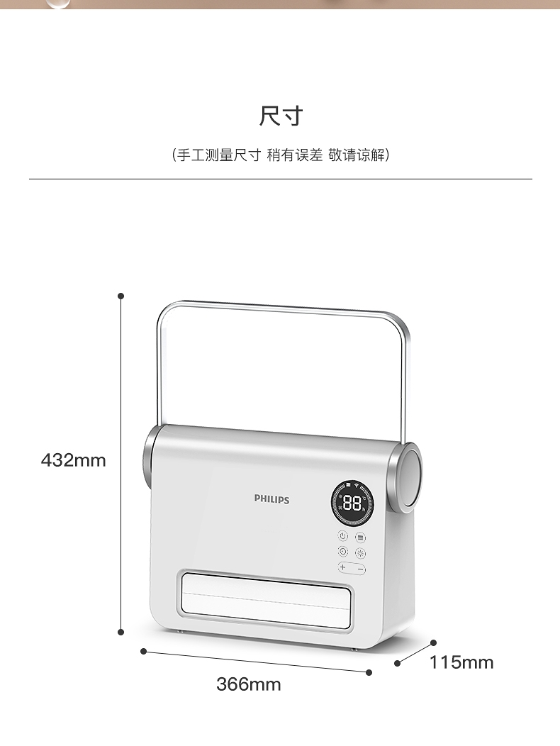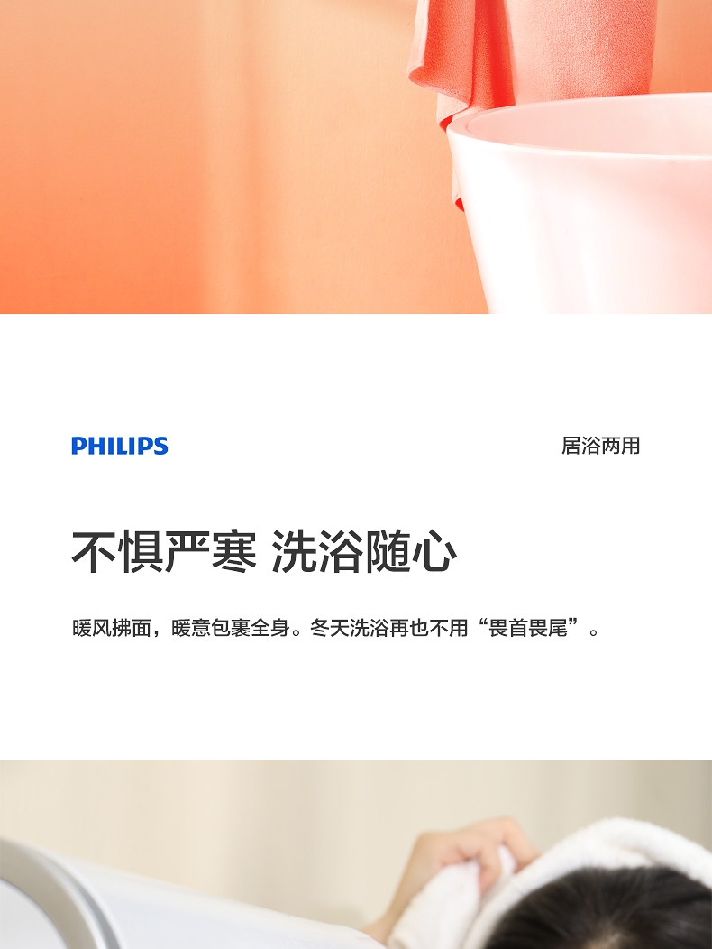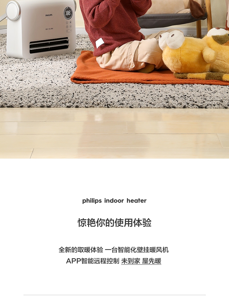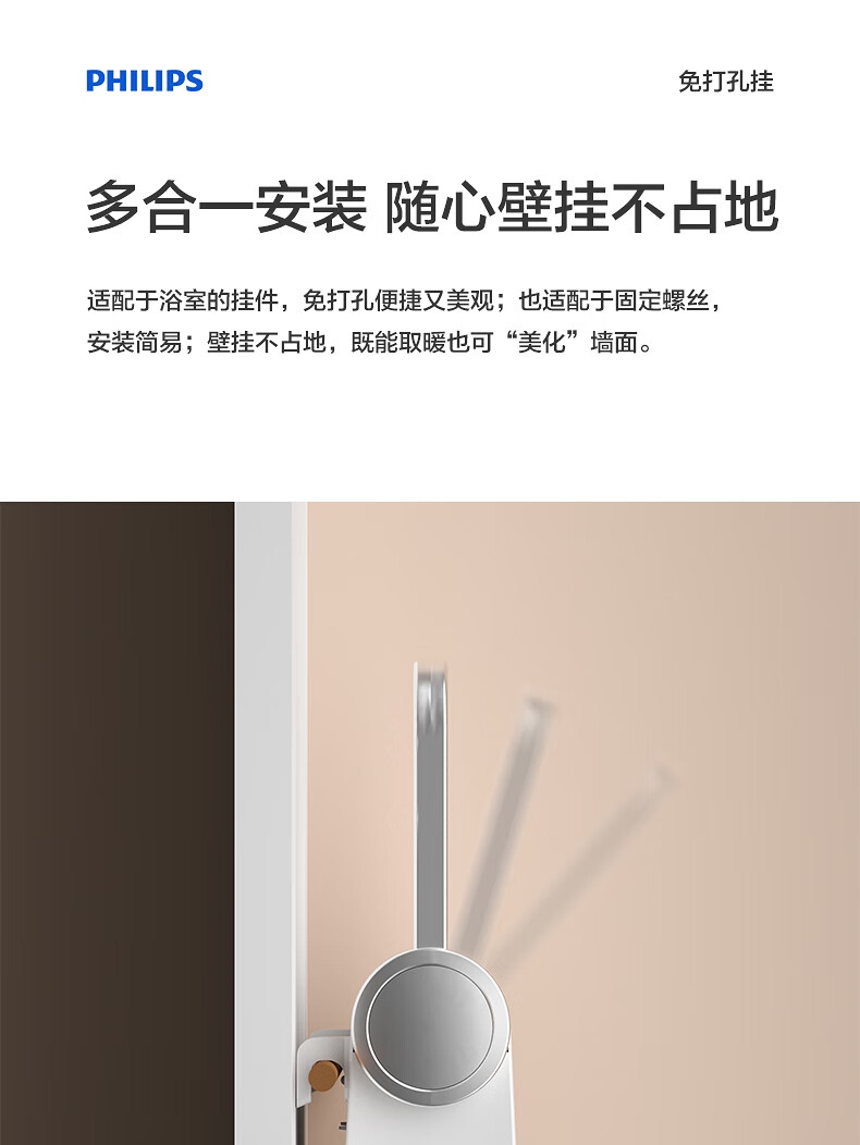 壁挂两用,自带毛巾架;不锈钢毛巾架可充当提手;居浴两用;上下60°广角送风;PTC发热 2000W功率;APP手机控制 触摸按键