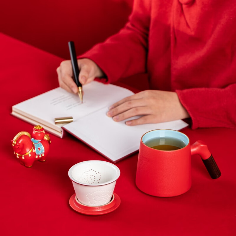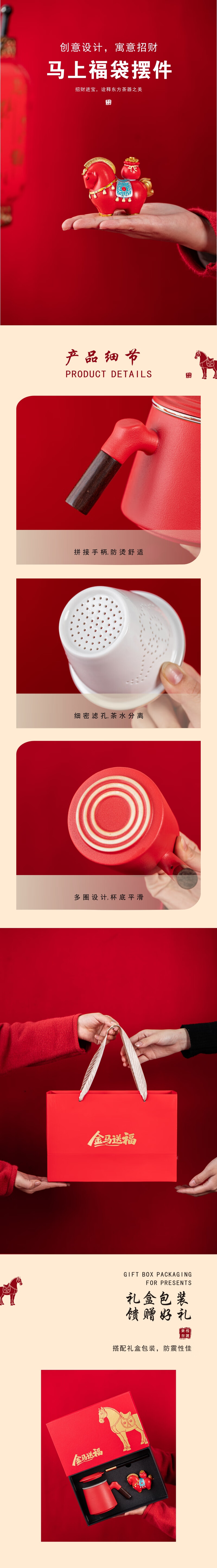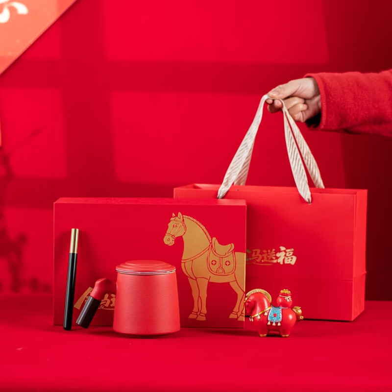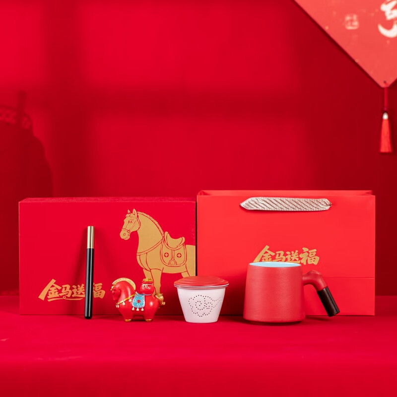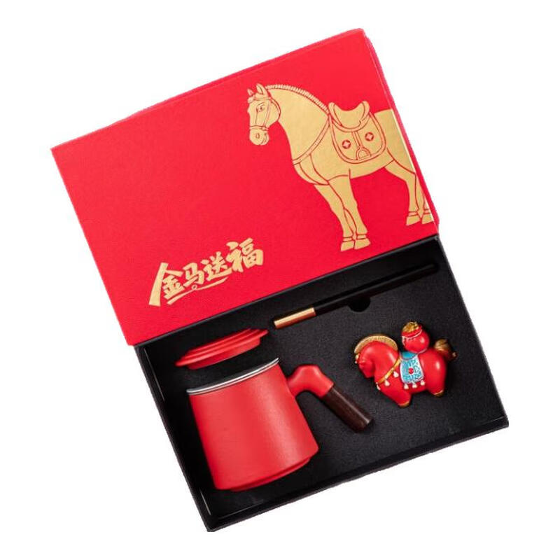 三件式过滤杯,喝茶超方便;马到成功福袋摆件,寓意超吉祥;黑檀签字笔,质感超高级;红韵包装,送礼超有面
