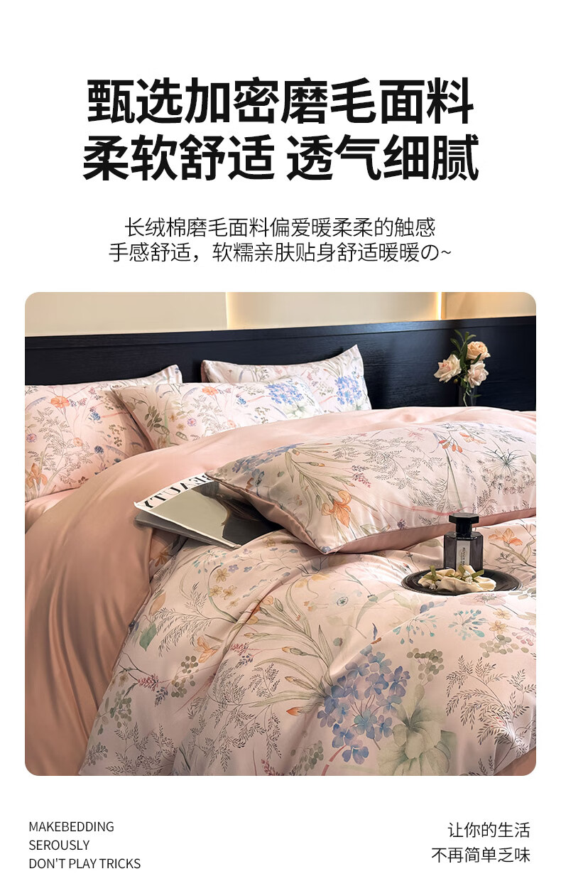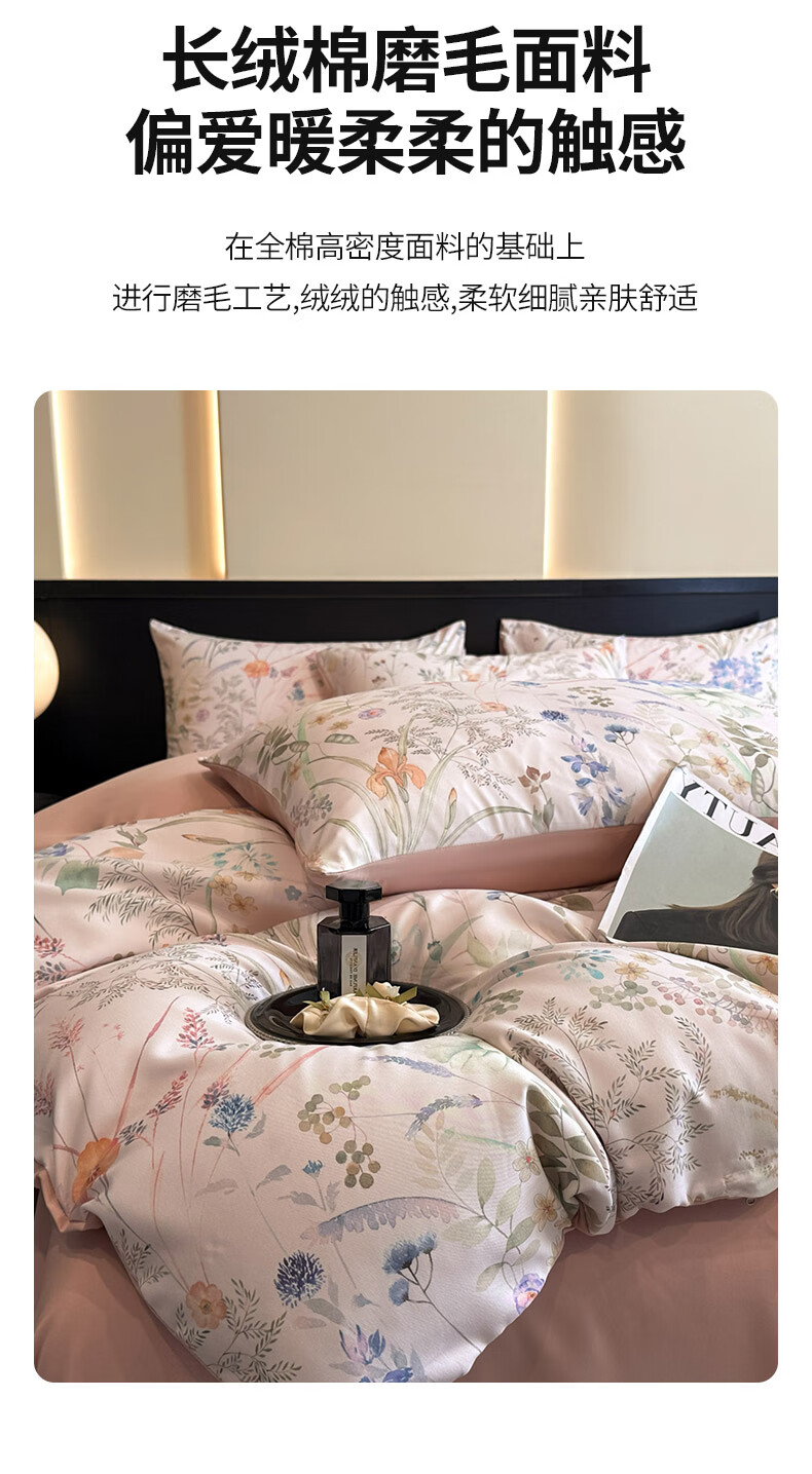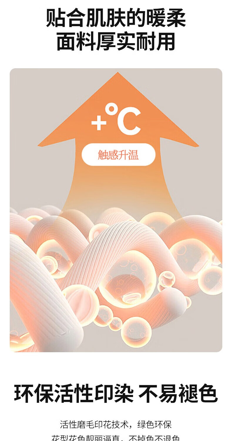 面料选用活性磨毛工艺而成;手感舒适厚实,保暖透气。;使用当今流行的活性磨毛印花技术,绿色环保,花型花色