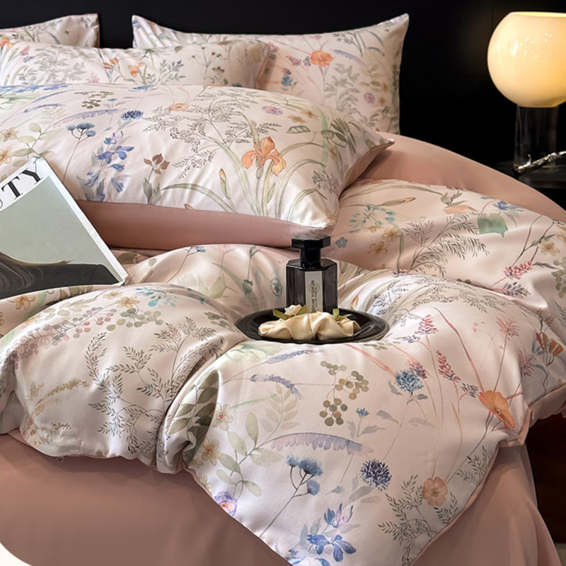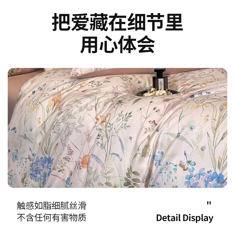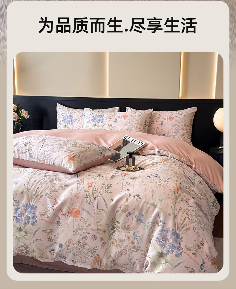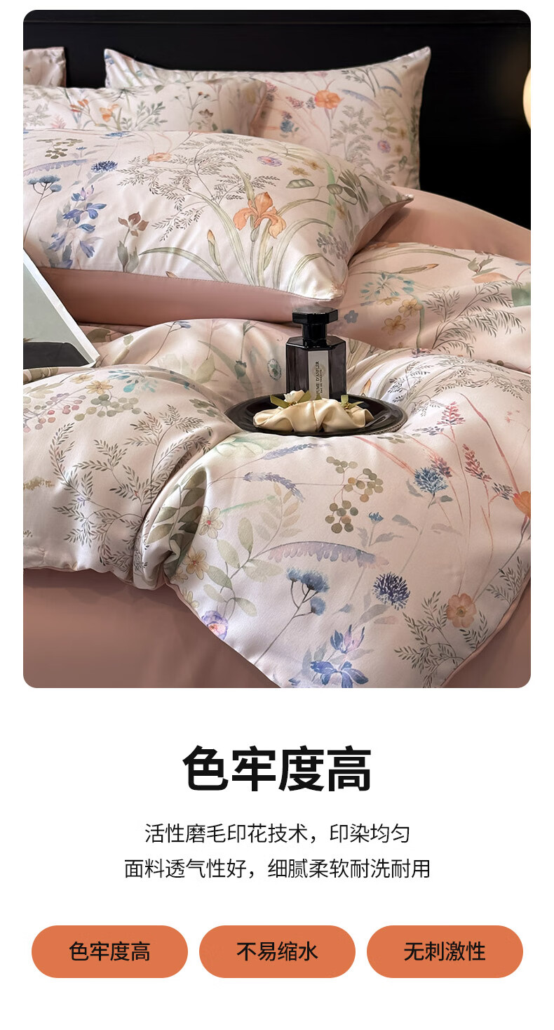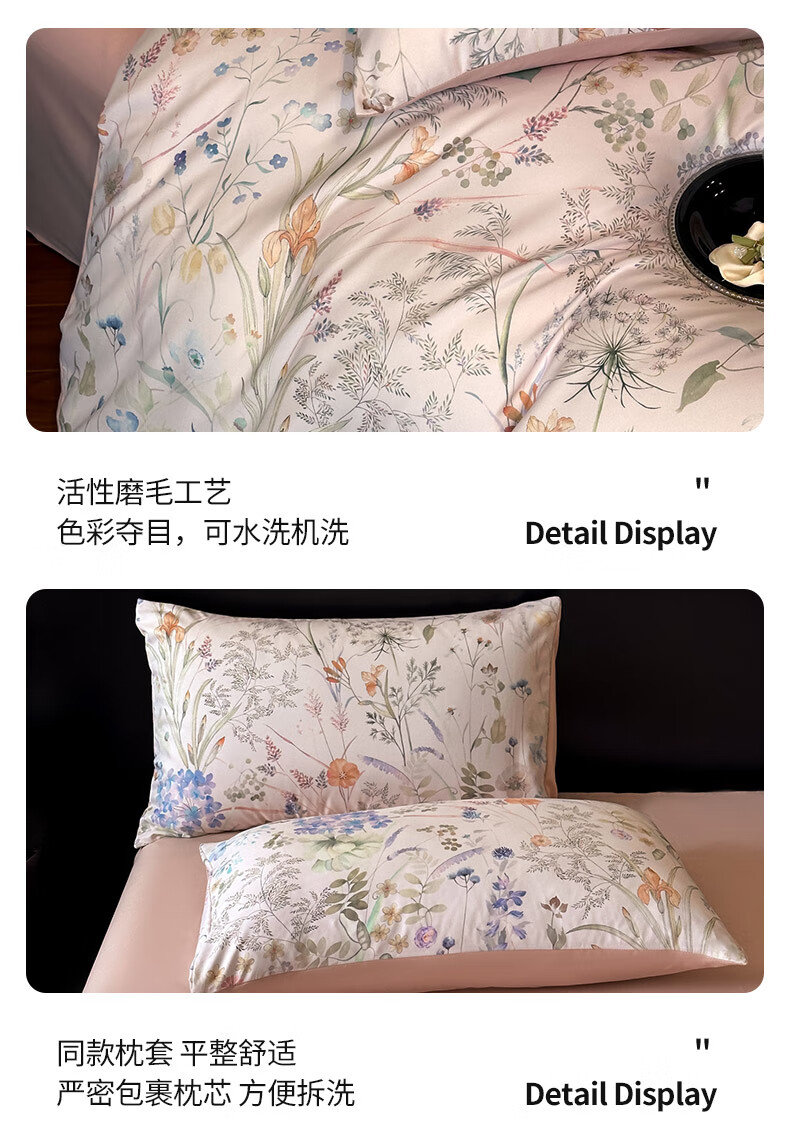 面料选用活性磨毛工艺而成;手感舒适厚实,保暖透气。;使用当今流行的活性磨毛印花技术,绿色环保,花型花色