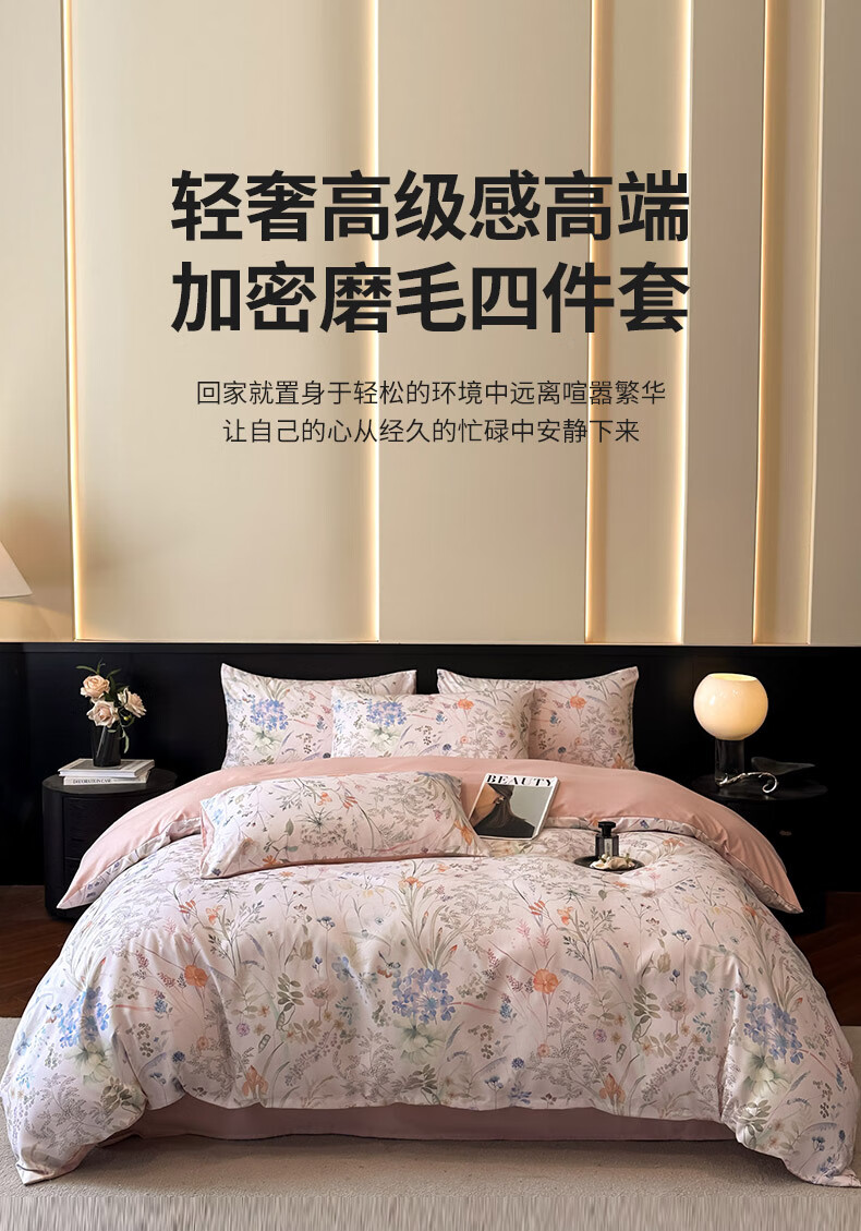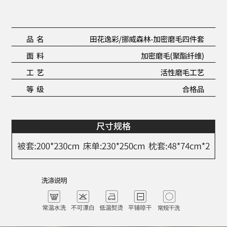 配置清单:材质:加密磨毛(聚酯纤维) 规格:被套:200*230cm 床单:230*250cm 枕套:48*74cm*2