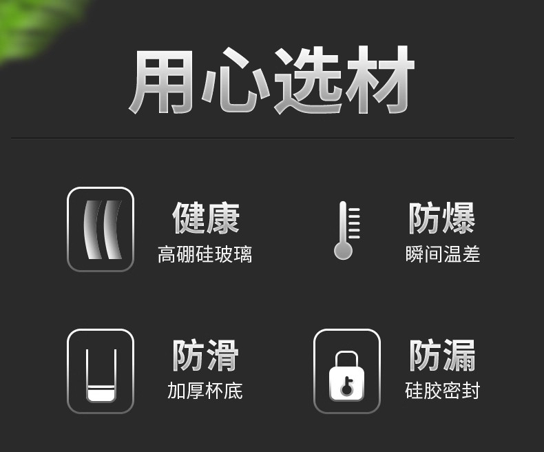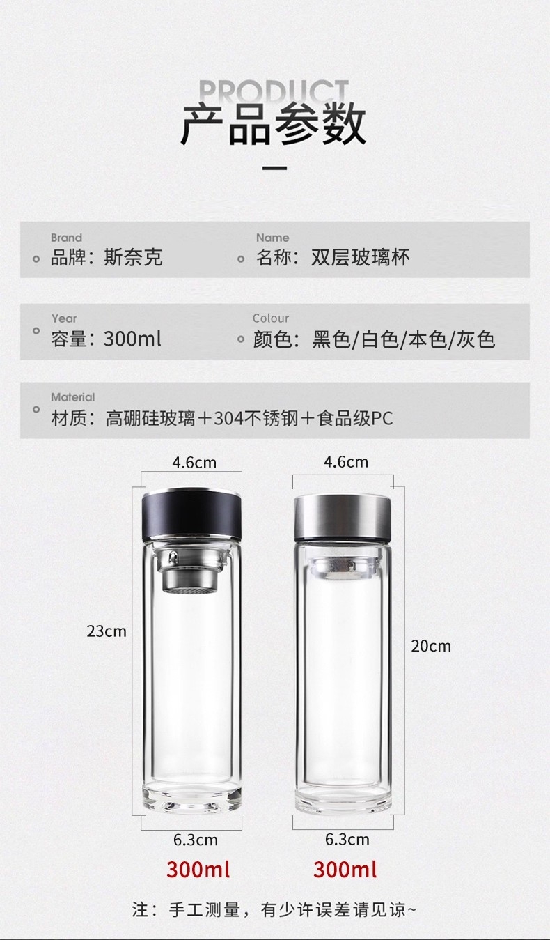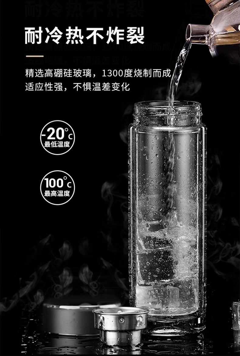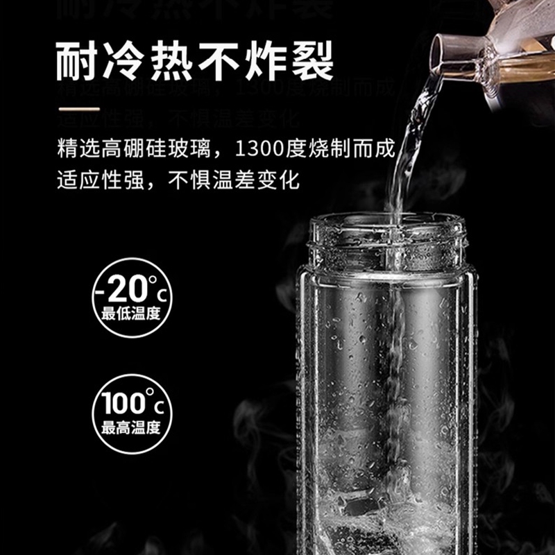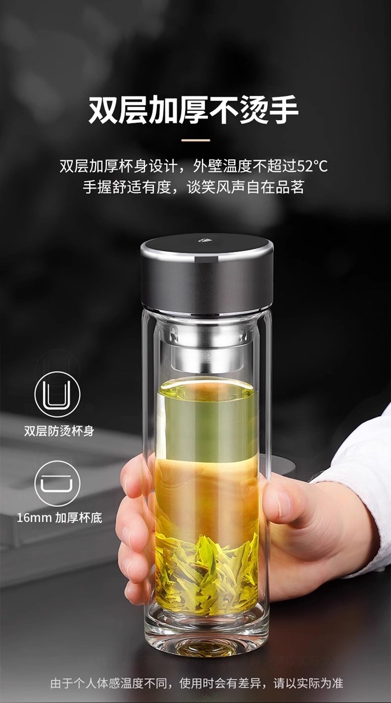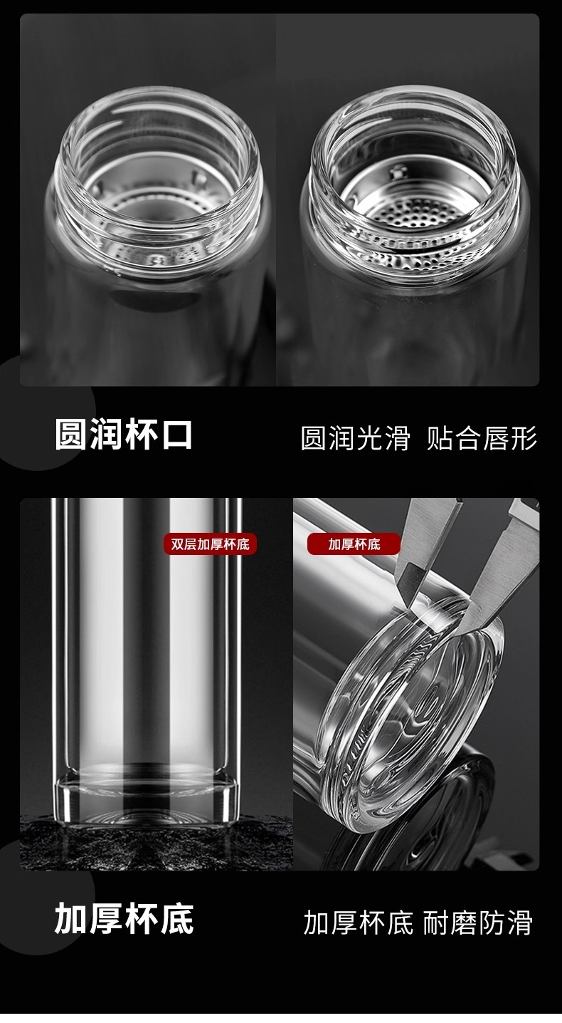 茶汤、果汁接触无有害物质析出;通透度高,杯身无杂质,清晰看见茶汤色泽;居家使用,办公通勤,送礼优选;杯身坚固抗摔,双层玻璃缓冲冲击力,轻微磕碰不易碎