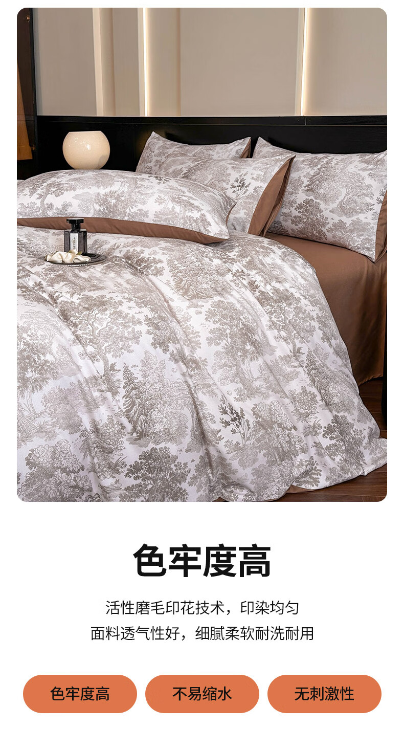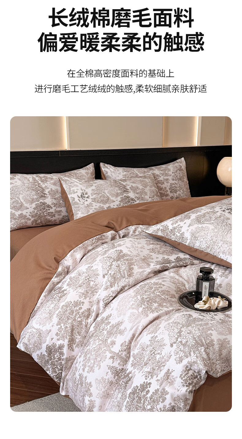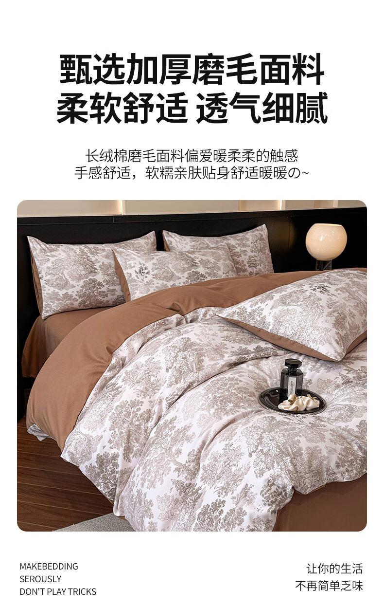 料选用活性磨毛工艺而成,手感舒适厚实,保暖透气。;用当今流行的活性磨毛印花技术,绿色环保;花型花色靓丽逼真, 不掉色不退色。
