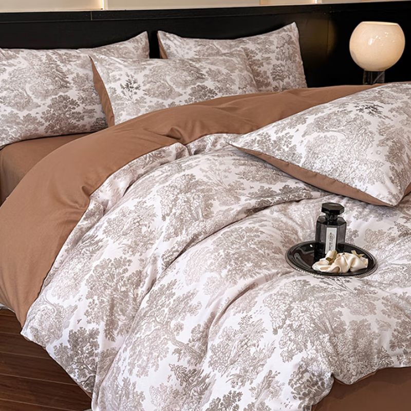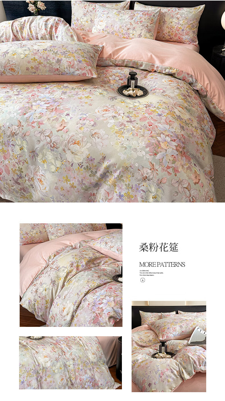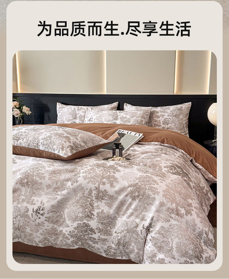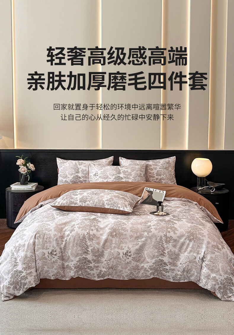 料选用活性磨毛工艺而成,手感舒适厚实,保暖透气。;用当今流行的活性磨毛印花技术,绿色环保;花型花色靓丽逼真, 不掉色不退色。