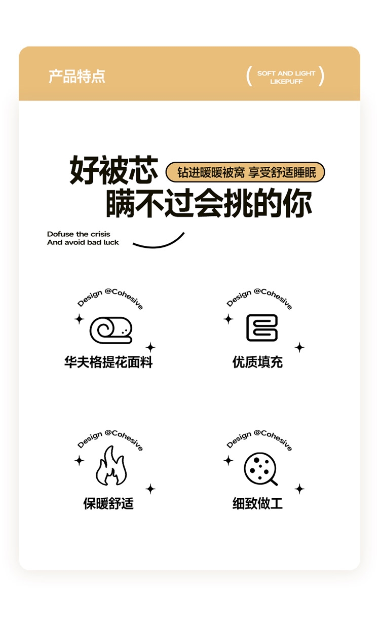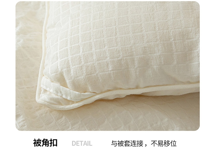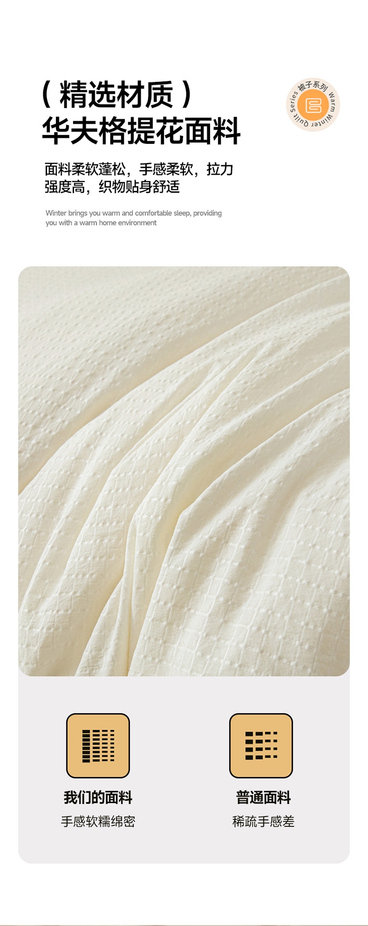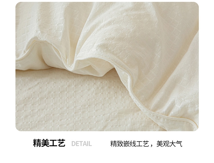 精选面料 : 精选优质华夫格提花面料,纤维柔软蓬松;选用被誉为“新世纪的健康舒适纤维”的A级大豆纤维;采用精致嵌线工艺与极简点绗绗缝工艺结合