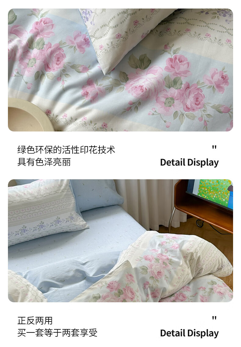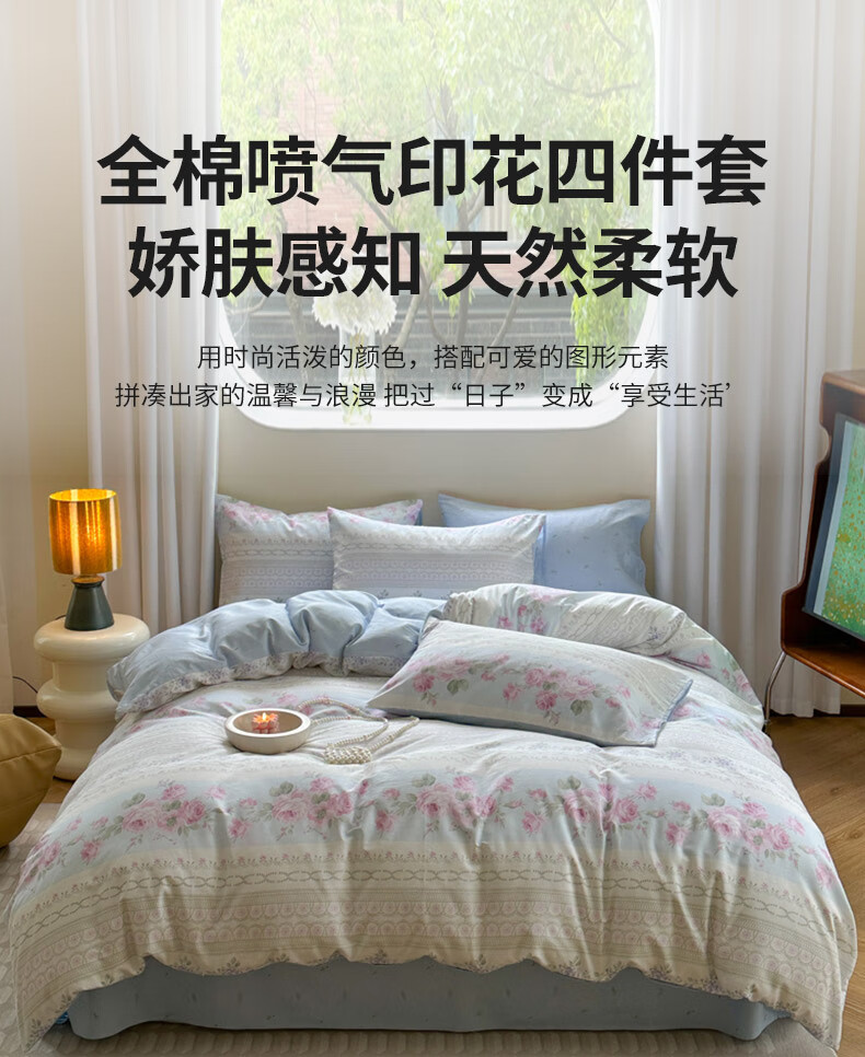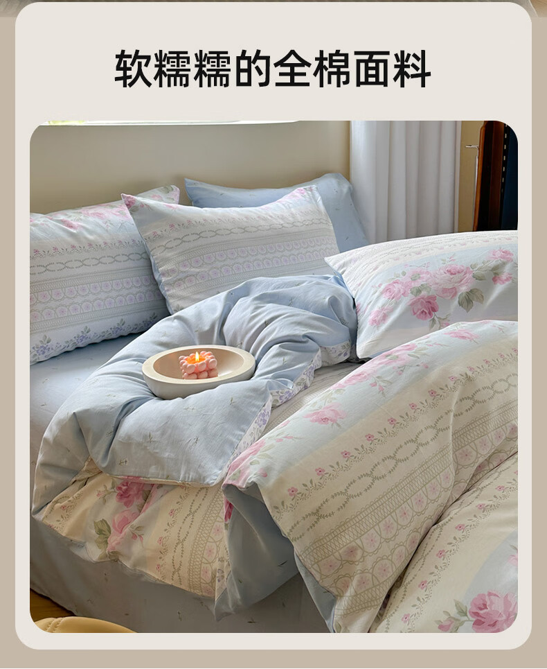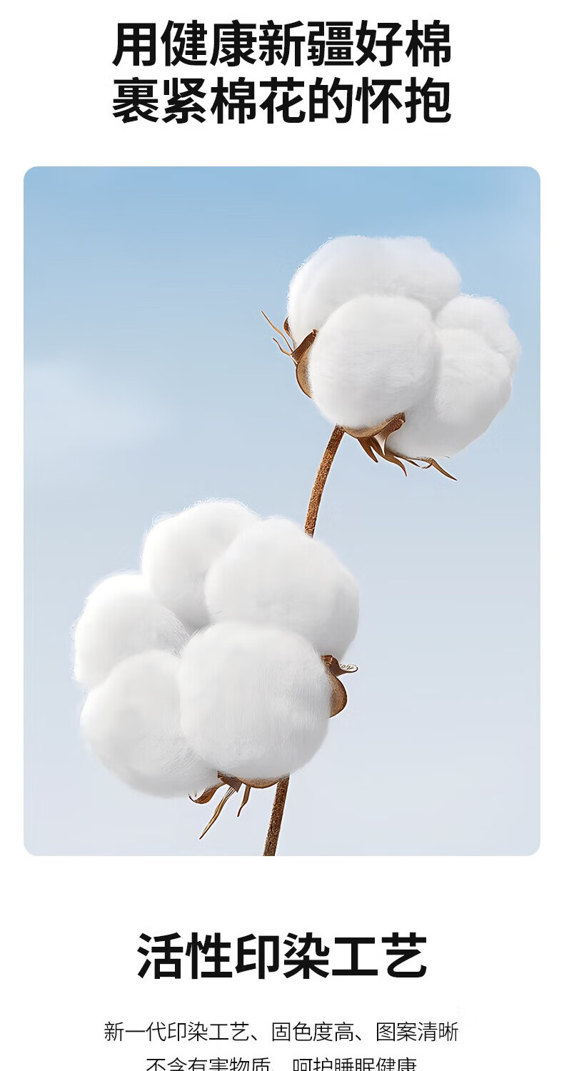 面料采用100%棉,喷气制造,高品质活性印花面料;绿色环保的活性印花技术,具有色泽亮丽,手感柔软细腻;实用后感觉温暖舒适,是您舒适家居生活的必备良品
