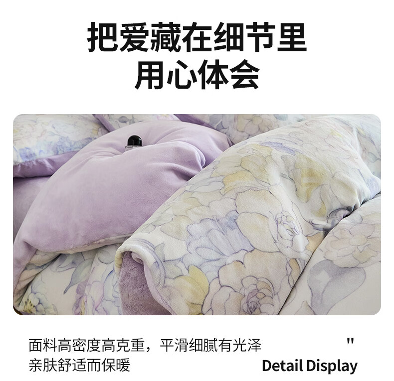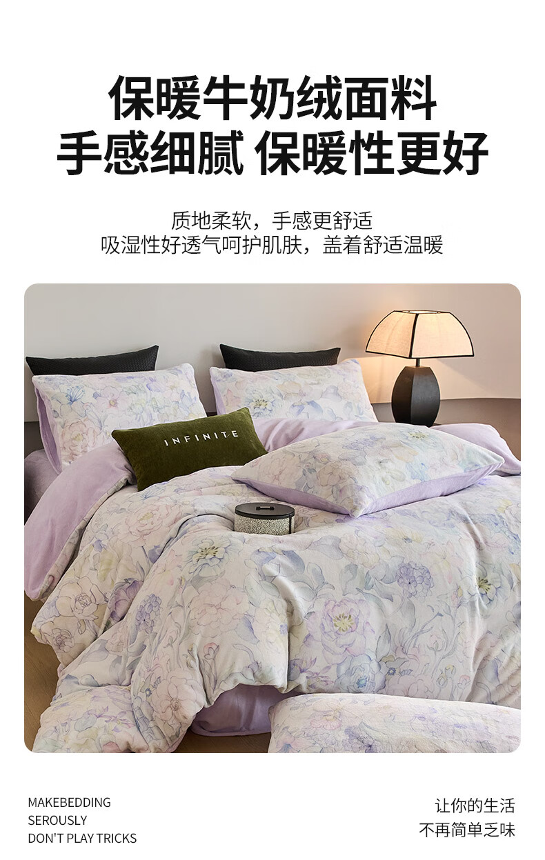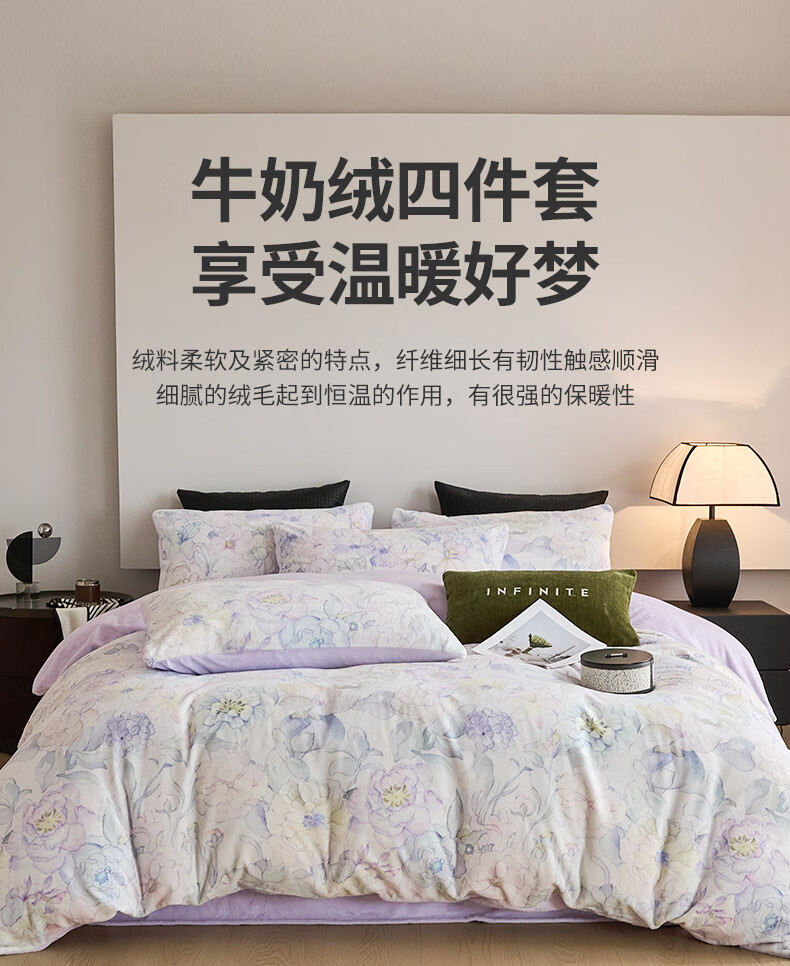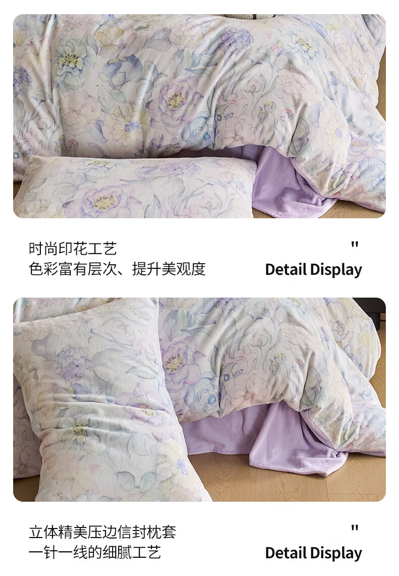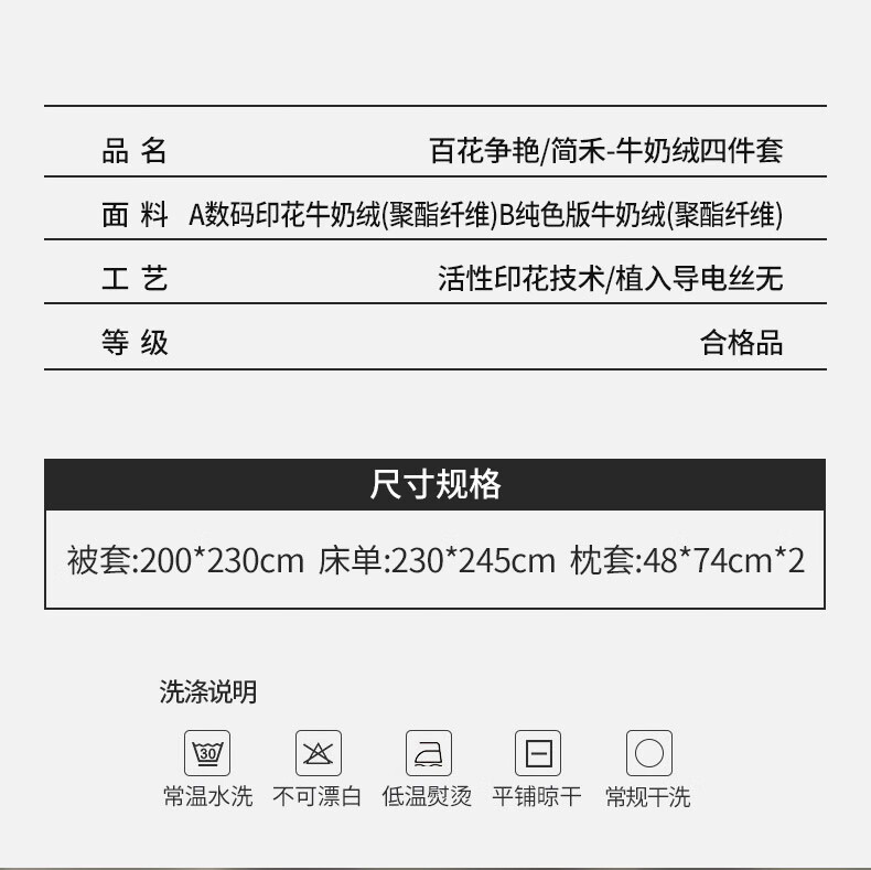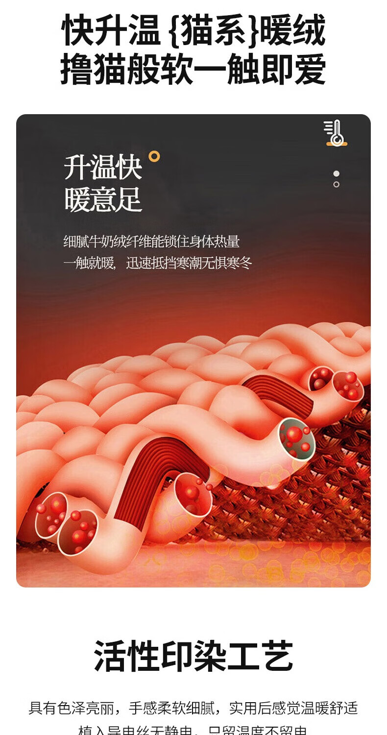 面料采用A类牛奶绒,恰到好处的温暖与柔软;色环保的活性印花技术,具有色泽亮丽,手感柔软细腻;实用后感觉温暖舒适,植入导电丝无静电,只留温度不留