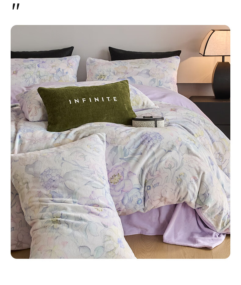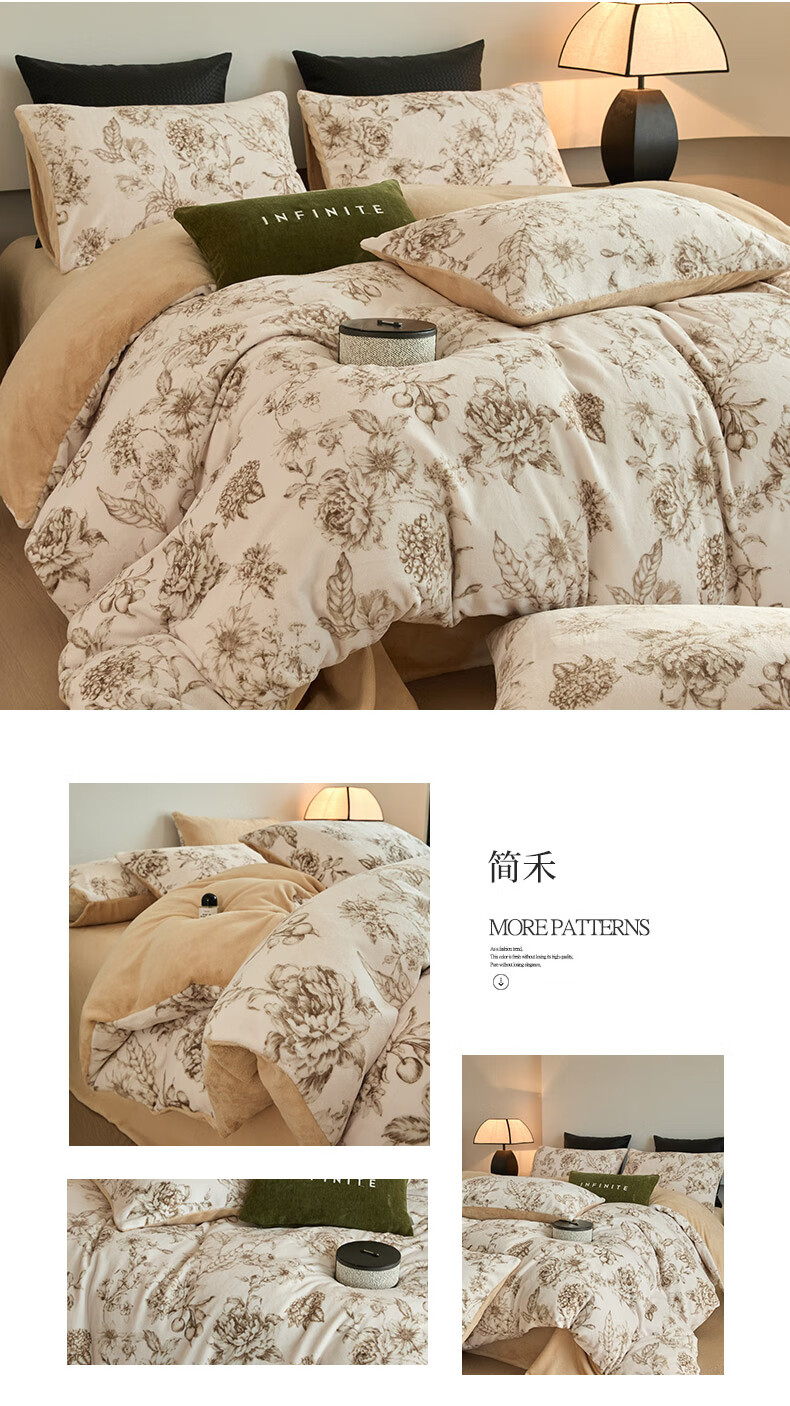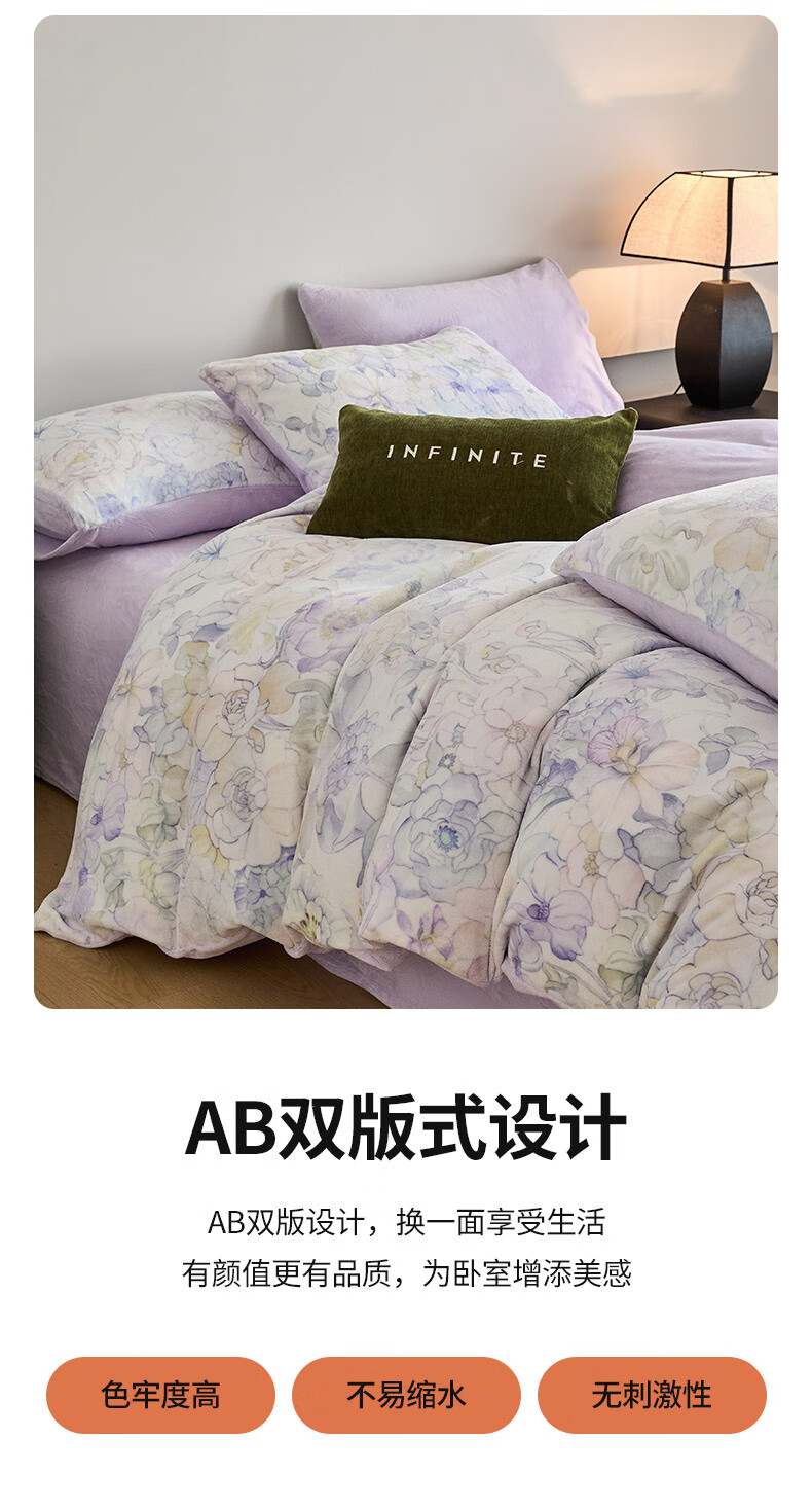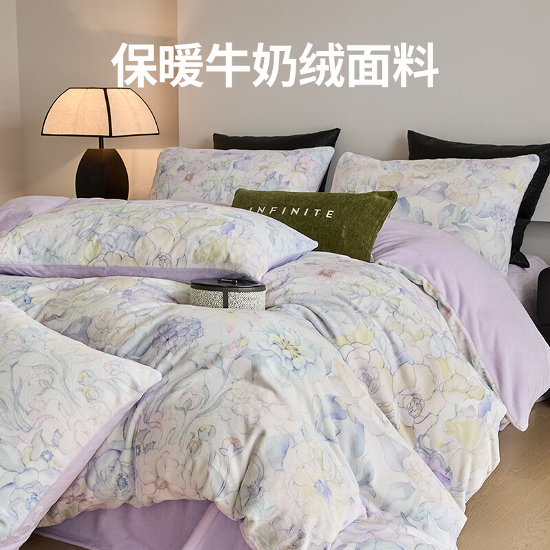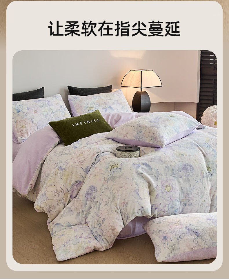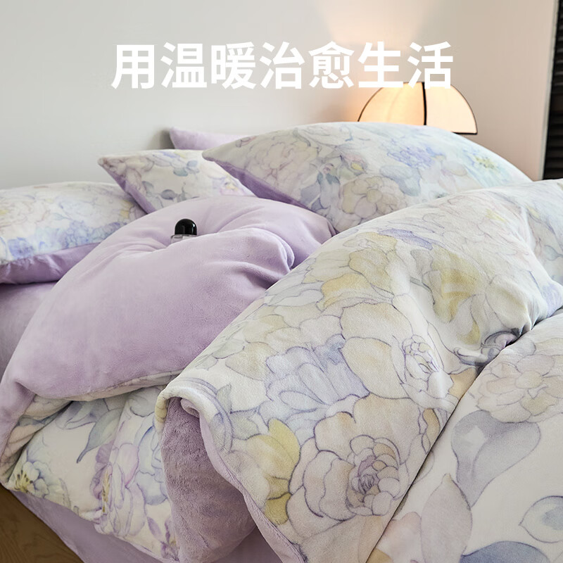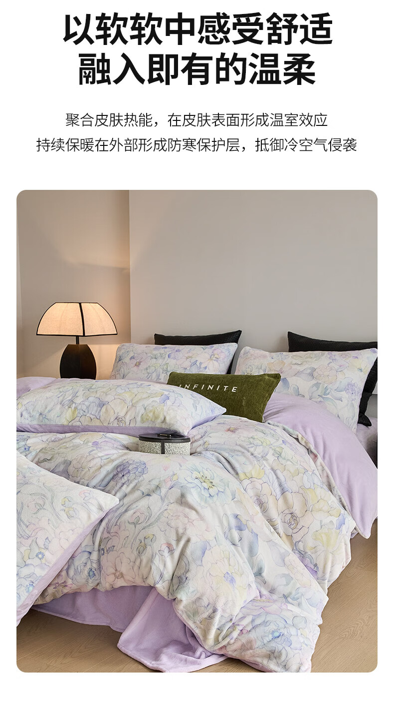面料采用A类牛奶绒,恰到好处的温暖与柔软;色环保的活性印花技术,具有色泽亮丽,手感柔软细腻;实用后感觉温暖舒适,植入导电丝无静电,只留温度不留