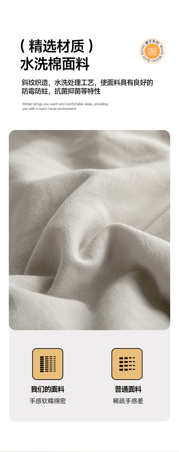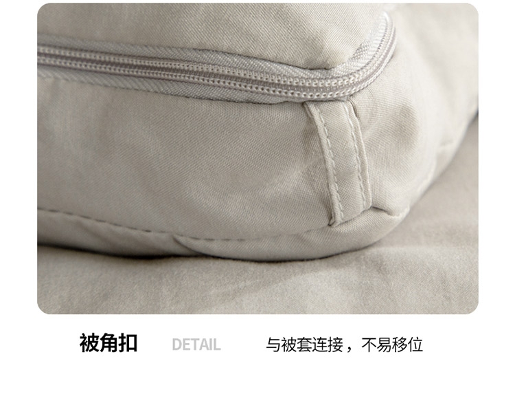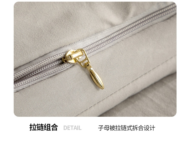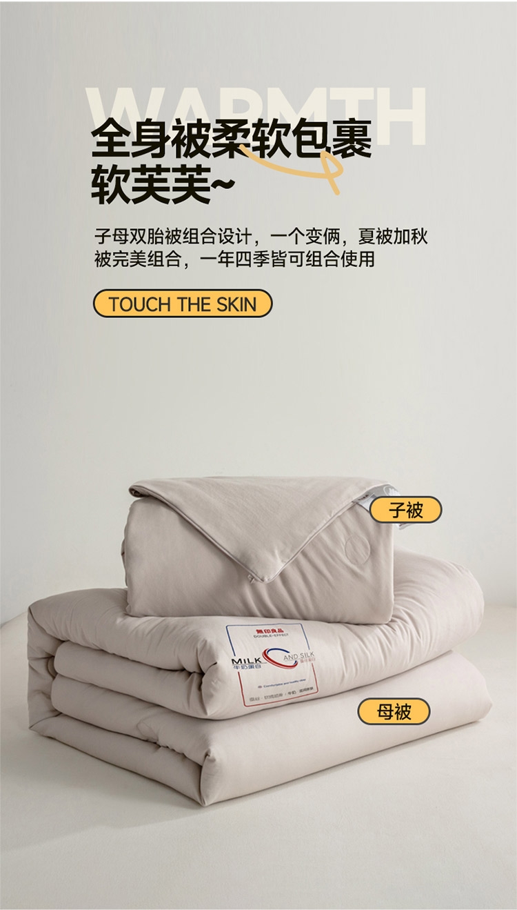采用优质水洗棉面料,斜纹织造,水洗处理工艺;填充选用A级蚕丝蛋白纤维与牛奶纤维混纺材料;子母双胎被组合设计,一个变俩,夏被加秋被完美组合