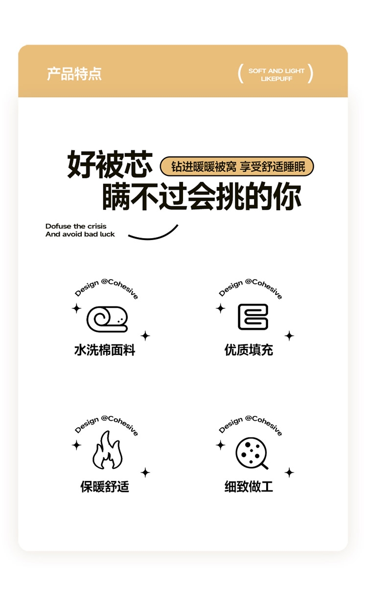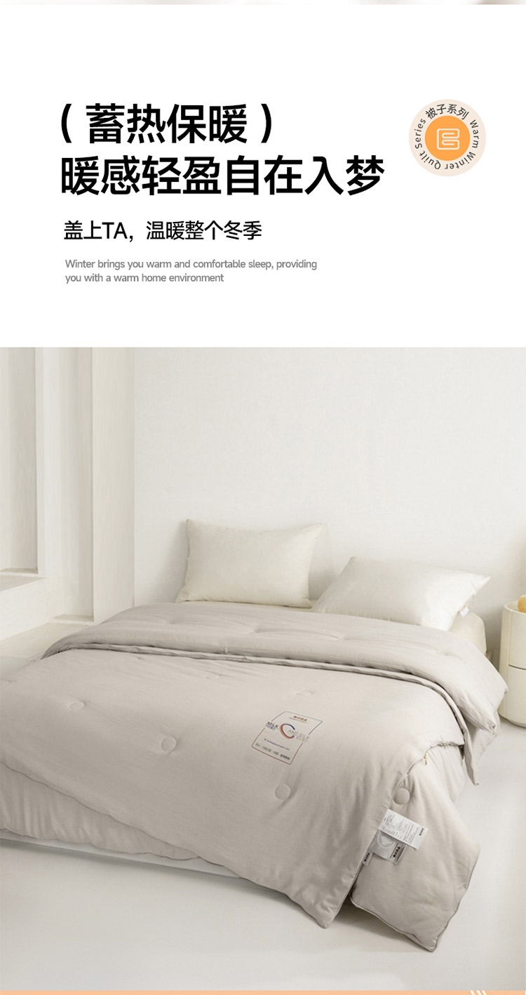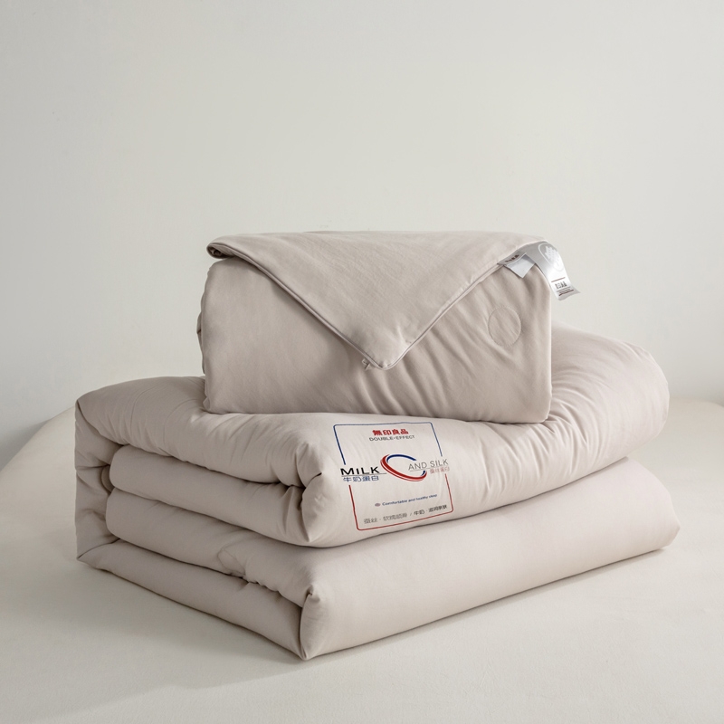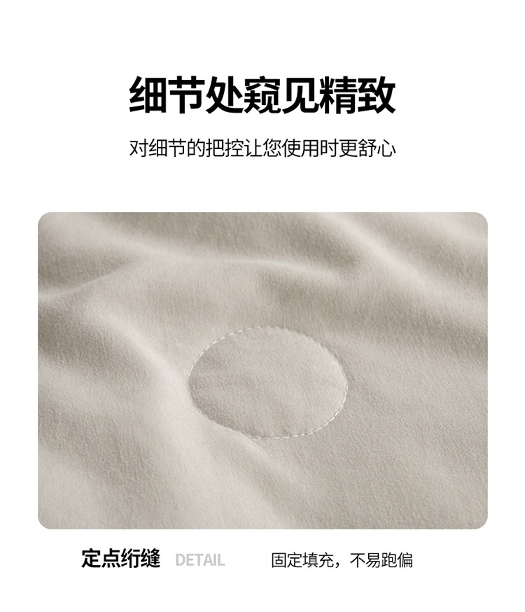 采用优质水洗棉面料,斜纹织造,水洗处理工艺;填充选用A级蚕丝蛋白纤维与牛奶纤维混纺材料;子母双胎被组合设计,一个变俩,夏被加秋被完美组合