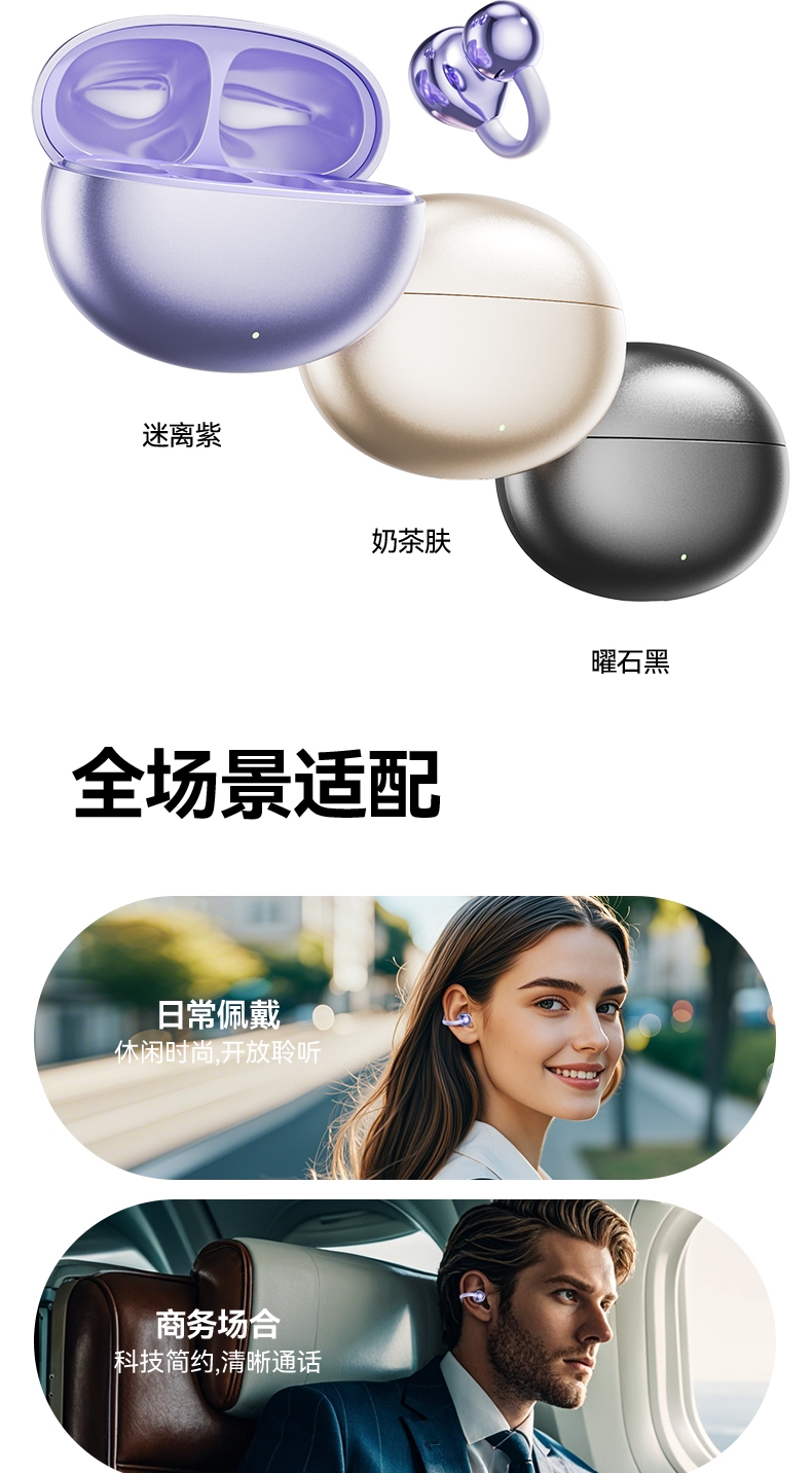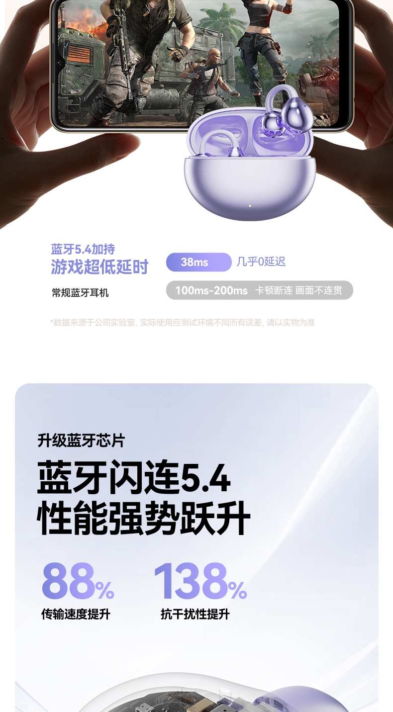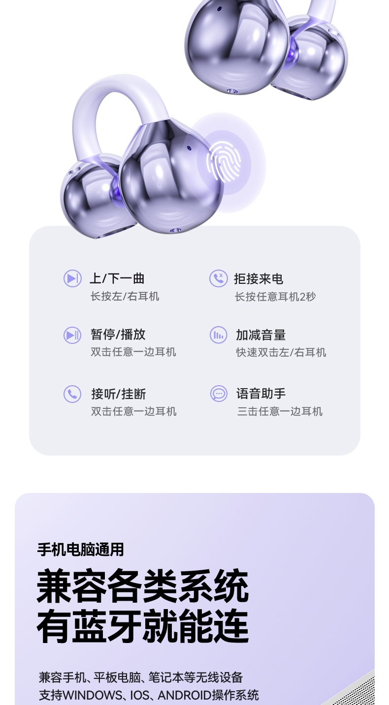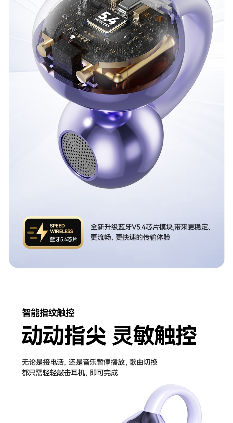 蓝牙5.4强大内芯 稳定不断连 ;智能指纹触控 触控随心;超轻耳夹 不入耳 真无感