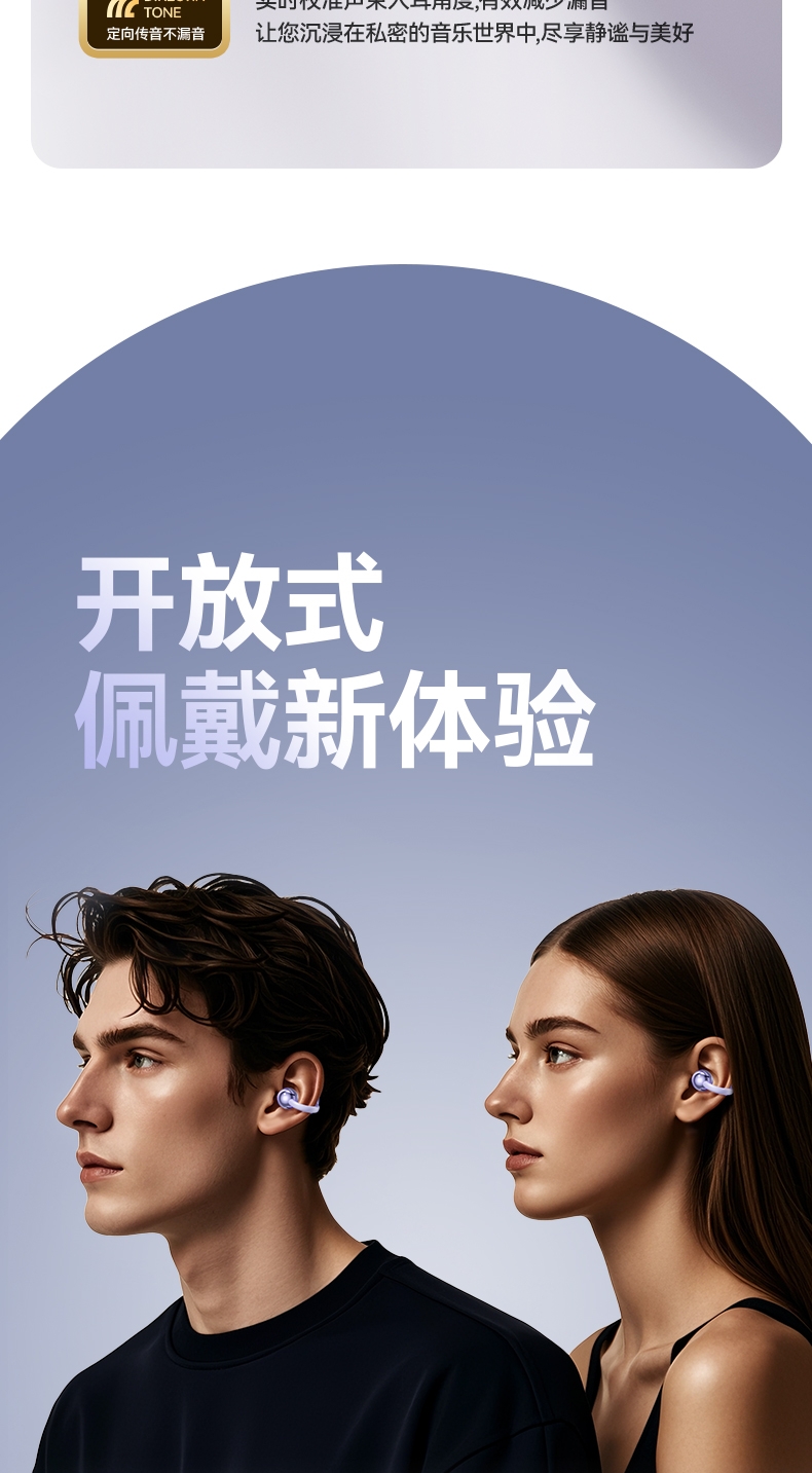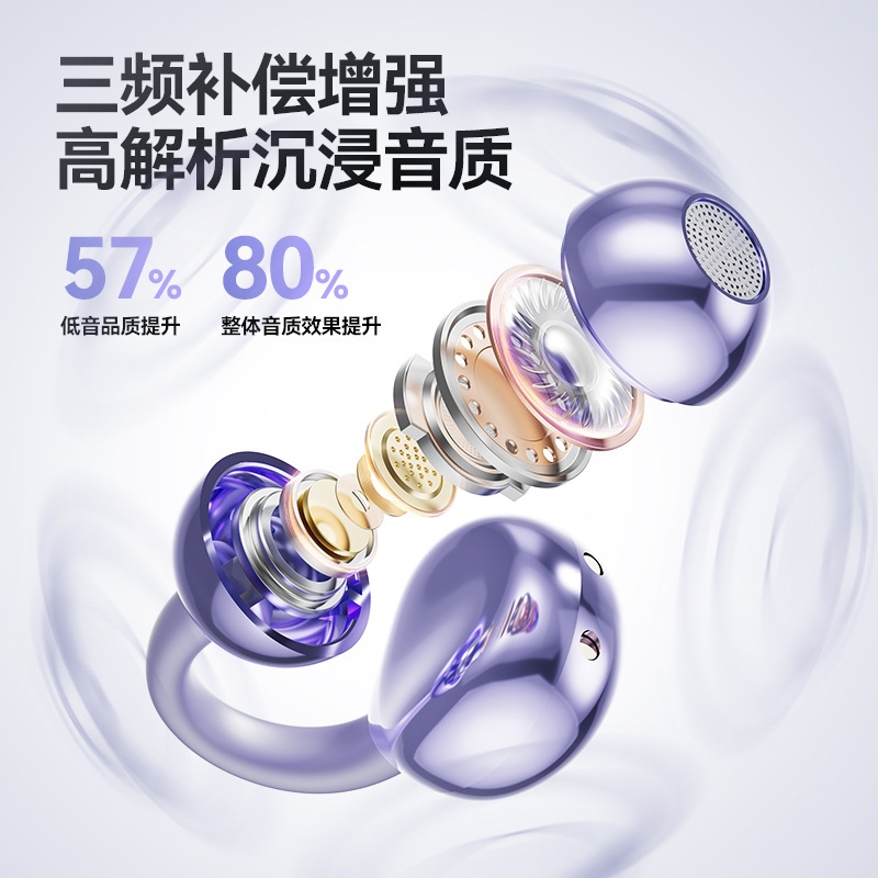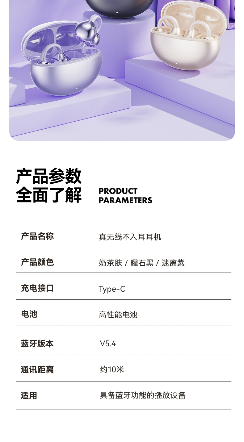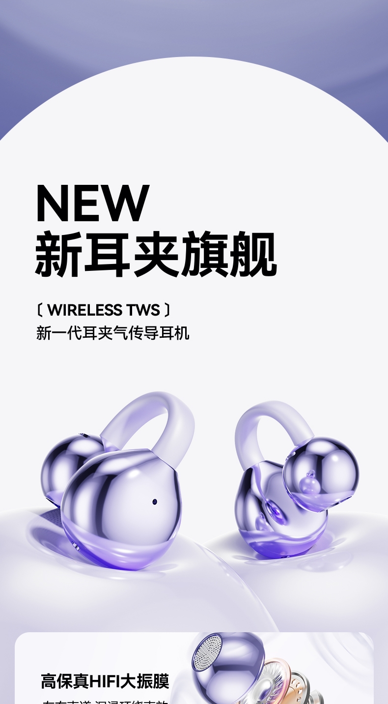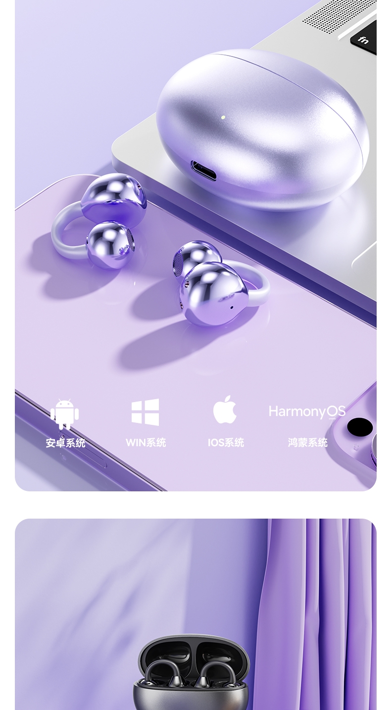 蓝牙5.4强大内芯 稳定不断连 ;智能指纹触控 触控随心;超轻耳夹 不入耳 真无感