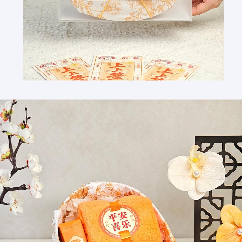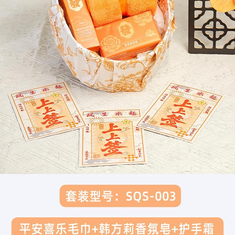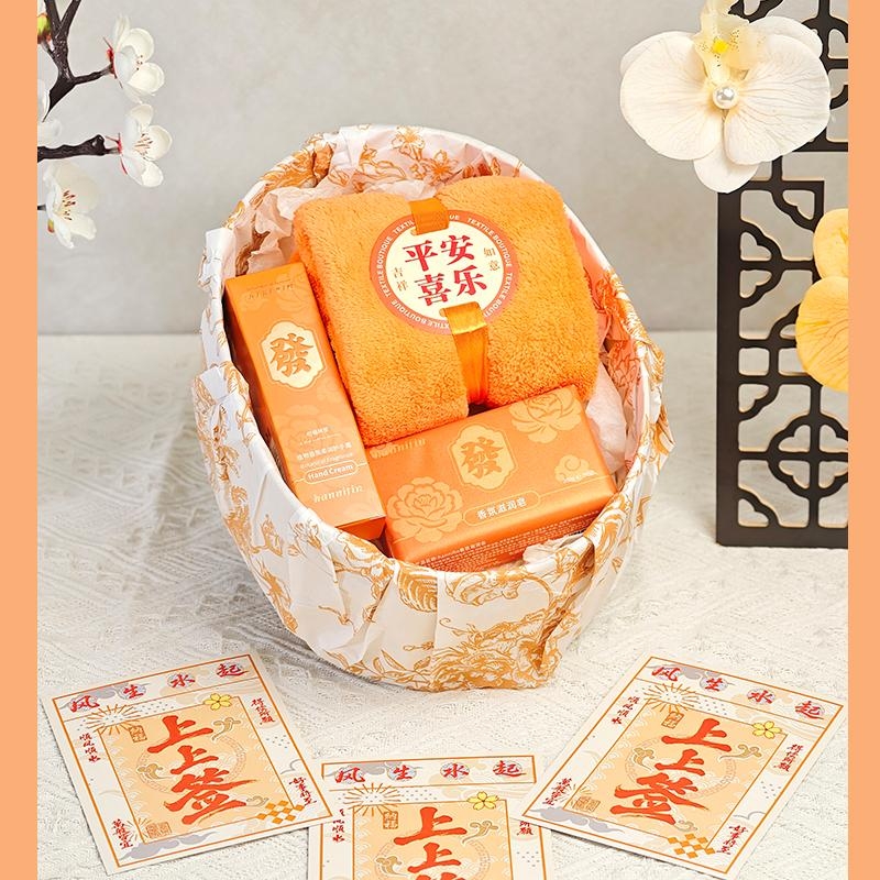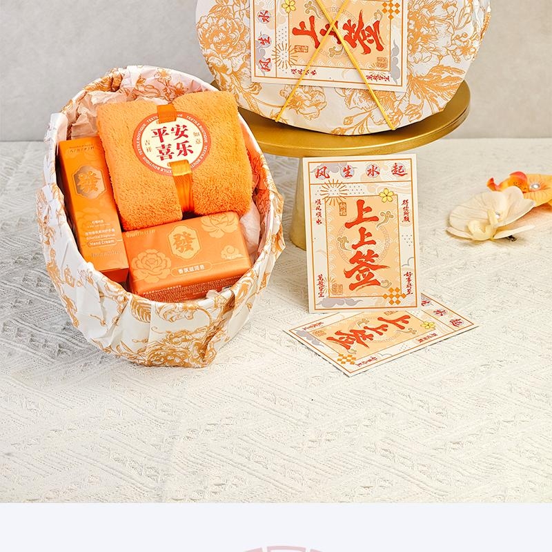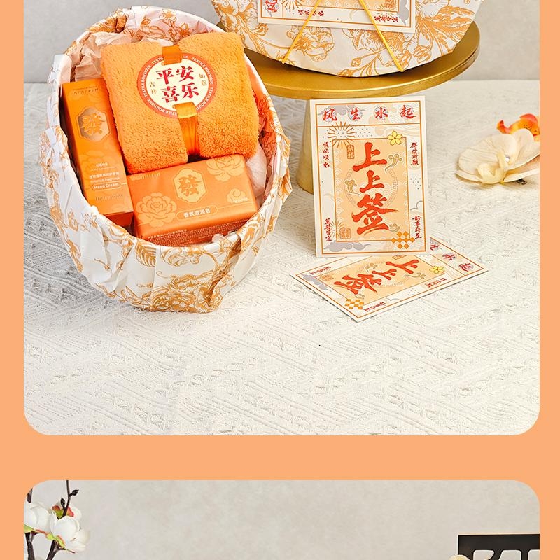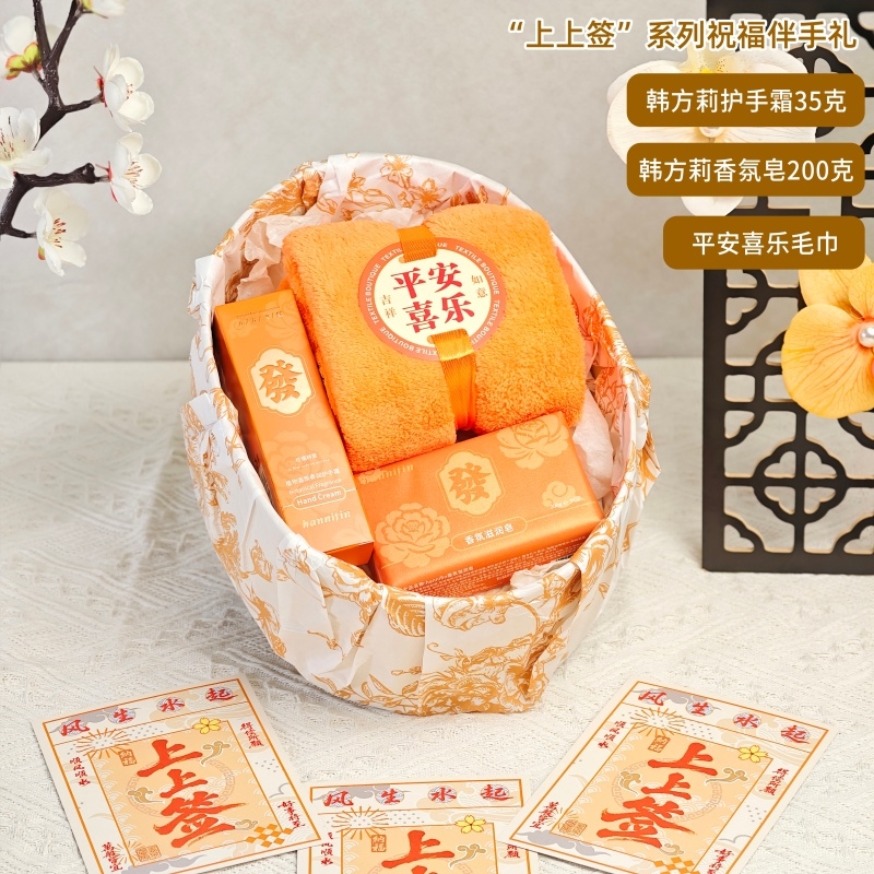 组合:平安喜乐毛巾、韩方莉香氛皂200克、韩方莉柔润护手霜35克、古风绑绳礼盒+上上签贺卡