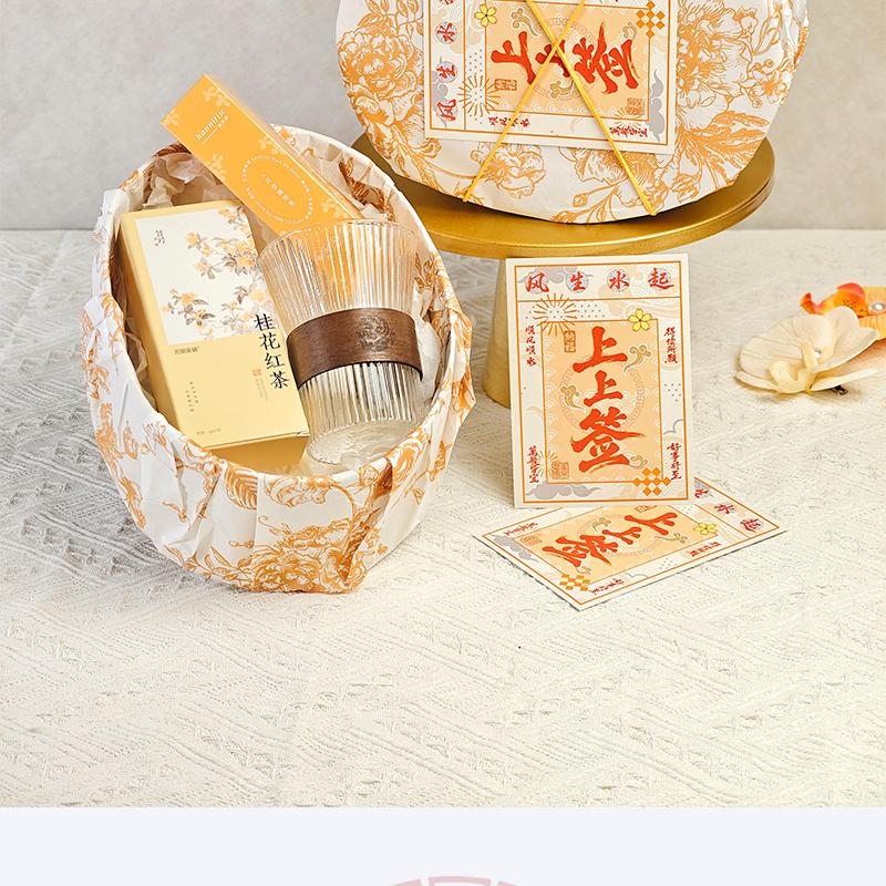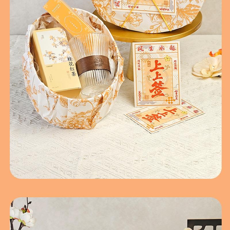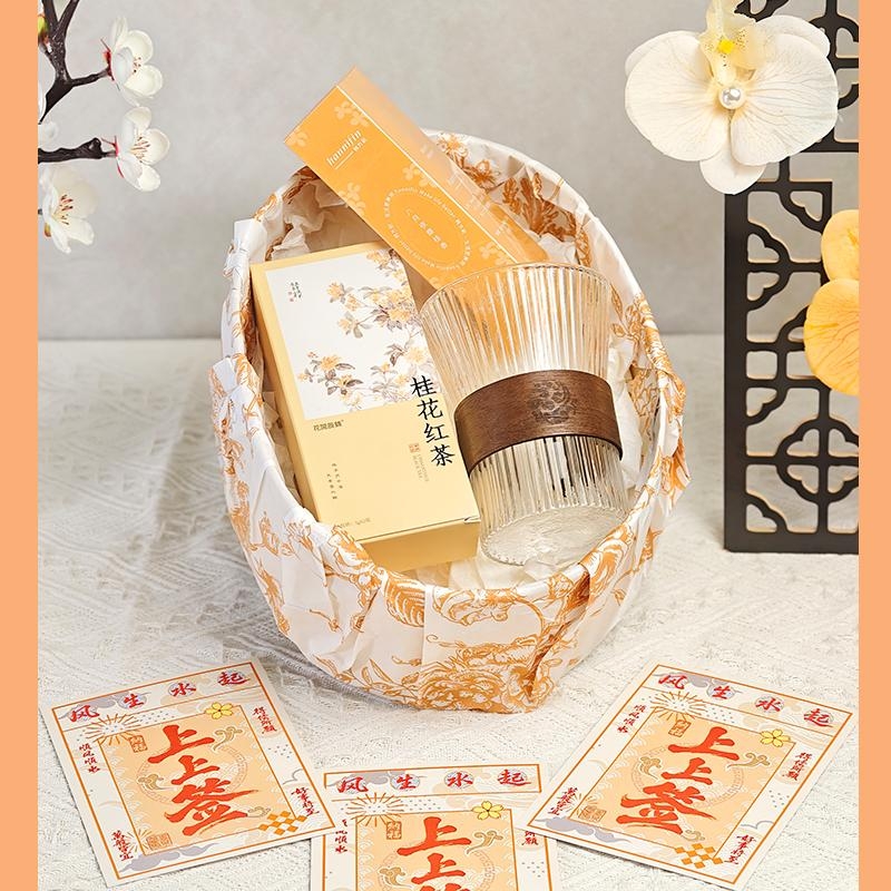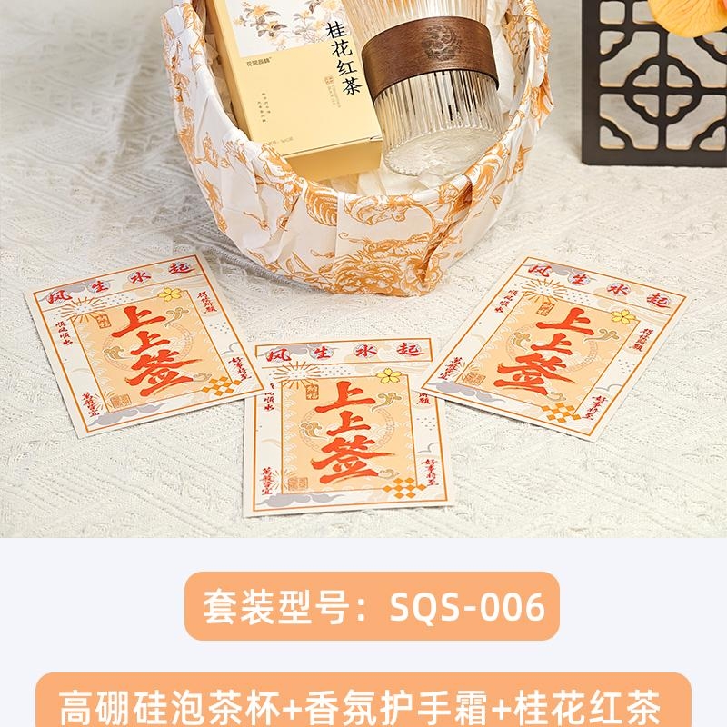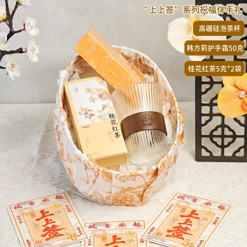 组合:高硼硅泡茶杯350ml、韩方莉香氛护手霜50克、花开辰锦桂花红茶5g*2袋、古风绑绳礼盒+上上签贺卡