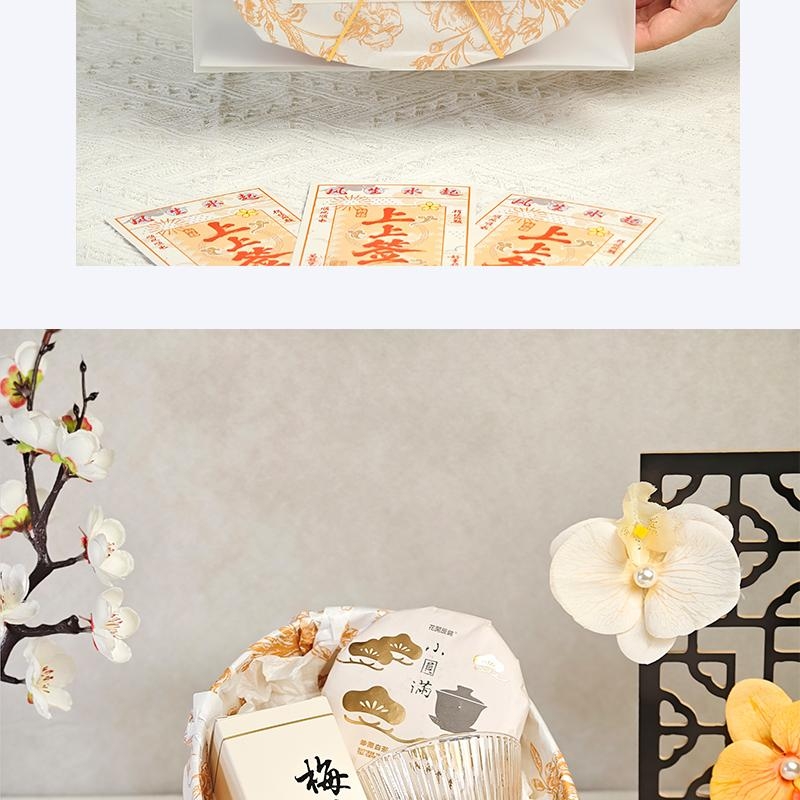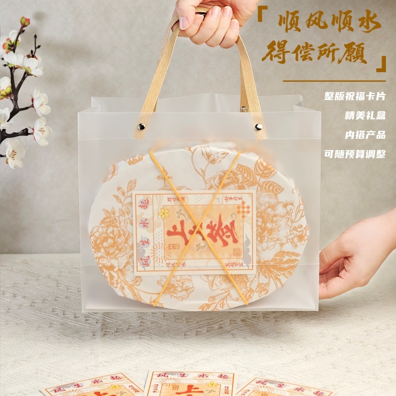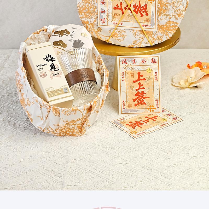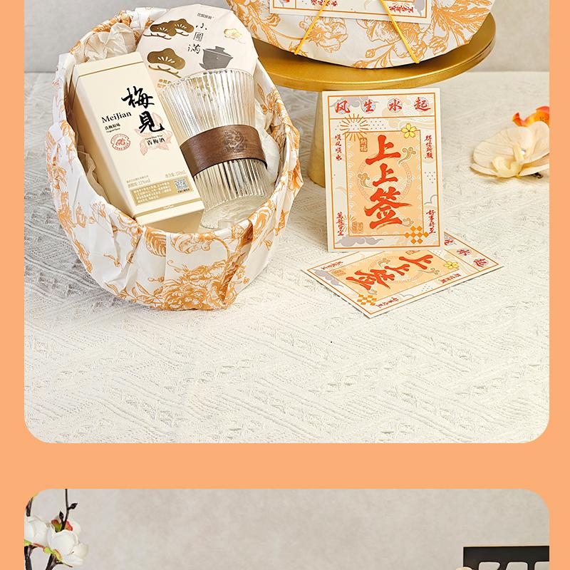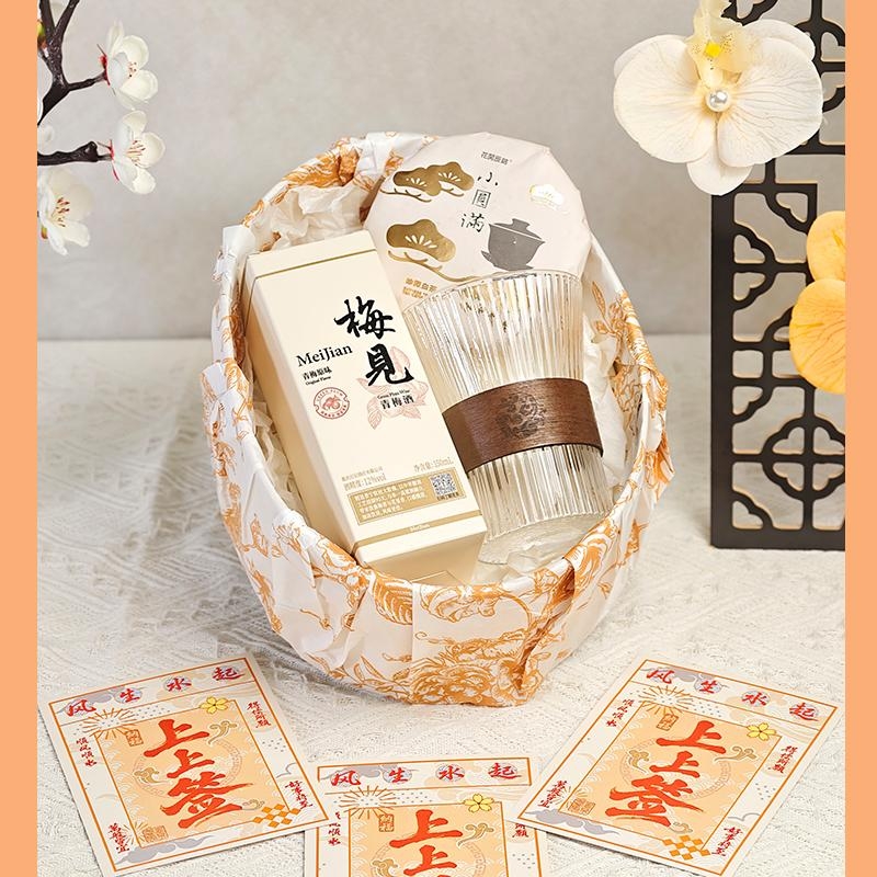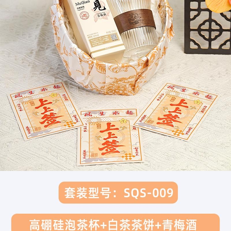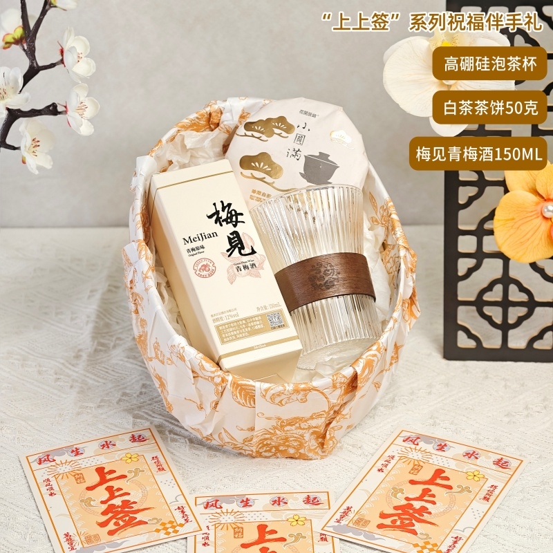 组合:高硼硅泡茶杯350ml、花开辰锦白茶茶饼50g、梅见青梅酒150ml、古风绑绳礼盒+上上签贺卡