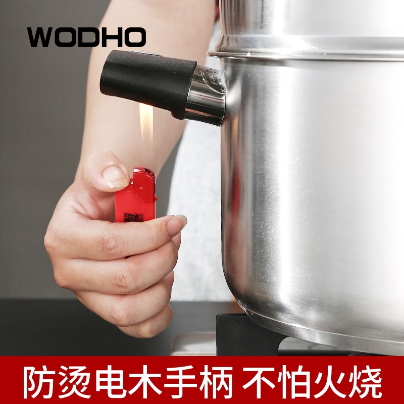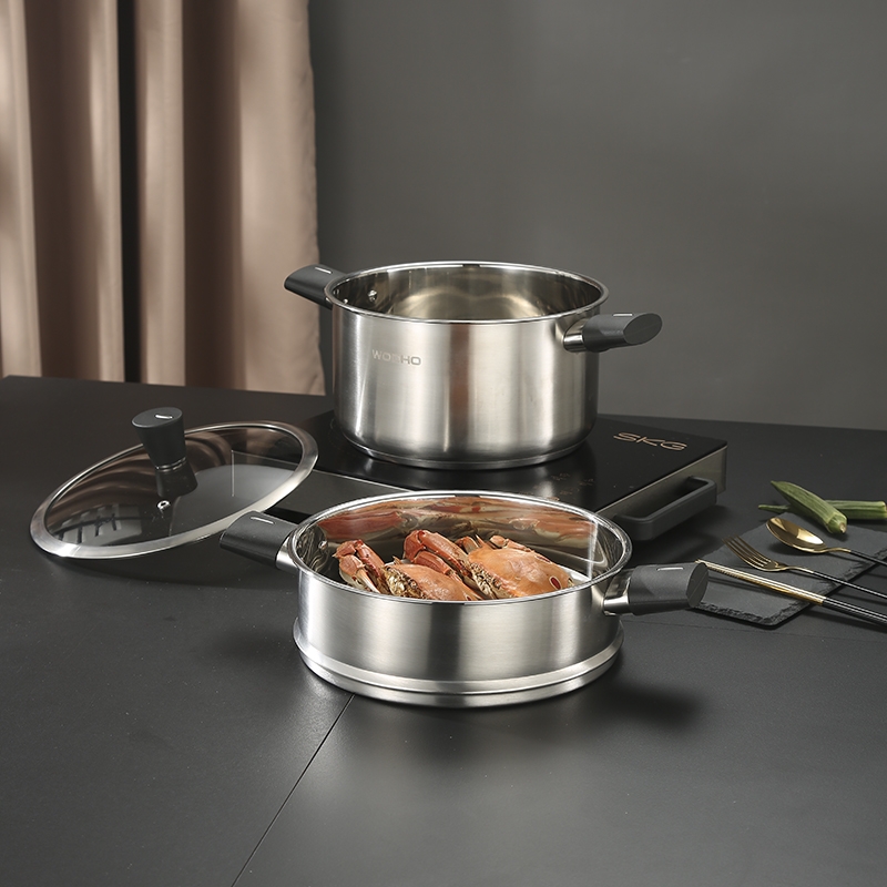 精选奥氏体304高品质不锈钢,三层加厚复合锅底,导;锅内部镜面亮光双工艺,无化学涂层,造型高雅,健康卫;全透明钢化宽边玻璃锅盖,耐热防裂,烹饪过程清晰可见